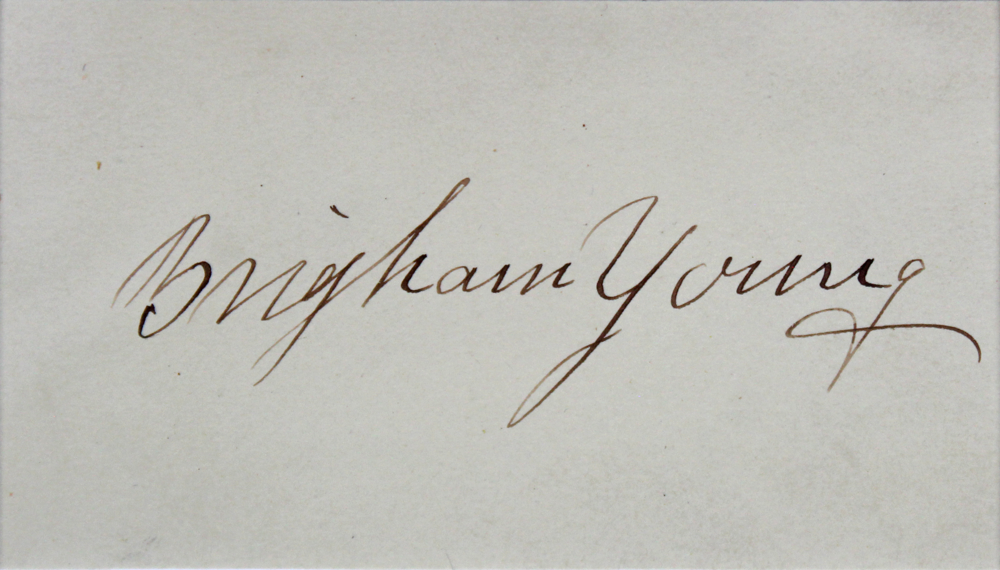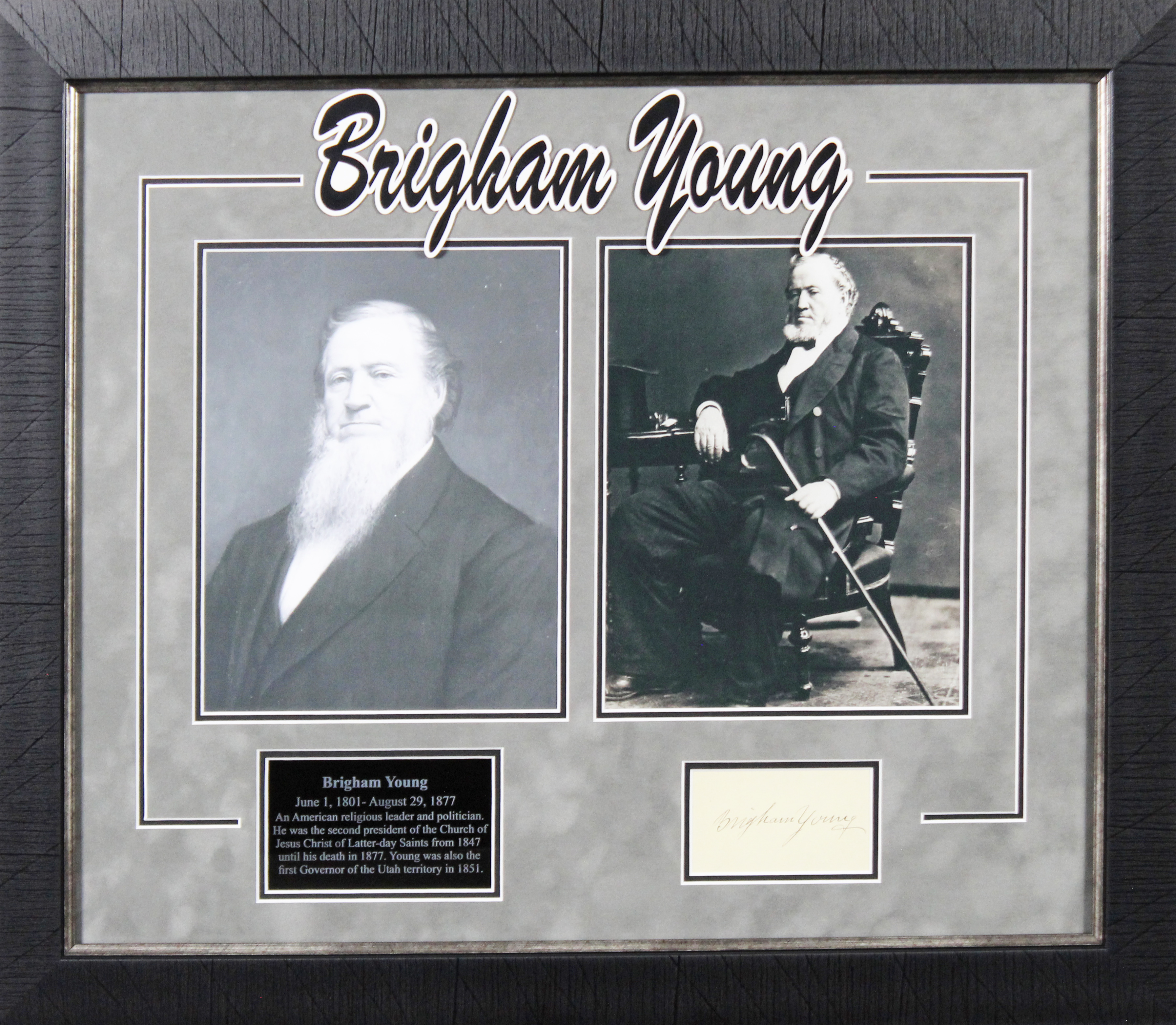 This Autographed & Framed 2x3.65 Cut Signature has been Personally Signed by Brigham Young. This item is 100% Authentic to include a Certificate of Authenticity (COA) / hologram by Beckett Authentication Services. The authenticity can be verified on Beckett Authentication Services website. This item has been professionally framed to overall dimensions of approximately 21.5 x 25.5 inches.