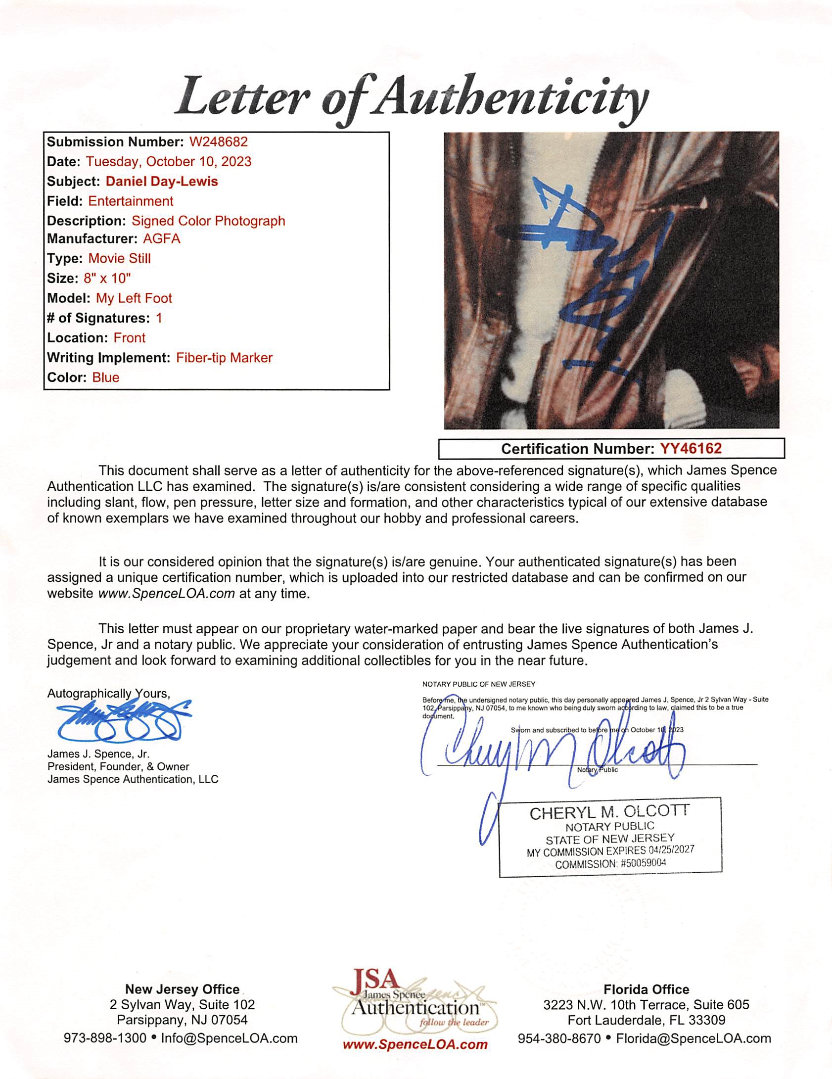 This Autographed 8x10 Photo has been Personally Signed by Daniel Day Lewis of My Left Foot. This item is 100% Authentic to include a Certificate of Authenticity (COA) / hologram by JSA. The authenticity can be verified on JSA website.