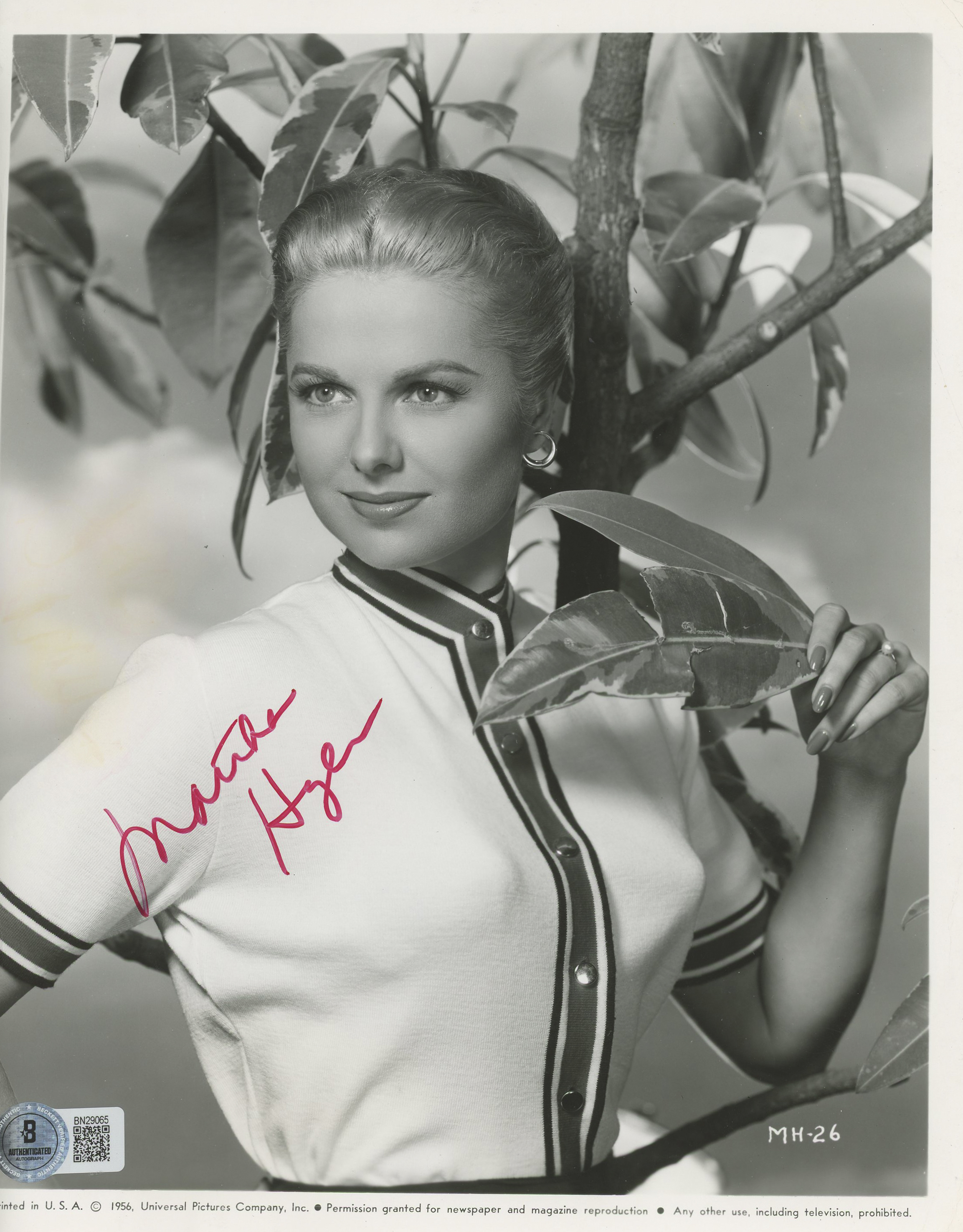 This Autographed 8x10 Photo has been Personally Signed by Martha Hyer of My Man Godfrey. This item is 100% Authentic to include a hologram by Beckett Authentication Services. This item will come with an affixed Beckett Authentication Services (BAS) authentication sticker, which includes a scannable QR code to verify authenticity. Please note that Beckett no longer provides serial-numbered COA cards, and the attached BAS sticker will serve as the complete authentication for this item. The authenticity can be verified on Beckett Authentication Services website.