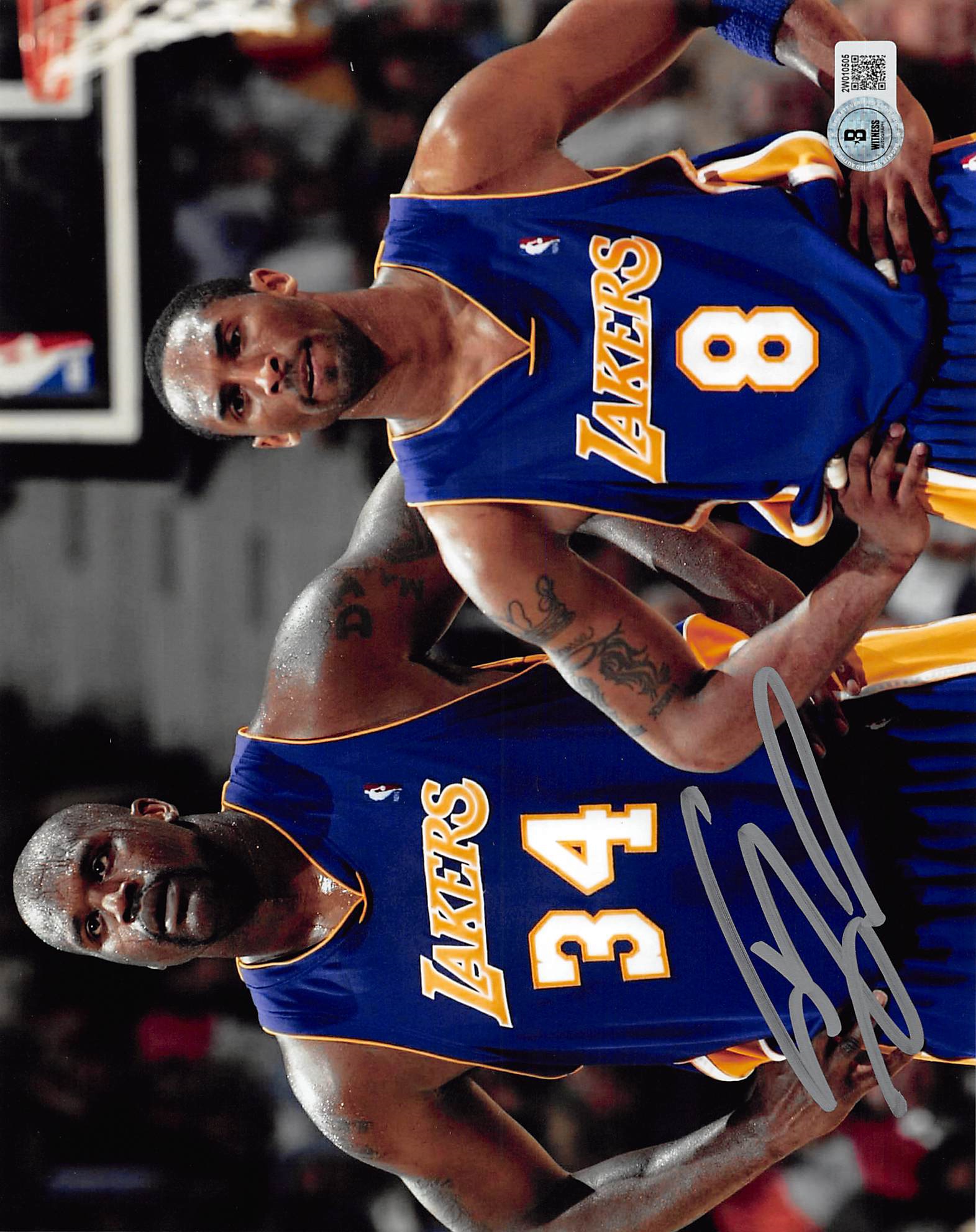 This Autographed Horizontal Purple Jersey w/ Kobe 8x10 Photo has been Personally Signed by Shaquille O'Neal of the Los Angeles Lakers. This item is 100% Authentic to include a hologram by Beckett Authentication Services. This item will come with an affixed Beckett Authentication Services (BAS) authentication sticker, which includes a scannable QR code to verify authenticity. Please note that Beckett no longer provides serial-numbered COA cards, and the attached BAS sticker will serve as the complete authentication for this item. This is a BAS Witnessed Protection Program item which means a Beckett Authentication Service representative was present when this item was being signed. We conducted an autograph signing with Shaquille O'Neal where multiples of the same item were signed. While the photographs are representative of this item, the size, placement and strength of the signature may vary. Each item is hand signed, therefore, each autograph is unique. This item can be verified through BAS Witnessed.