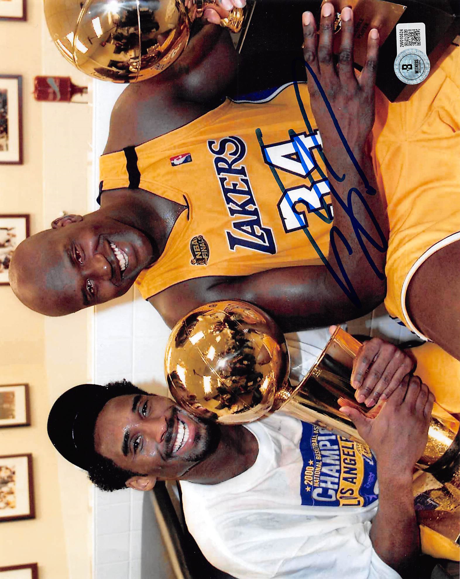 This Autographed Horizontal Trophy w/ Kobe 8x10 Photo has been Personally Signed by Shaquille O'Neal of the Los Angeles Lakers. This item is 100% Authentic to include a hologram by Beckett Authentication Services. This item will come with an affixed Beckett Authentication Services (BAS) authentication sticker, which includes a scannable QR code to verify authenticity. Please note that Beckett no longer provides serial-numbered COA cards, and the attached BAS sticker will serve as the complete authentication for this item. This is a BAS Witnessed Protection Program item which means a Beckett Authentication Service representative was present when this item was being signed. We conducted an autograph signing with Shaquille O'Neal where multiples of the same item were signed. While the photographs are representative of this item, the size, placement and strength of the signature may vary. Each item is hand signed, therefore, each autograph is unique. This item can be verified through BAS Witnessed.