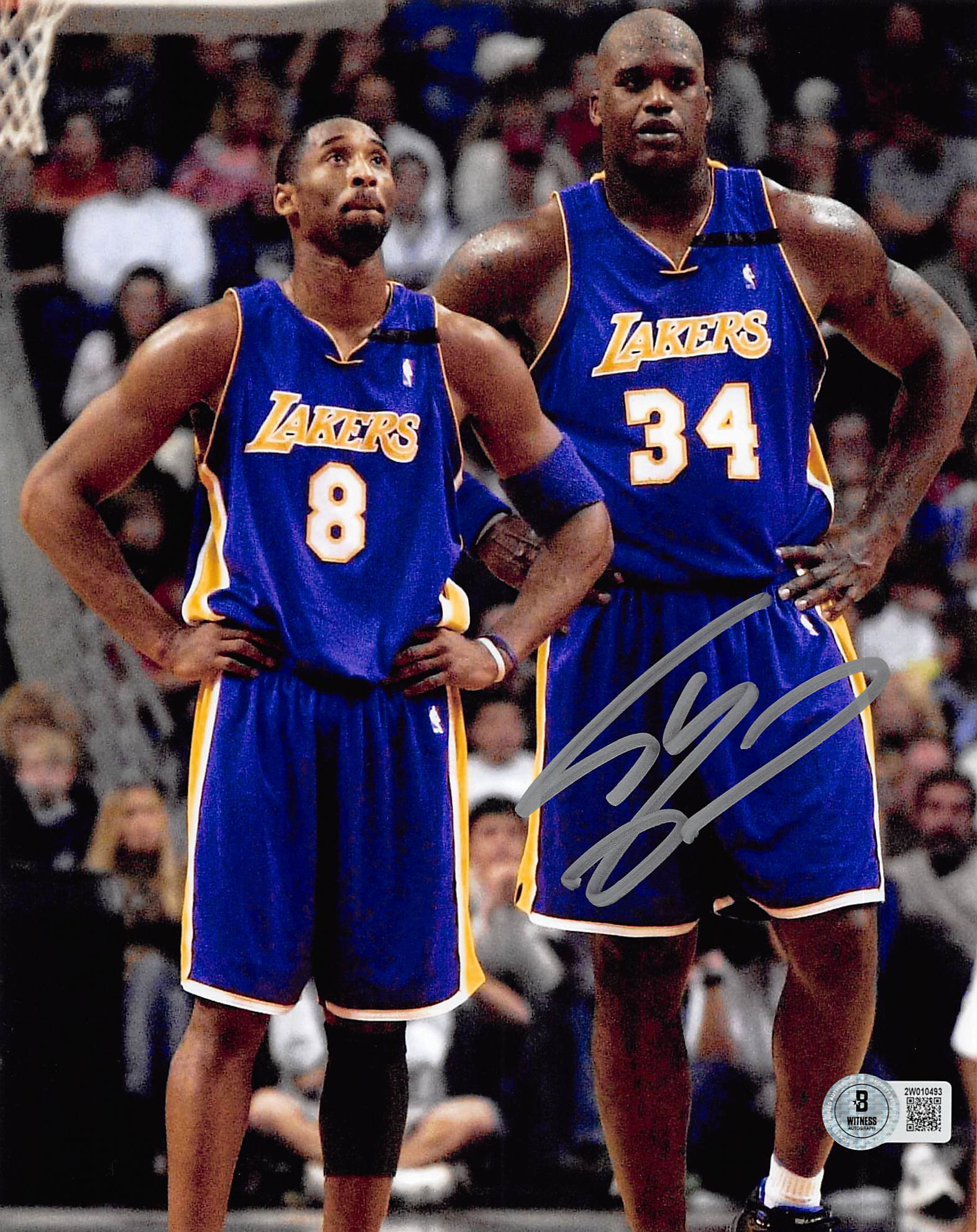 This Autographed Vertical Purple Jersey 8x10 Photo has been Personally Signed by Shaquille O'Neal of the Los Angeles Lakers. This item is 100% Authentic to include a hologram by Beckett Authentication Services. This item will come with an affixed Beckett Authentication Services (BAS) authentication sticker, which includes a scannable QR code to verify authenticity. Please note that Beckett no longer provides serial-numbered COA cards, and the attached BAS sticker will serve as the complete authentication for this item. This is a BAS Witnessed Protection Program item which means a Beckett Authentication Service representative was present when this item was being signed. We conducted an autograph signing with Shaquille O'Neal where multiples of the same item were signed. While the photographs are representative of this item, the size, placement and strength of the signature may vary. Each item is hand signed, therefore, each autograph is unique. This item can be verified through BAS Witnessed.