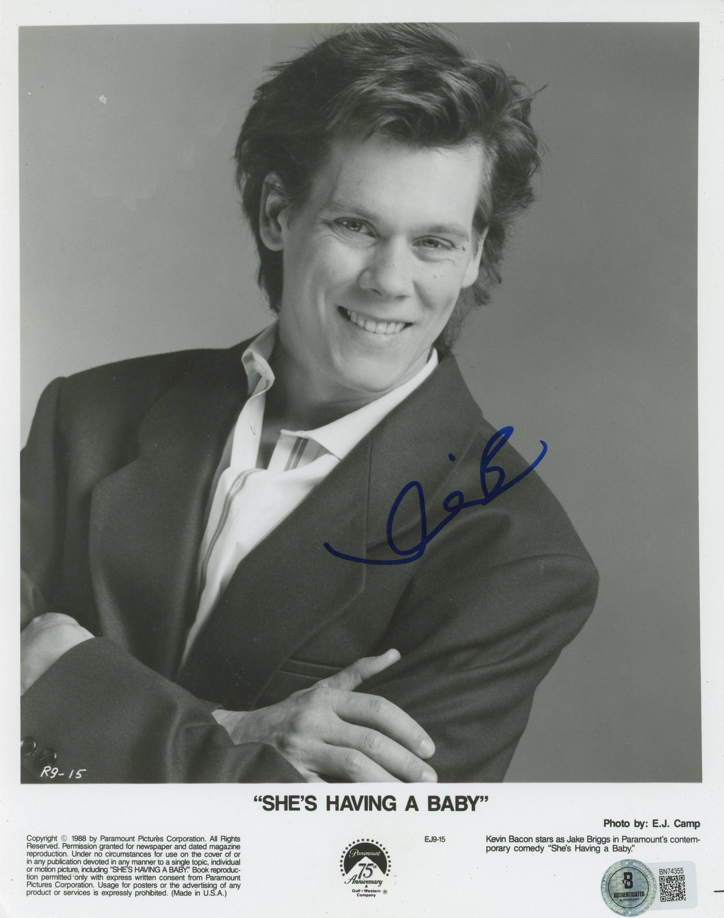 This Autographed 8x10 Photo has been Personally Signed by Kevin Bacon of She's Having A Baby. This item is 100% Authentic to include a hologram by Beckett Authentication Services. This item will come with an affixed Beckett Authentication Services (BAS) authentication sticker, which includes a scannable QR code to verify authenticity. Please note that Beckett no longer provides serial-numbered COA cards, and the attached BAS sticker will serve as the complete authentication for this item. The authenticity can be verified on Beckett Authentication Services website.