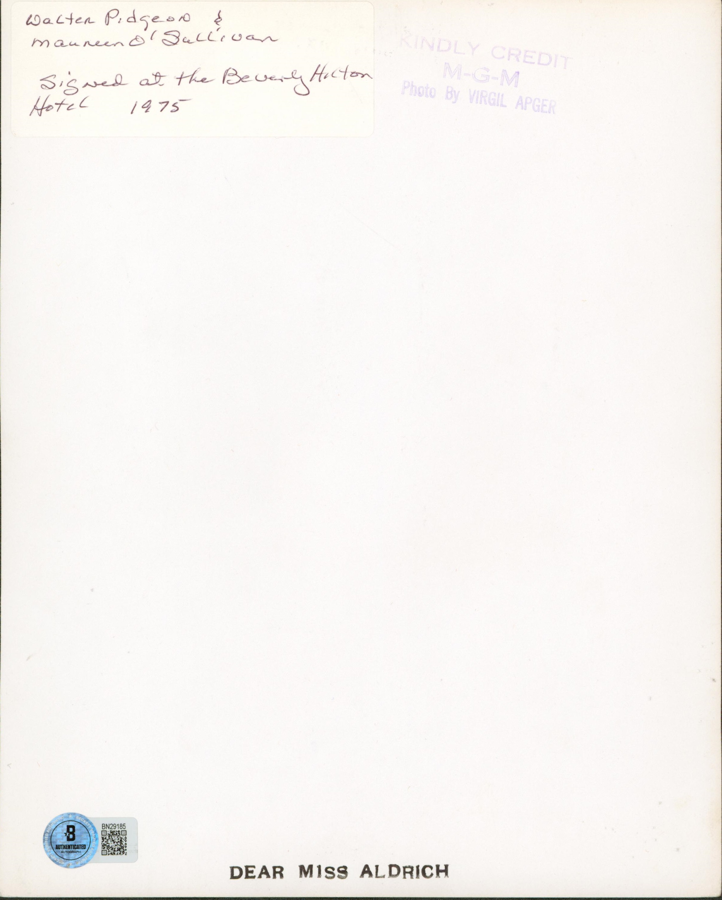This Autographed 8x10 Photo has been Personally Signed by Walter Pidgeon & Maureen O'Sullivan of Three Cheers for Love. This item is 100% Authentic to include a hologram by Beckett Authentication Services. This item will come with an affixed Beckett Authentication Services (BAS) authentication sticker, which includes a scannable QR code to verify authenticity. Please note that Beckett no longer provides serial-numbered COA cards, and the attached BAS sticker will serve as the complete authentication for this item. The authenticity can be verified on Beckett Authentication Services website.