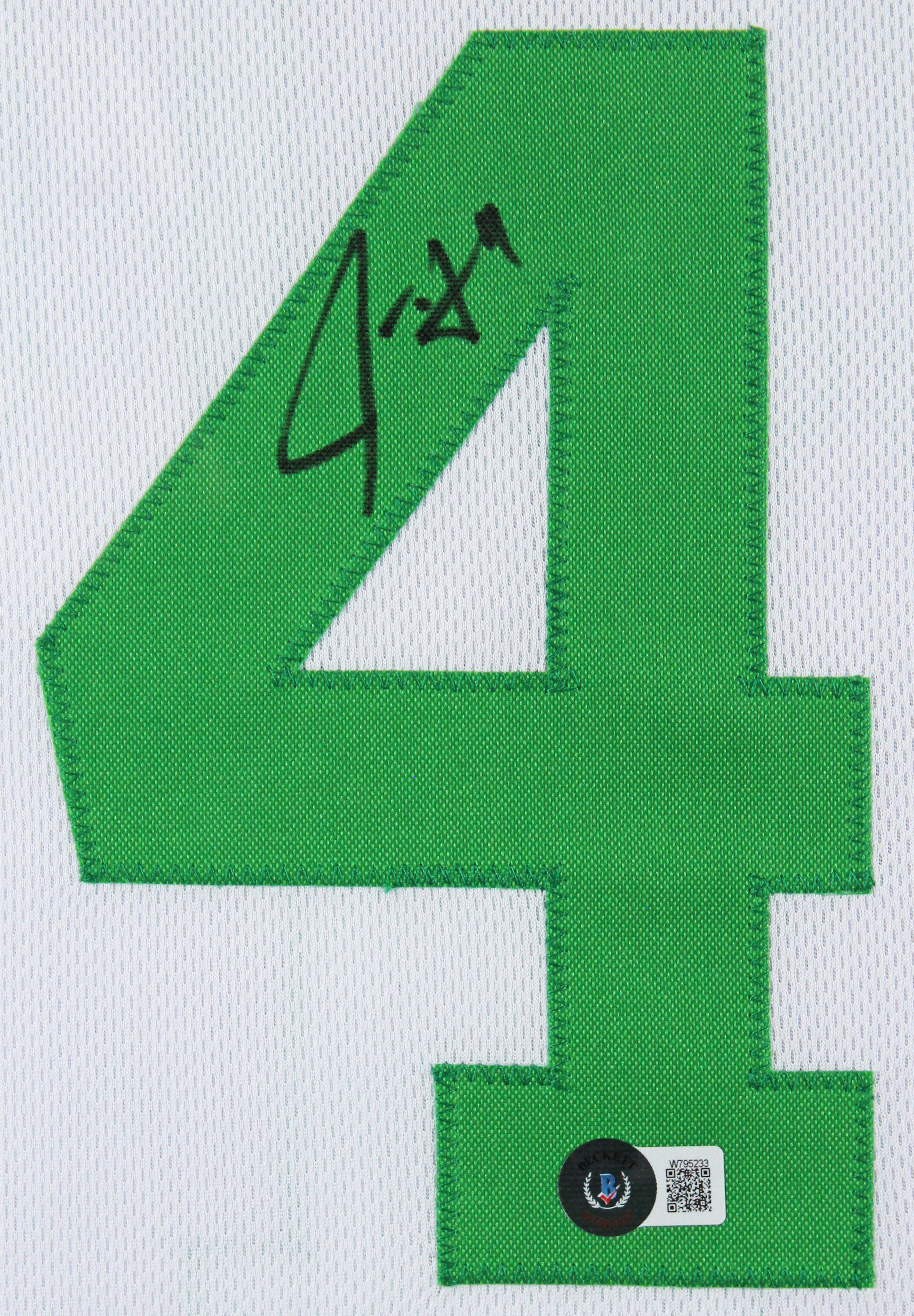 This Autographed White Pro Style Framed Jersey has been Personally Signed by Jrue Holiday of the Boston Celtics. This item is 100% Authentic to include a hologram by Beckett Authentication Services. This item will come with an affixed Beckett Authentication Services (BAS) authentication sticker, which includes a scannable QR code to verify authenticity. Please note that Beckett no longer provides serial-numbered COA cards, and the attached BAS sticker will serve as the complete authentication for this item. This is a BAS Witnessed Protection Program item which means a Beckett Authentication Service representative was present when this item was being signed. We conducted an autograph signing with Jrue Holiday where multiples of the same item were signed. While the photographs are representative of this item, the size, placement and strength of the signature may vary. Each item is hand signed, therefore, each autograph is unique. This item can be verified through BAS Witnessed. This item has been professionally framed to overall dimensions of approximately 32 x 37 inches. This is a X-Large sized, non-branded, custom-stitched Framed Jersey. These jerseys are framed to order, it takes approximately 3-4 business days for framing to be completed.