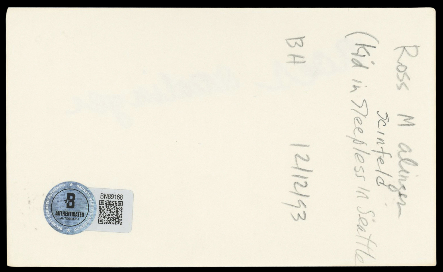 This Autographed 3x5 Index Card has been Personally Signed by Ross Malinger of Sleepless In Seattle. This item is 100% Authentic to include a hologram by Beckett Authentication Services. This item will come with an affixed Beckett Authentication Services (BAS) authentication sticker, which includes a scannable QR code to verify authenticity. Please note that Beckett no longer provides serial-numbered COA cards, and the attached BAS sticker will serve as the complete authentication for this item. The authenticity can be verified on Beckett Authentication Services website.