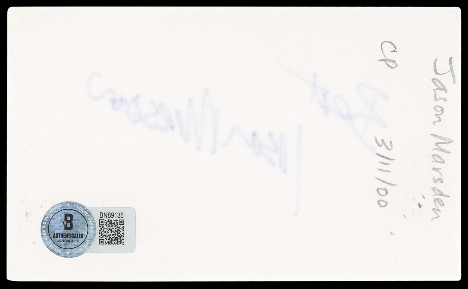 This Autographed 3x5 Index Card with the inscription of "Best" has been Personally Signed by Jason Marsden of X-Men. This item is 100% Authentic to include a hologram by Beckett Authentication Services. This item will come with an affixed Beckett Authentication Services (BAS) authentication sticker, which includes a scannable QR code to verify authenticity. Please note that Beckett no longer provides serial-numbered COA cards, and the attached BAS sticker will serve as the complete authentication for this item. The authenticity can be verified on Beckett Authentication Services website.