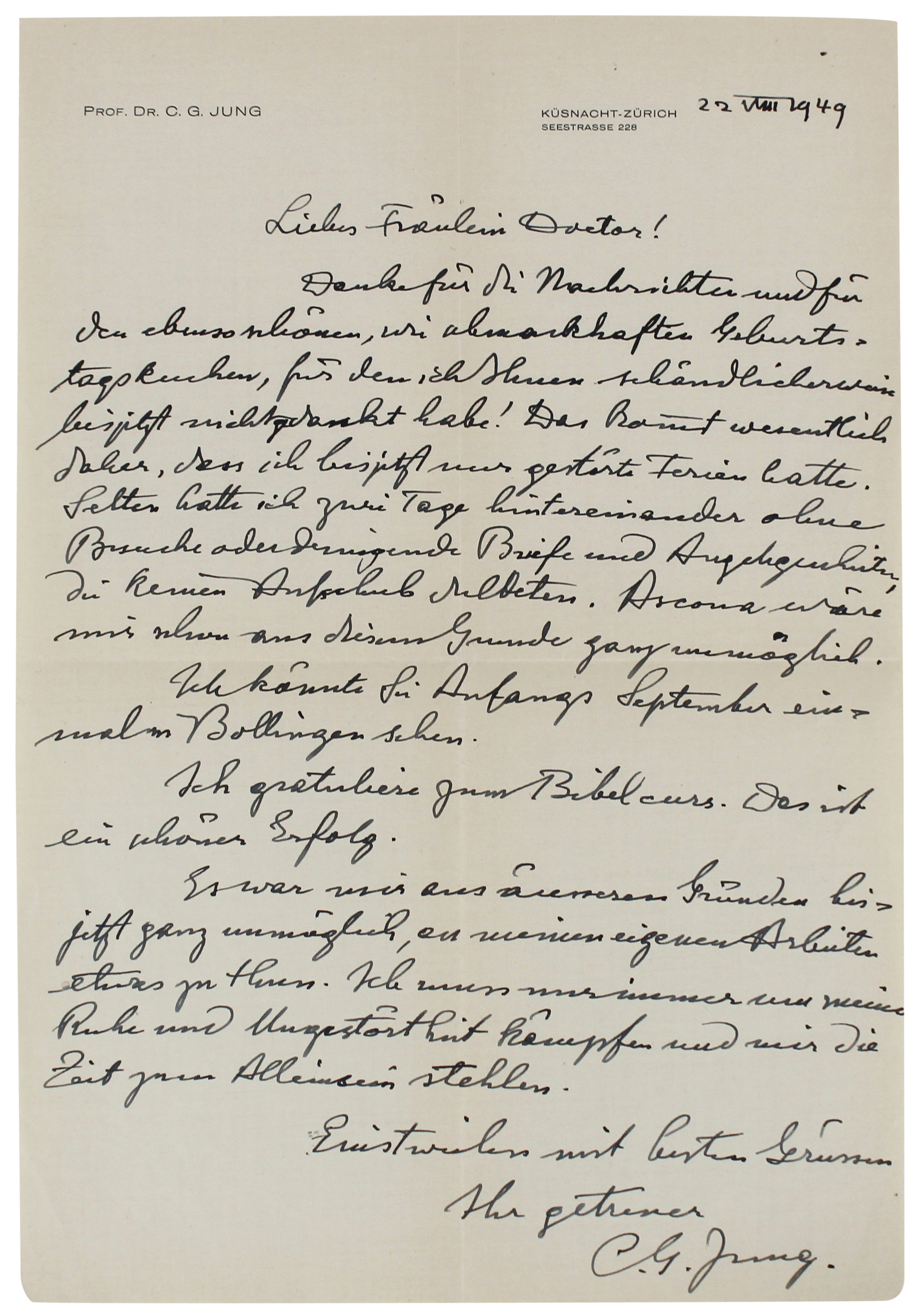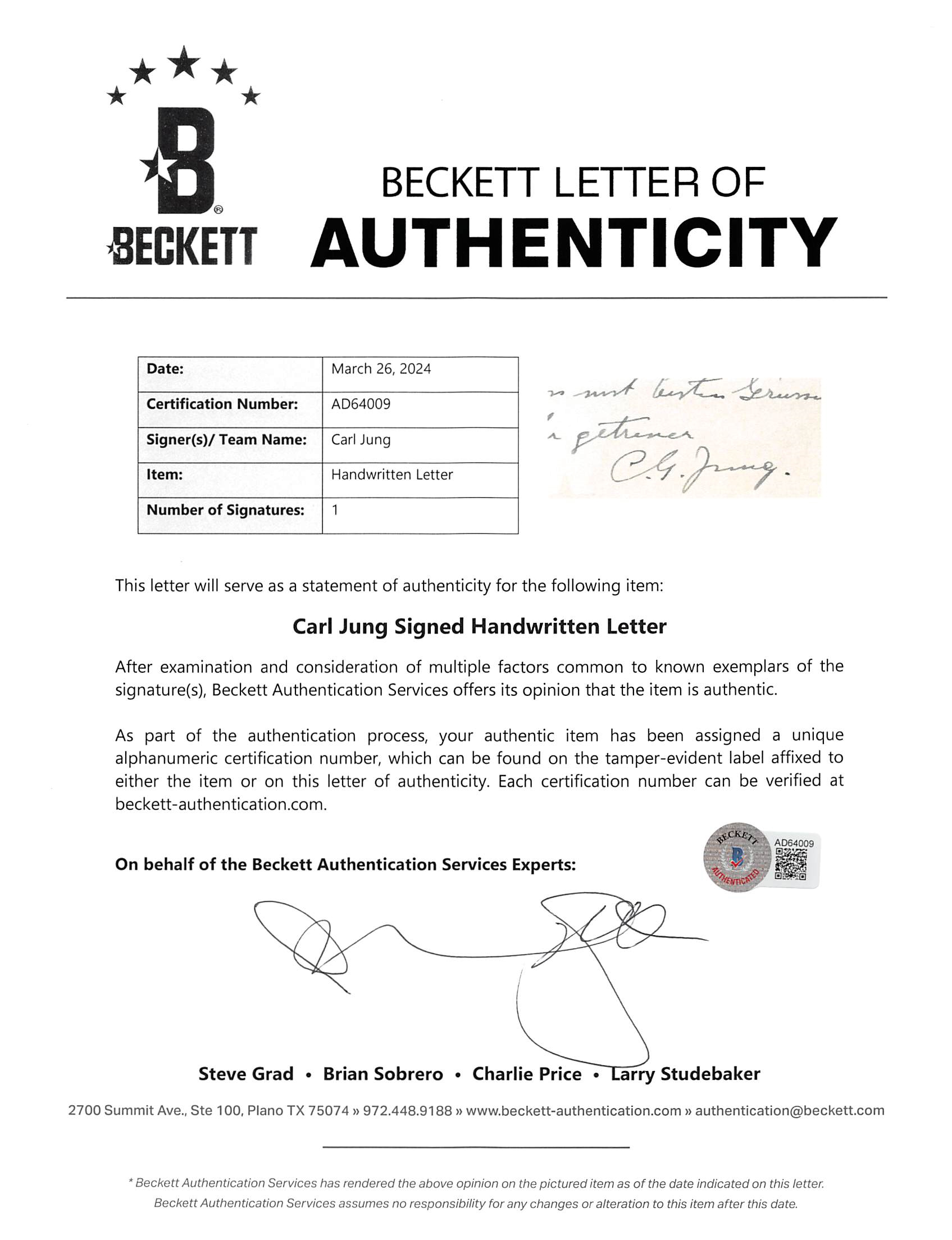 This Autographed 8.25x11.5 1949 Handwritten Letter has been Personally Signed by Carl Jung. This item is 100% Authentic to include a Certificate of Authenticity (COA) / hologram by Beckett Authentication Services. The authenticity can be verified on Beckett Authentication Services website.