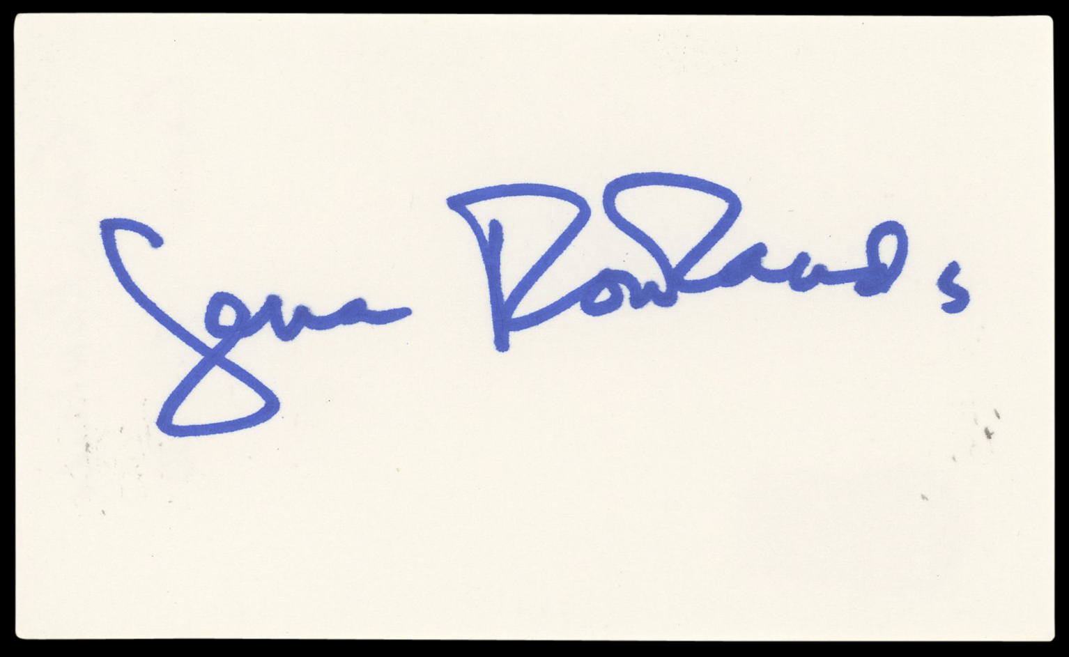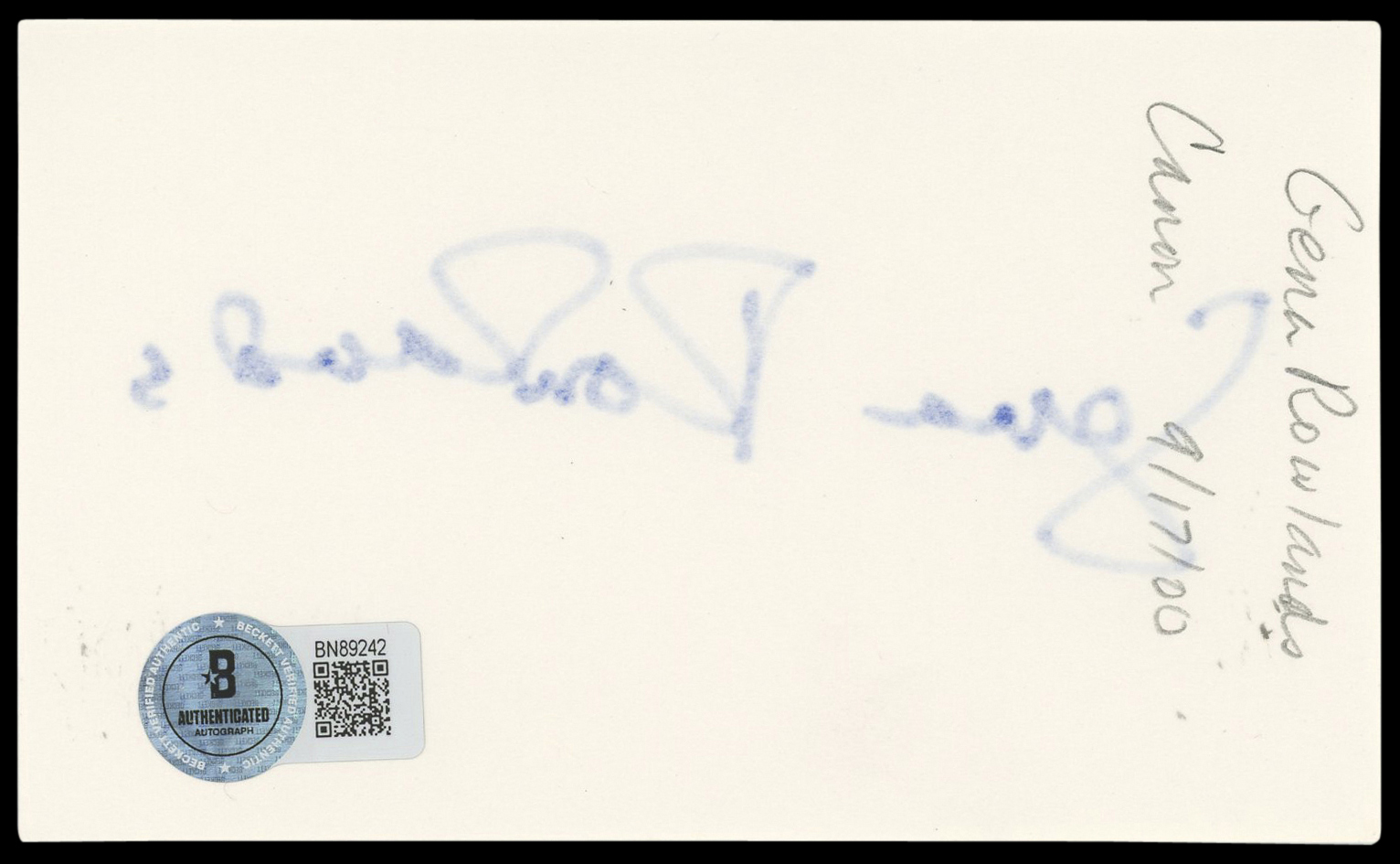 This Autographed 3x5 Index Card has been Personally Signed by Gena Rowlands of The Notebook. This item is 100% Authentic to include a hologram by Beckett Authentication Services. This item will come with an affixed Beckett Authentication Services (BAS) authentication sticker, which includes a scannable QR code to verify authenticity. Please note that Beckett no longer provides serial-numbered COA cards, and the attached BAS sticker will serve as the complete authentication for this item. The authenticity can be verified on Beckett Authentication Services website.