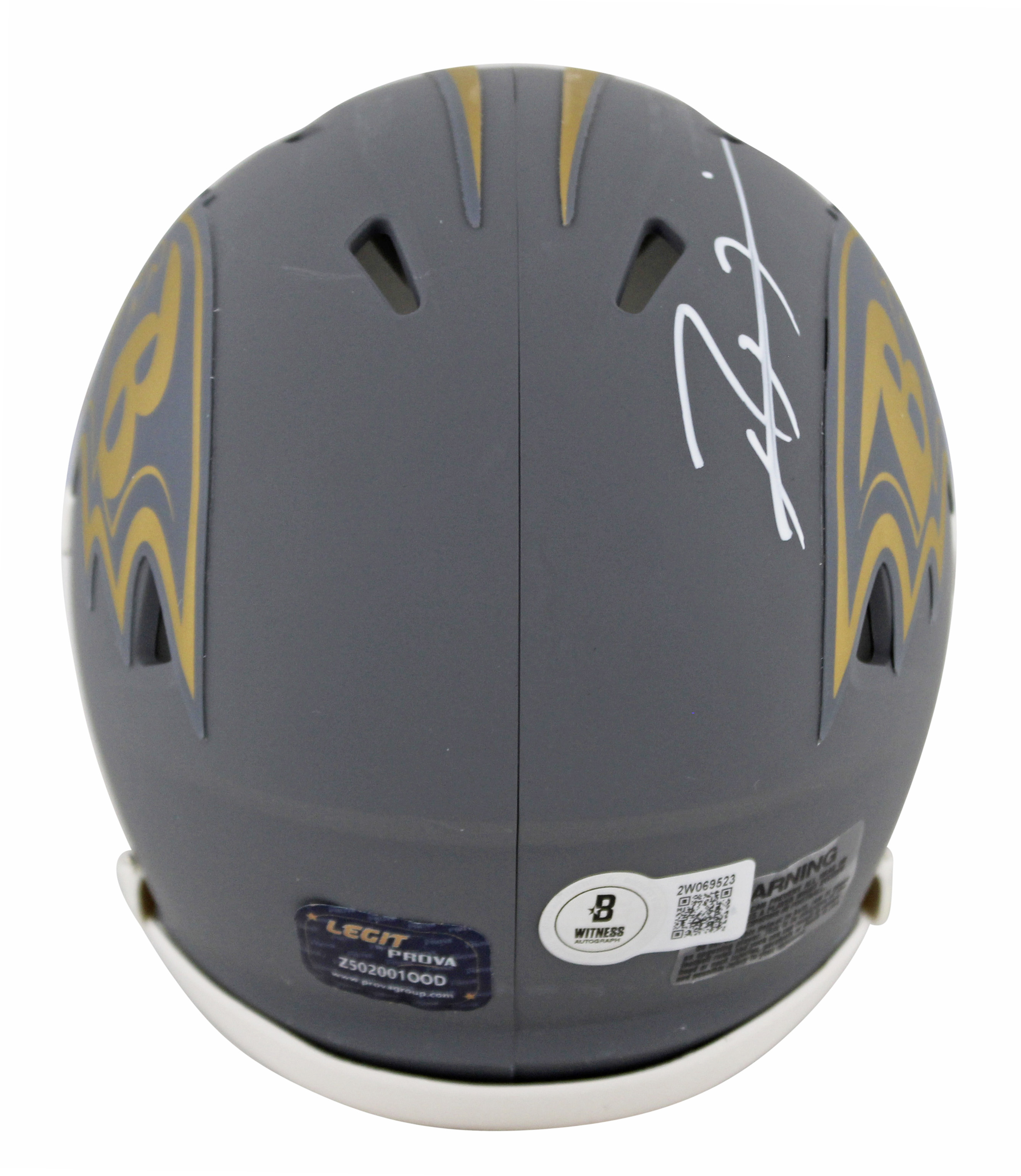 This Autographed w/ White Signature Alternate Slate Speed Mini Helmet has been Personally Signed by Ray Lewis of the Baltimore Ravens. This item is 100% Authentic to include a hologram by Beckett Authentication Services. This item will come with an affixed Beckett Authentication Services (BAS) authentication sticker, which includes a scannable QR code to verify authenticity. Please note that Beckett no longer provides serial-numbered COA cards, and the attached BAS sticker will serve as the complete authentication for this item. This is a BAS Witnessed Protection Program item which means a Beckett Authentication Service representative was present when this item was being signed. We conducted an autograph signing with Ray Lewis where multiples of the same item were signed. While the photographs are representative of this item, the size, placement and strength of the signature may vary. Each item is hand signed, therefore, each autograph is unique. This item can be verified through BAS Witnessed.