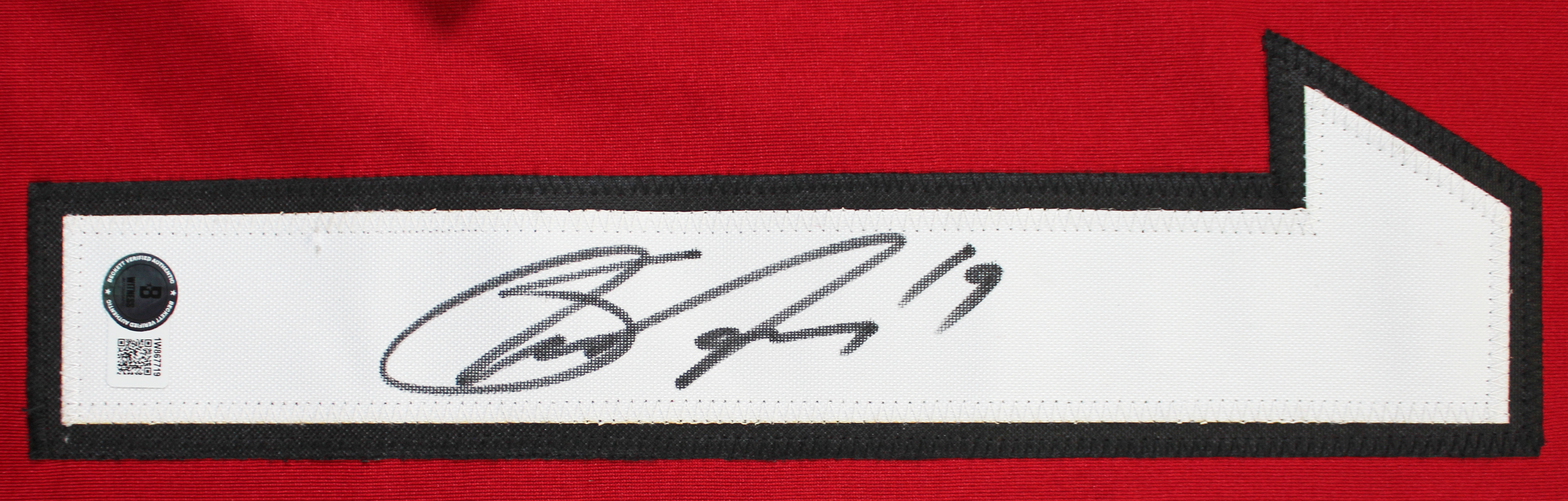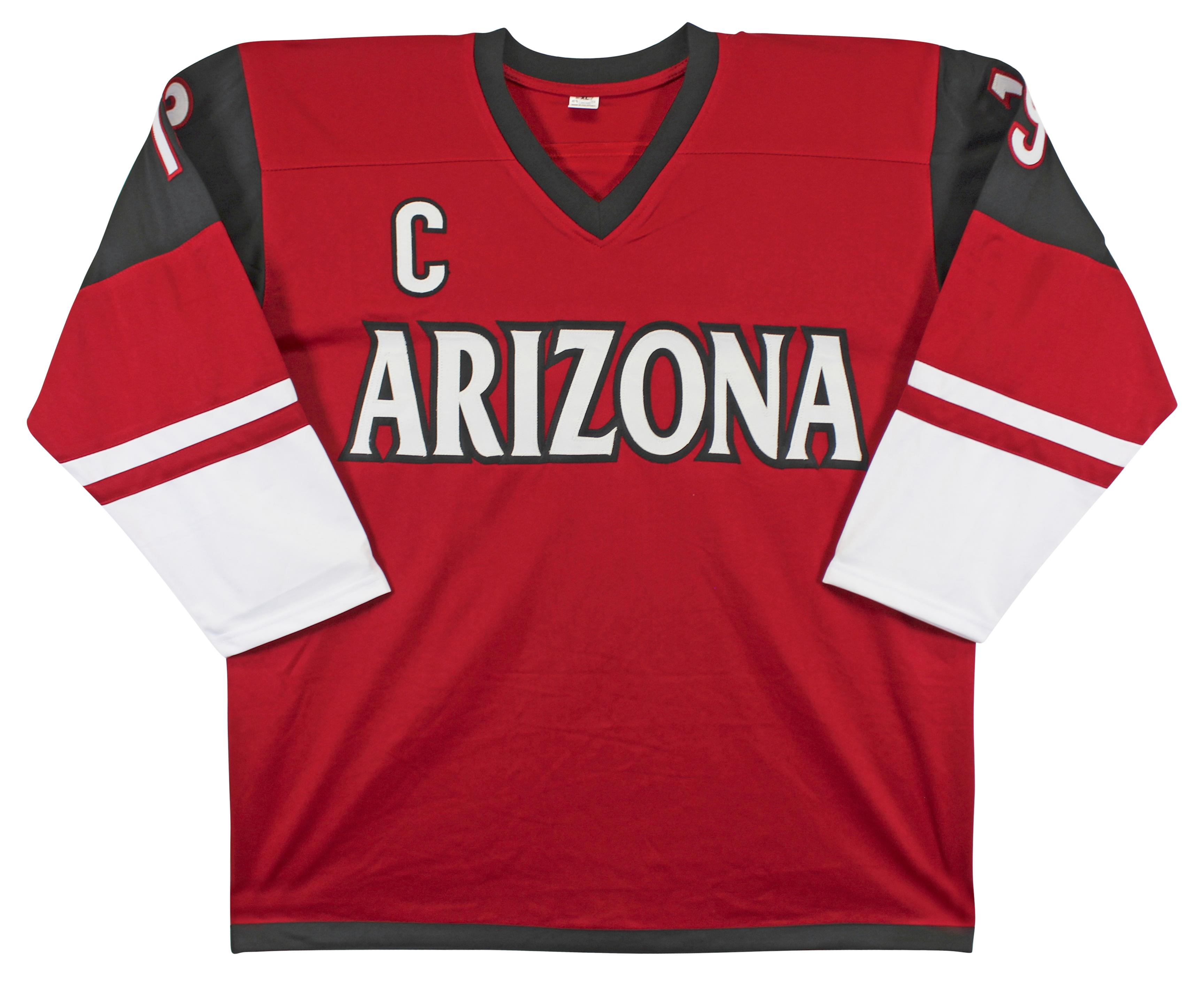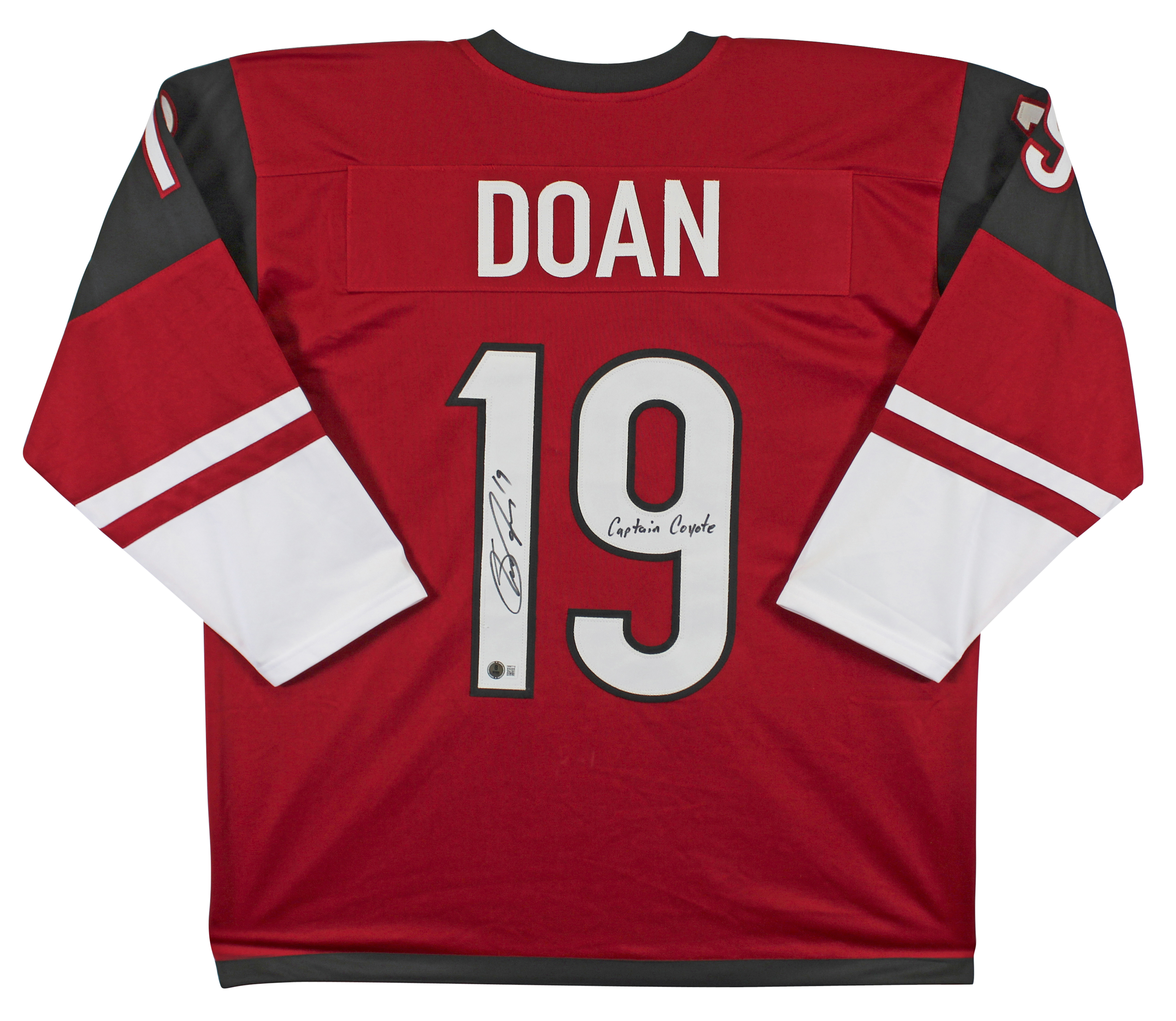 This Autographed Maroon Pro Style Jersey with the inscription of "Captain Coyote" has been Personally Signed by Shane Doan of the Arizona Coyotes. This item is 100% Authentic to include a hologram by Beckett Authentication Services. This item will come with an affixed Beckett Authentication Services (BAS) authentication sticker, which includes a scannable QR code to verify authenticity. Please note that Beckett no longer provides serial-numbered COA cards, and the attached BAS sticker will serve as the complete authentication for this item. This is a BAS Witnessed Protection Program item which means a Beckett Authentication Service representative was present when this item was being signed. We conducted an autograph signing with Shane Doan where multiples of the same item were signed. While the photographs are representative of this item, the size, placement and strength of the signature may vary. Each item is hand signed, therefore, each autograph is unique. This item can be verified through BAS Witnessed. This is a X-Large sized, non-branded, custom-stitched Jersey.