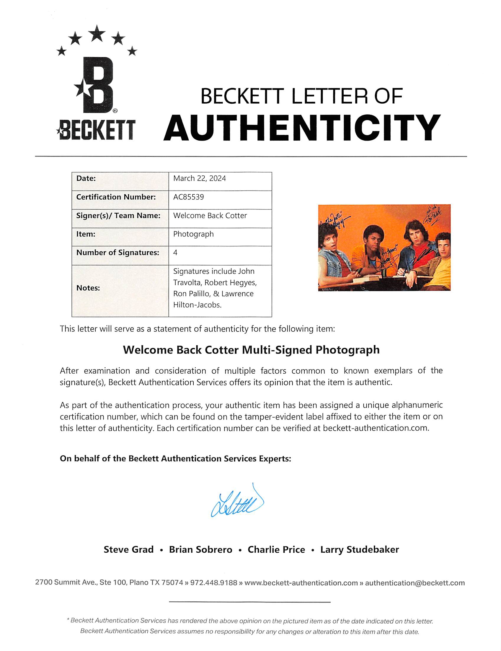 This Autographed 10x12.75 Photo has been Personally Signed by John Travolta, Robert Hegyes, Ron Palillo & Lawrence Hilton-Jacobs of Welcome Back, Kotter. This item is 100% Authentic to include a Certificate of Authenticity (COA) / hologram by Beckett Authentication Services. The authenticity can be verified on Beckett Authentication Services website.