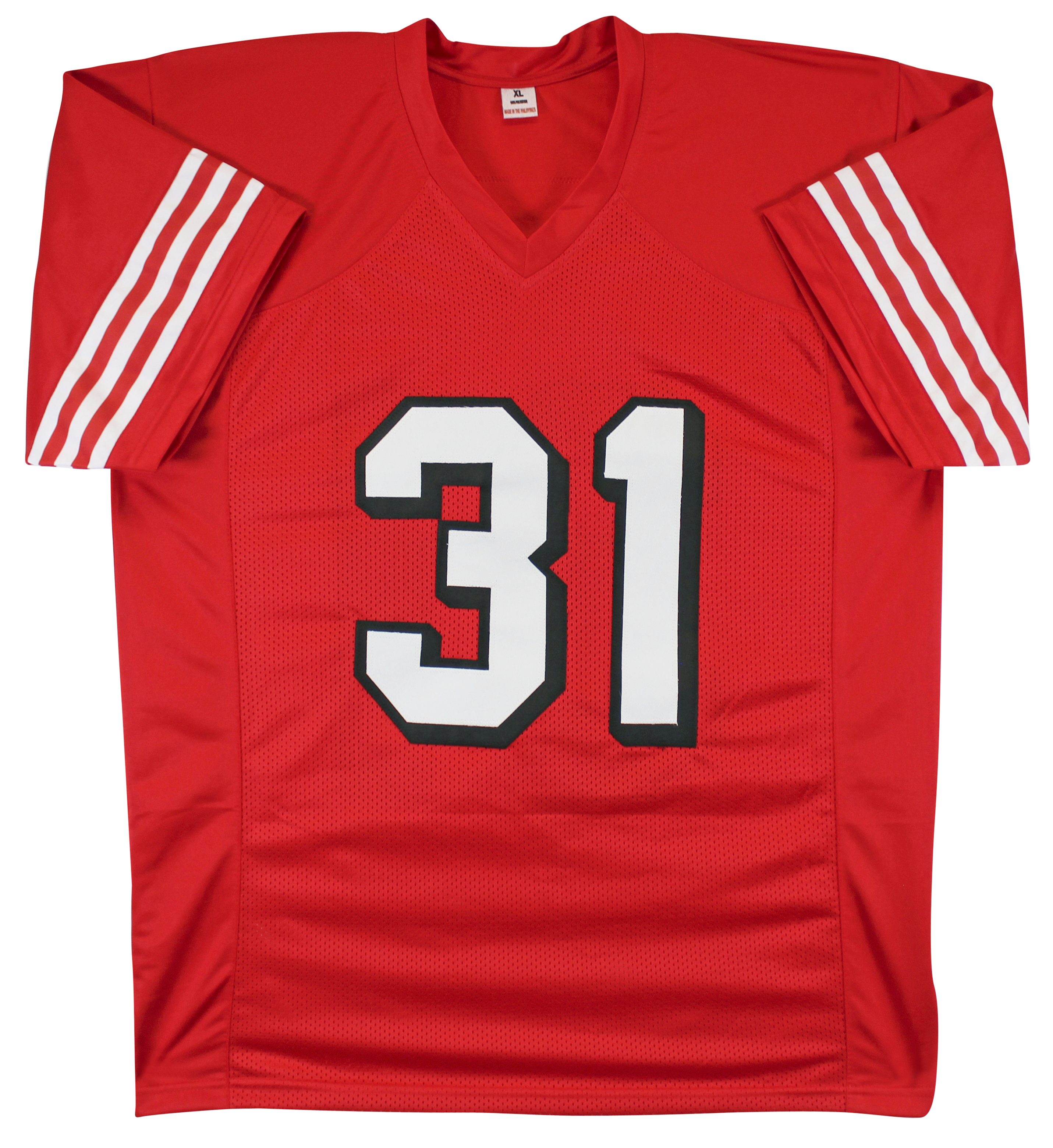 This Autographed w/ Dropshadow Red Pro Style Jersey has been Personally Signed by Renardo Green of the San Francisco 49ers. This item is 100% Authentic to include a hologram by Beckett Authentication Services. This item will come with an affixed Beckett Authentication Services (BAS) authentication sticker, which includes a scannable QR code to verify authenticity. Please note that Beckett no longer provides serial-numbered COA cards, and the attached BAS sticker will serve as the complete authentication for this item. This is a BAS Witnessed Protection Program item which means a Beckett Authentication Service representative was present when this item was being signed. We conducted an autograph signing with Renardo Green where multiples of the same item were signed. While the photographs are representative of this item, the size, placement and strength of the signature may vary. Each item is hand signed, therefore, each autograph is unique. This item can be verified through BAS Witnessed. This is a X-Large sized Jersey.