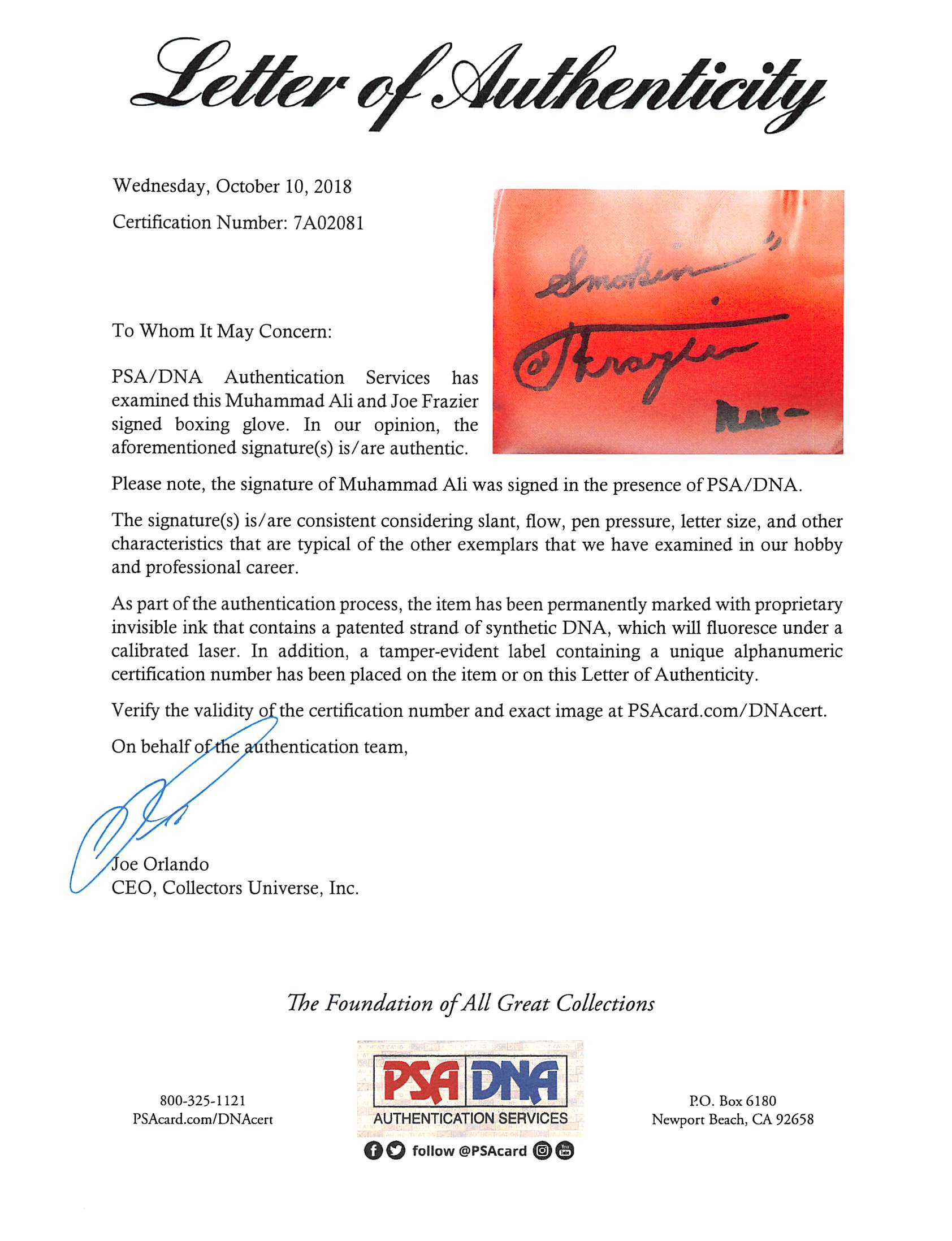 This Autographed Red Everlast Boxing Glove with the inscription of "Smokin (Frazier)" has been Personally Signed by Muhammad Ali & Joe Frazier. This item is 100% Authentic and comes with a PSA/DNA Certification Card and a matching numbered Hologram. The authenticity can be verified on Professional Sports Authenticator website.