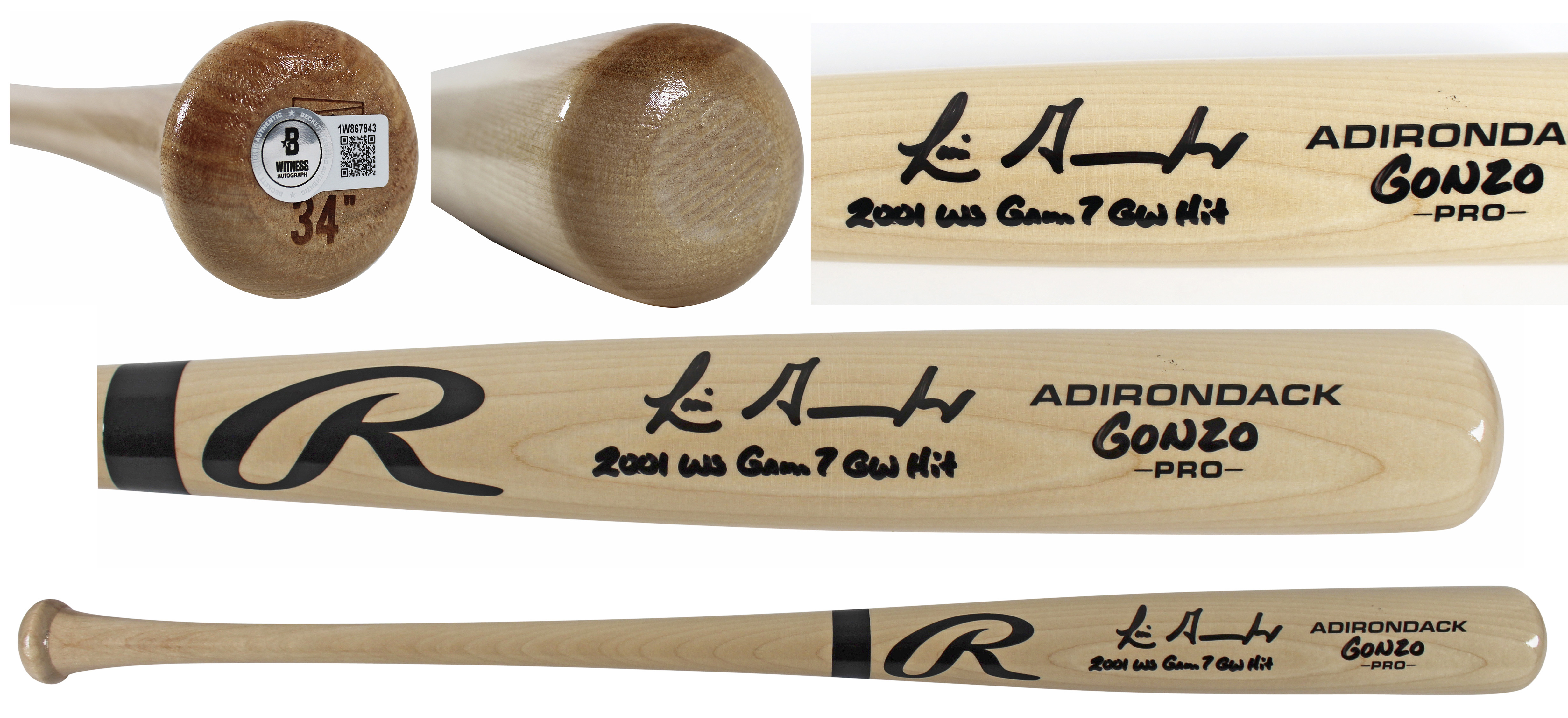 This Autographed Blonde Rawlings Adirondack Baseball Bat with the inscription of "2001 WS Game 7 GW Hit, Gonzo" has been Personally Signed by Luis Gonzalez of the Arizona Diamondbacks. This item is 100% Authentic to include a hologram by Beckett Authentication Services. This item will come with an affixed Beckett Authentication Services (BAS) authentication sticker, which includes a scannable QR code to verify authenticity. Please note that Beckett no longer provides serial-numbered COA cards, and the attached BAS sticker will serve as the complete authentication for this item. This is a BAS Witnessed Protection Program item which means a Beckett Authentication Service representative was present when this item was being signed. We conducted an autograph signing with Luis Gonzalez where multiples of the same item were signed. While the photographs are representative of this item, the size, placement and strength of the signature may vary. Each item is hand signed, therefore, each autograph is unique. This item can be verified through BAS Witnessed.