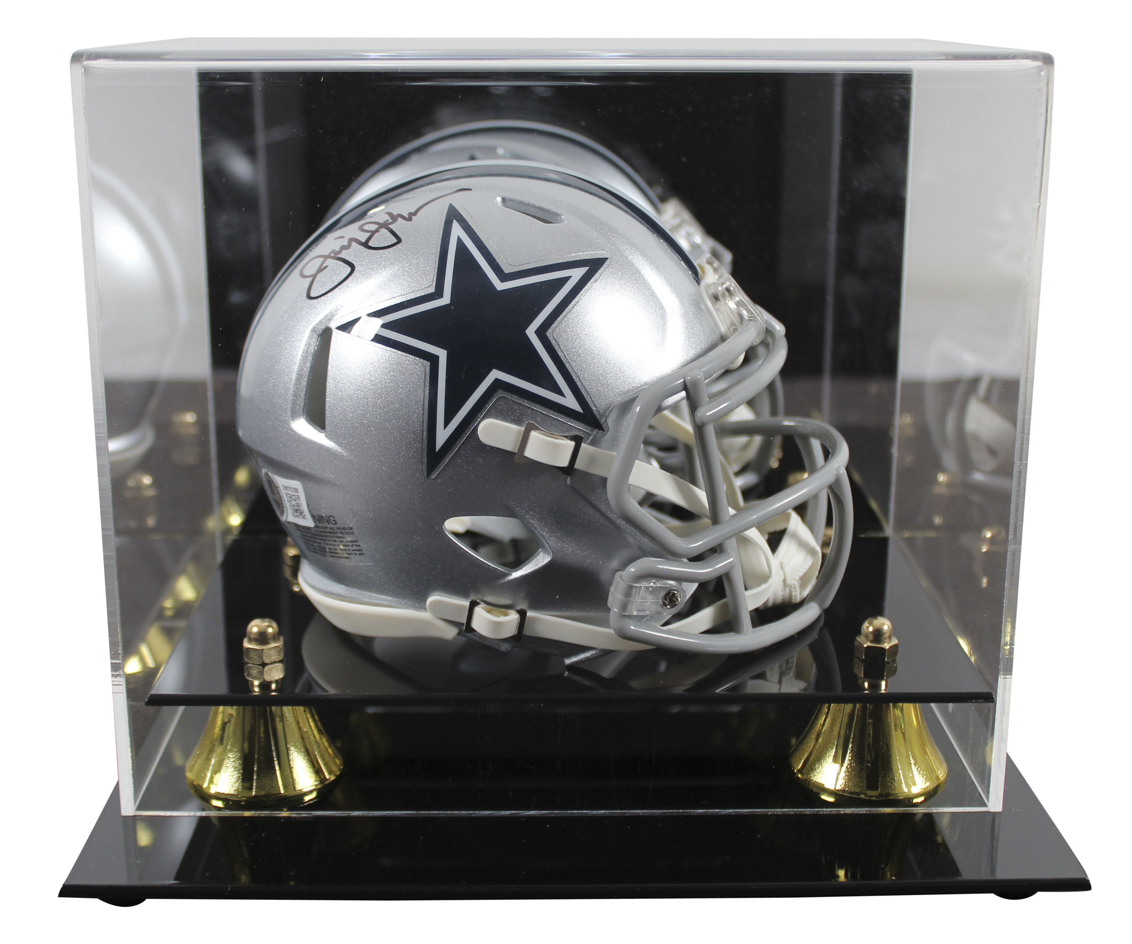 This Autographed Speed Mini Helmet W/ Uv Mirrored Back Acrylic Display Case has been Personally Signed by Jimmy Johnson of the Dallas Cowboys. This item is 100% Authentic to include a hologram by Beckett Authentication Services. This item will come with an affixed Beckett Authentication Services (BAS) authentication sticker, which includes a scannable QR code to verify authenticity. Please note that Beckett no longer provides serial-numbered COA cards, and the attached BAS sticker will serve as the complete authentication for this item. This is a BAS Witnessed Protection Program item which means a Beckett Authentication Service representative was present when this item was being signed. We conducted an autograph signing with Jimmy Johnson where multiples of the same item were signed. While the photographs are representative of this item, the size, placement and strength of the signature may vary. Each item is hand signed, therefore, each autograph is unique. This item can be verified through BAS Witnessed.