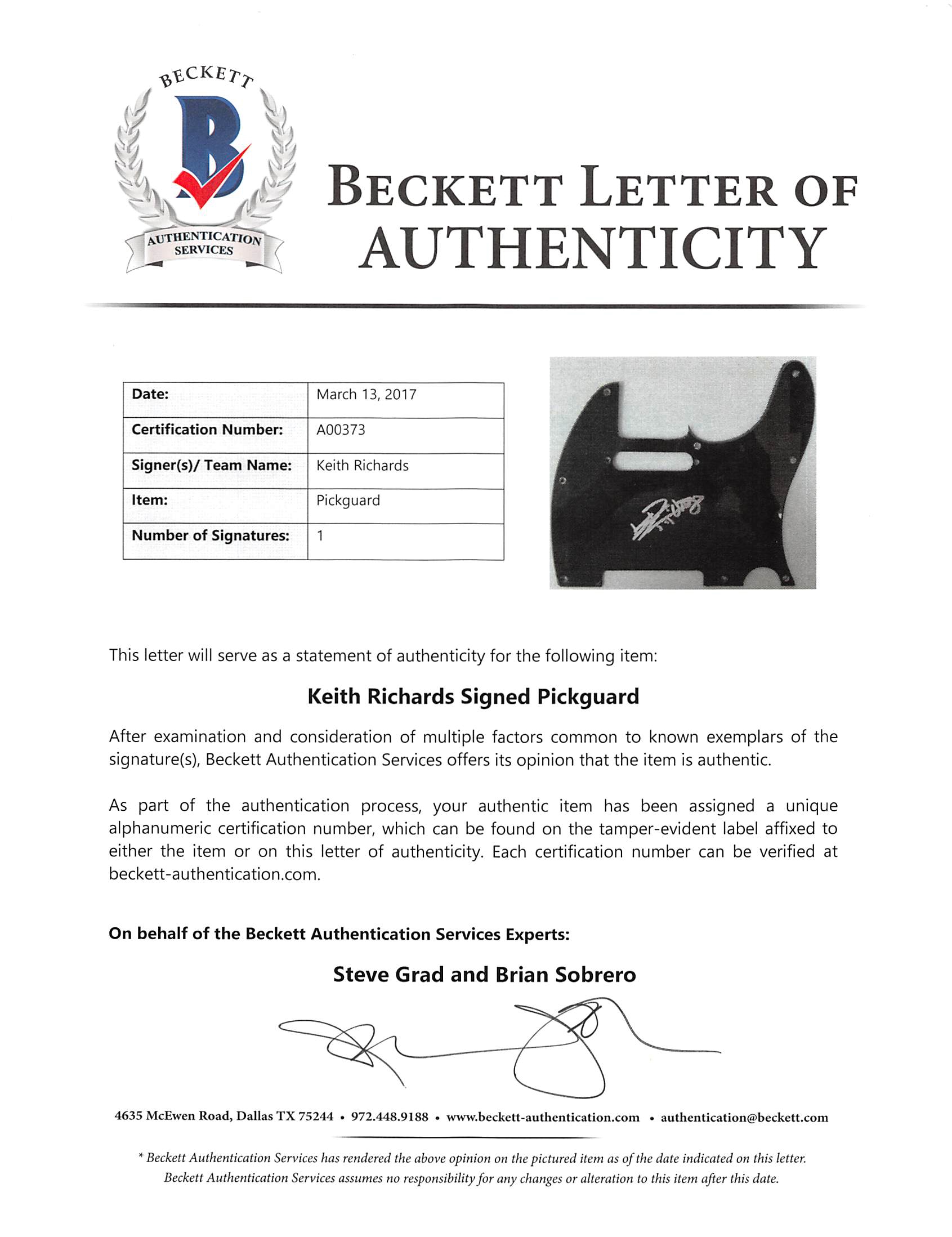 The authenticity can be verified on Beckett Authentication Services website. This Autographed Butterscotch Fender Squier Telecaster Guitar has been Personally Signed by Keith Richards of The Rolling Stones. This item is 100% Authentic to include a Certificate of Authenticity (COA) / hologram by Beckett Authentication Services. The authenticity can be verified on Beckett Authentication Services website.