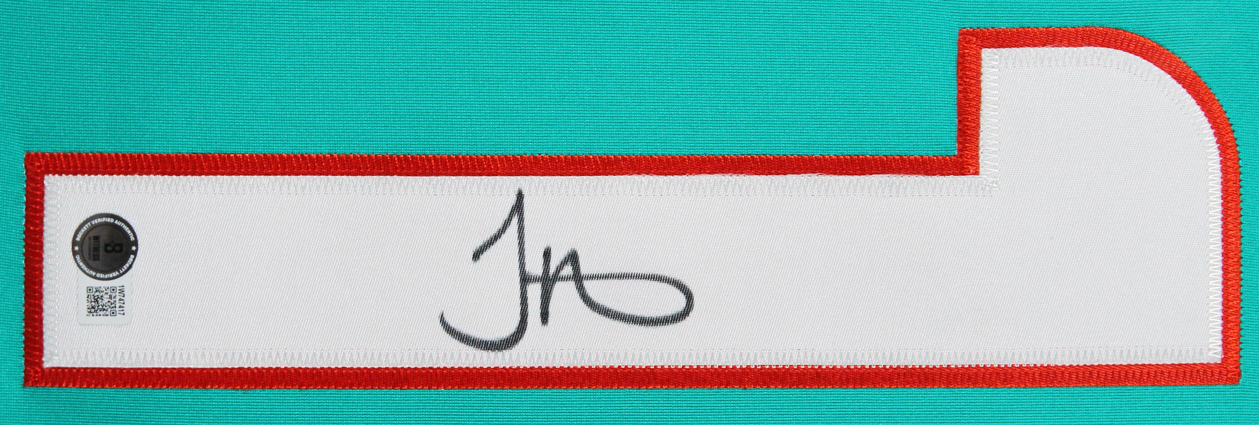 This Autographed w/ Sewn Numbers Teal Nike Framed Jersey has been Personally Signed by Tyreek Hill of the Miami Dolphins. This item is 100% Authentic to include a hologram by Beckett Authentication Services. This item will come with an affixed Beckett Authentication Services (BAS) authentication sticker, which includes a scannable QR code to verify authenticity. Please note that Beckett no longer provides serial-numbered COA cards, and the attached BAS sticker will serve as the complete authentication for this item. This is a BAS Witnessed Protection Program item which means a Beckett Authentication Service representative was present when this item was being signed. We conducted an autograph signing with Tyreek Hill where multiples of the same item were signed. While the photographs are representative of this item, the size, placement and strength of the signature may vary. Each item is hand signed, therefore, each autograph is unique. This item can be verified through BAS Witnessed. This item has been professionally framed to overall dimensions of approximately 32 x 37 inches. This jersey will be framed to order, it will take 3-4 days from purchase date for it to ship.