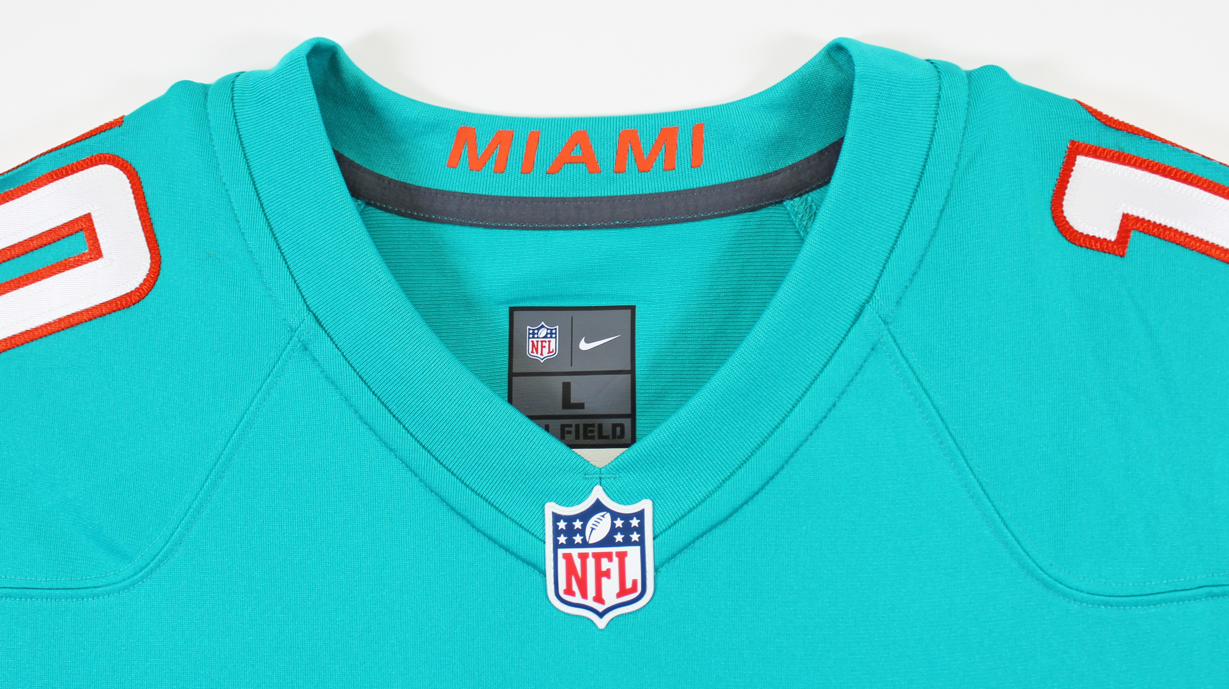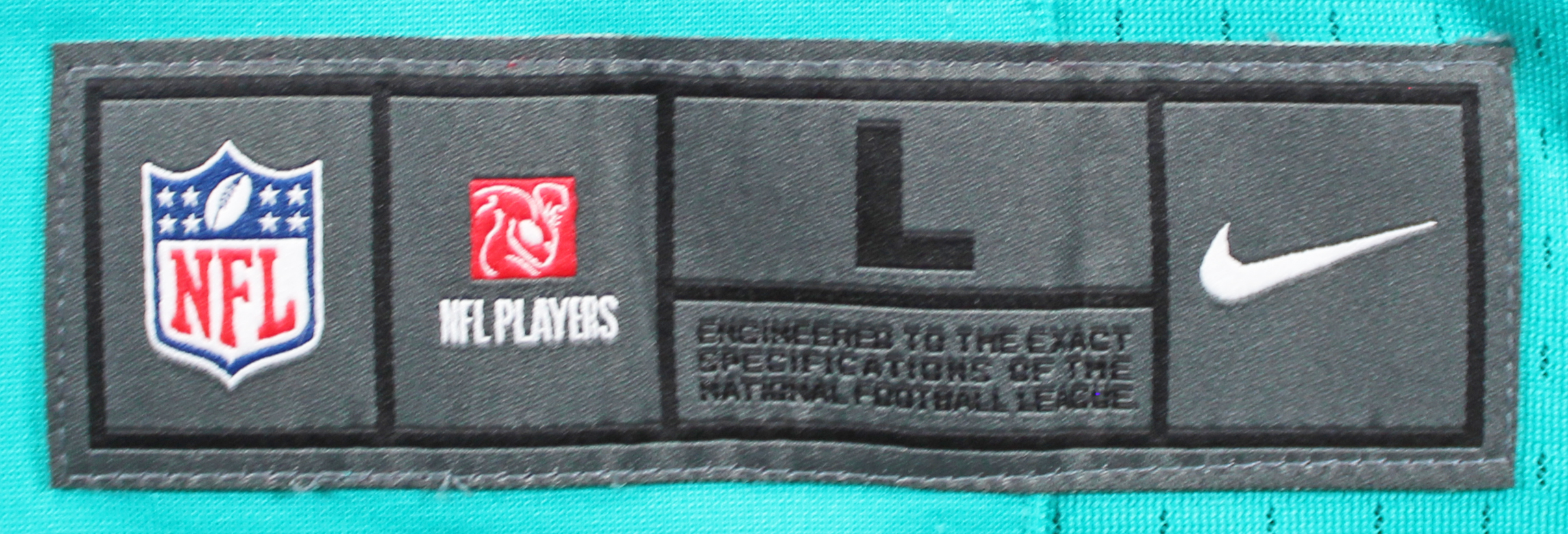 This Autographed w/ Sewn Numbers Teal Nike Jersey has been Personally Signed by Tyreek Hill of the Miami Dolphins. This item is 100% Authentic to include a hologram by Beckett Authentication Services. This item will come with an affixed Beckett Authentication Services (BAS) authentication sticker, which includes a scannable QR code to verify authenticity. Please note that Beckett no longer provides serial-numbered COA cards, and the attached BAS sticker will serve as the complete authentication for this item. This is a BAS Witnessed Protection Program item which means a Beckett Authentication Service representative was present when this item was being signed. We conducted an autograph signing with Tyreek Hill where multiples of the same item were signed. While the photographs are representative of this item, the size, placement and strength of the signature may vary. Each item is hand signed, therefore, each autograph is unique. This item can be verified through BAS Witnessed. This is a Large sized Jersey.