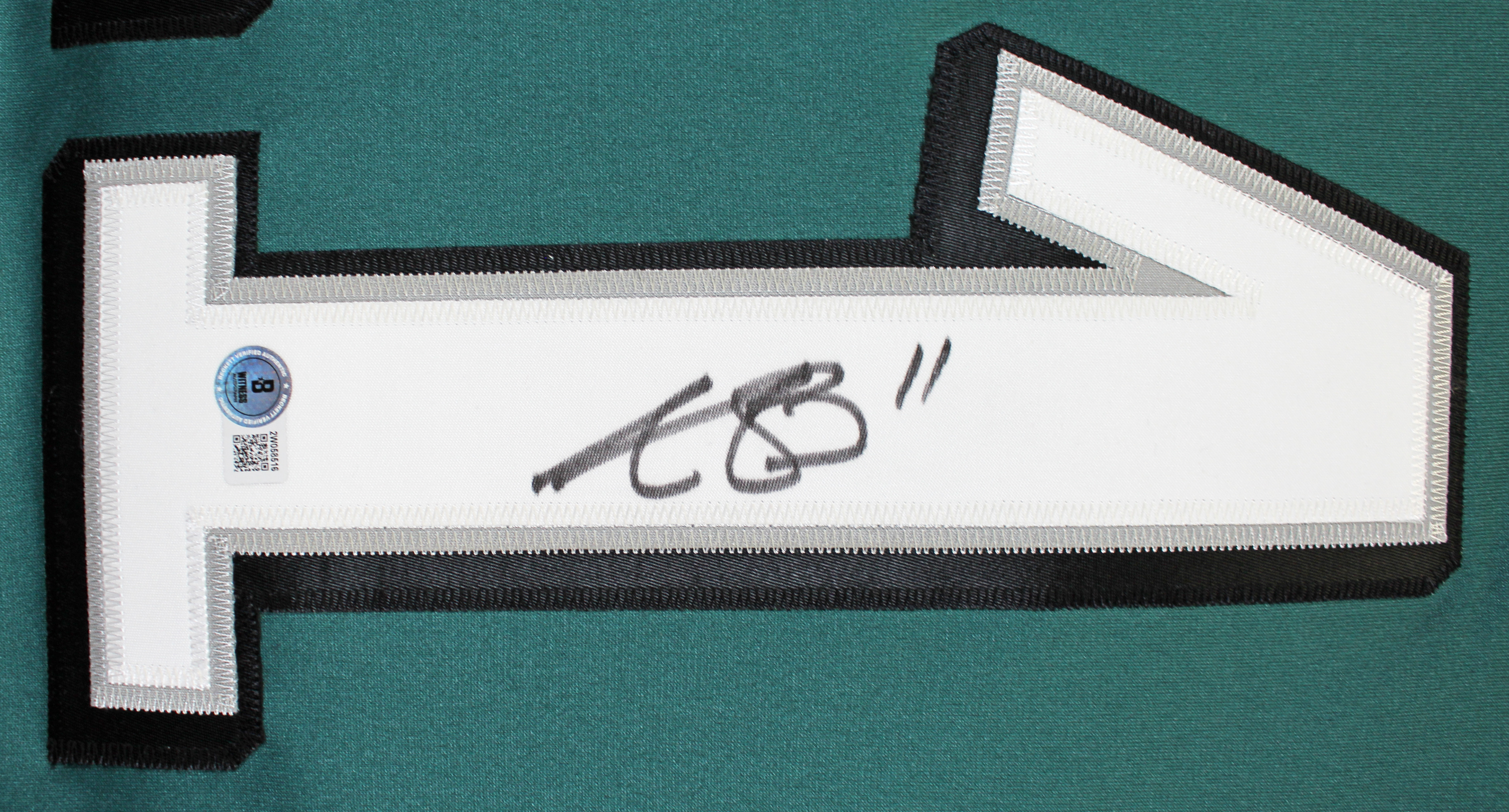 This Autographed w/ Sewn Numbers Green Nike Limited Jersey has been Personally Signed by A.J. Brown of the Philadelphia Eagles. This item is 100% Authentic to include a hologram by Beckett Authentication Services. This item will come with an affixed Beckett Authentication Services (BAS) authentication sticker, which includes a scannable QR code to verify authenticity. Please note that Beckett no longer provides serial-numbered COA cards, and the attached BAS sticker will serve as the complete authentication for this item. This is a BAS Witnessed Protection Program item which means a Beckett Authentication Service representative was present when this item was being signed. We conducted an autograph signing with A.J. Brown where multiples of the same item were signed. While the photographs are representative of this item, the size, placement and strength of the signature may vary. Each item is hand signed, therefore, each autograph is unique. This item can be verified through BAS Witnessed. This is a XX-Large sized Jersey.