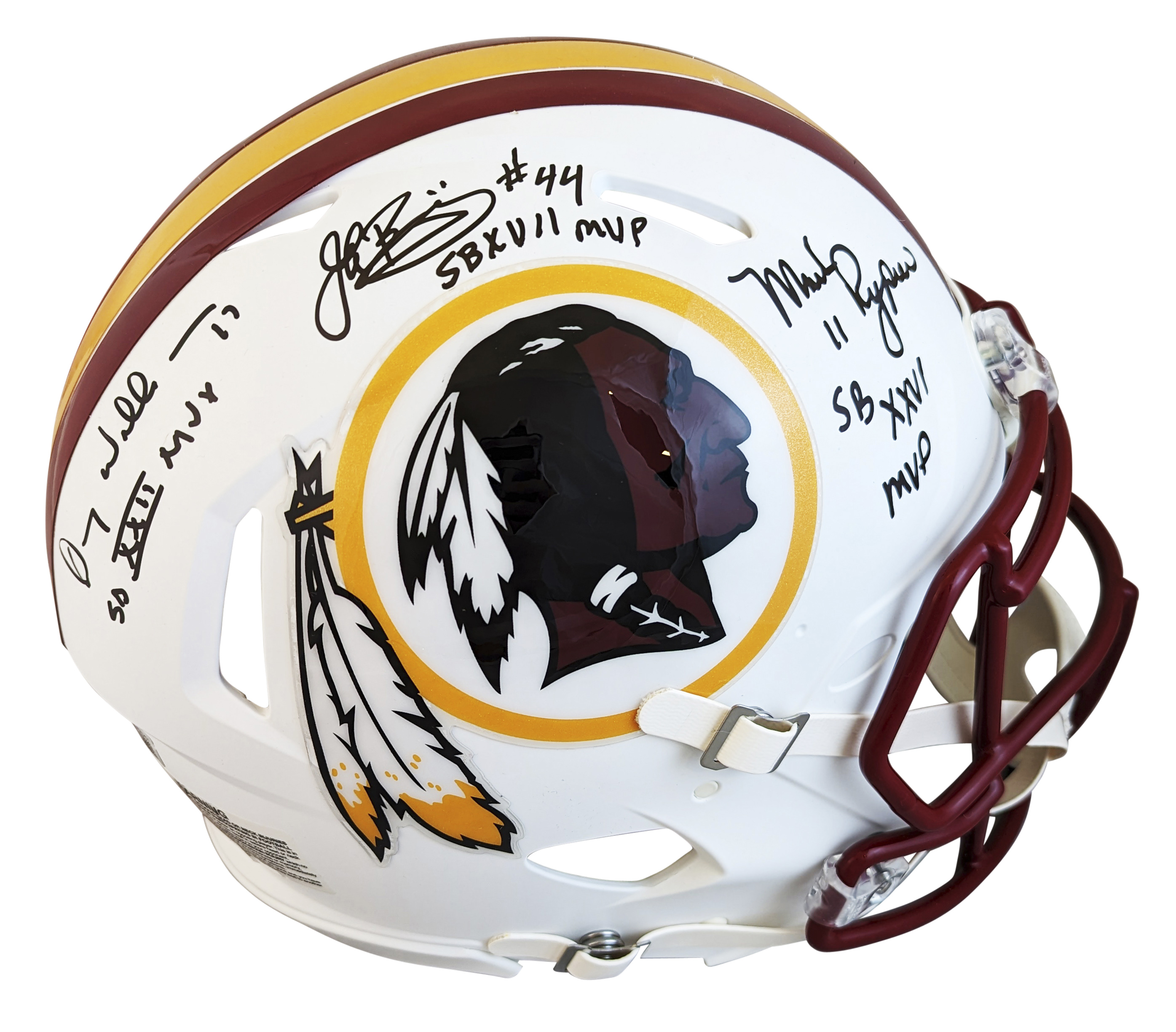 This Autographed Alternate Flat White Riddell Full Size Speed Proline Helmet W/ Uv Mirrored Back Acrylic Display Case with the inscription of "SB XVII MVP (Riggins), SB XXII MVP (Williams), SB XXVI MVP (Rypien)" has been Personally Signed by Doug Williams, Mark Rypien & John Riggins of the Washington Commanders. This item is 100% Authentic to include a hologram by Beckett Authentication Services. This item will come with an affixed Beckett Authentication Services (BAS) authentication sticker, which includes a scannable QR code to verify authenticity. Please note that Beckett no longer provides serial-numbered COA cards, and the attached BAS sticker will serve as the complete authentication for this item. This is a BAS Witnessed Protection Program item which means a Beckett Authentication Service representative was present when this item was being signed. We conducted an autograph signing with Doug Williams, Mark Rypien & John Riggins where multiples of the same item were signed. While the photographs are representative of this item, the size, placement and strength of the signature may vary. Each item is hand signed, therefore, each autograph is unique. This item can be verified through BAS Witnessed.