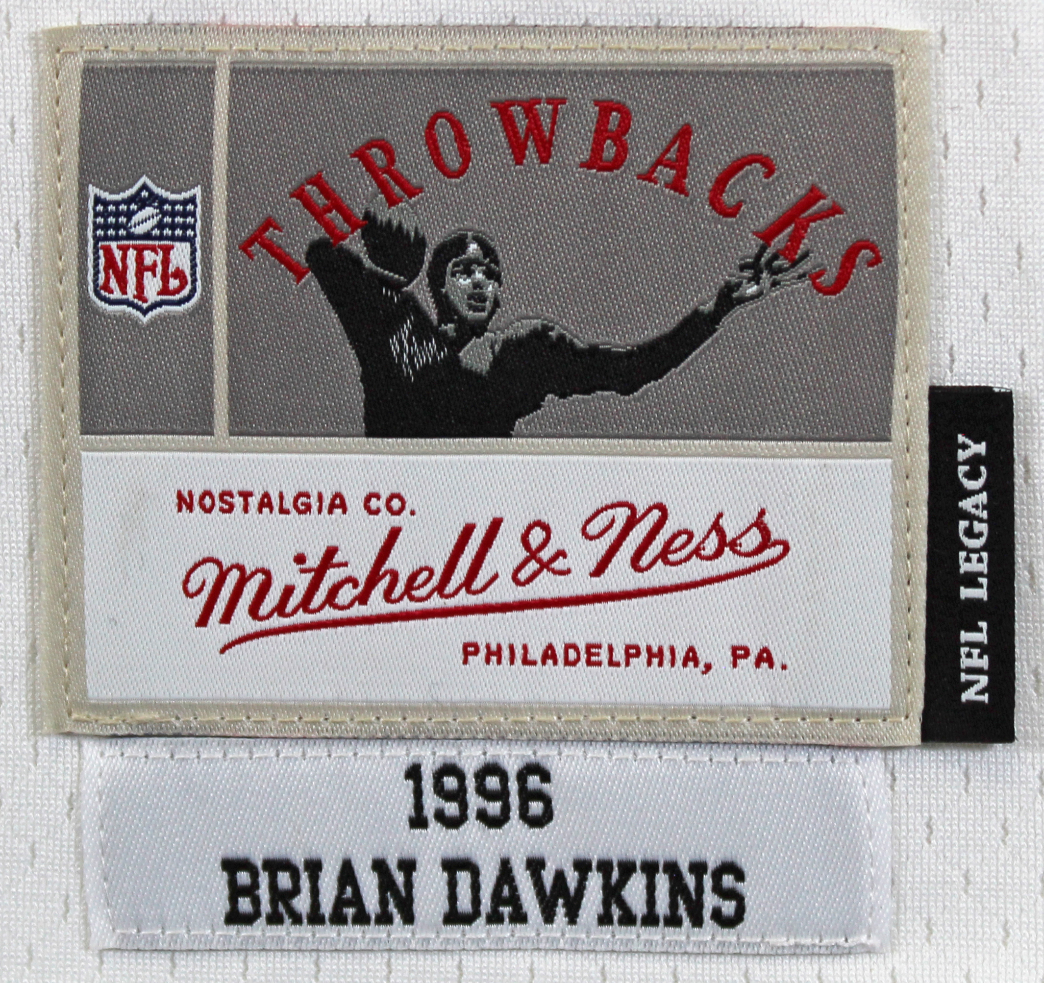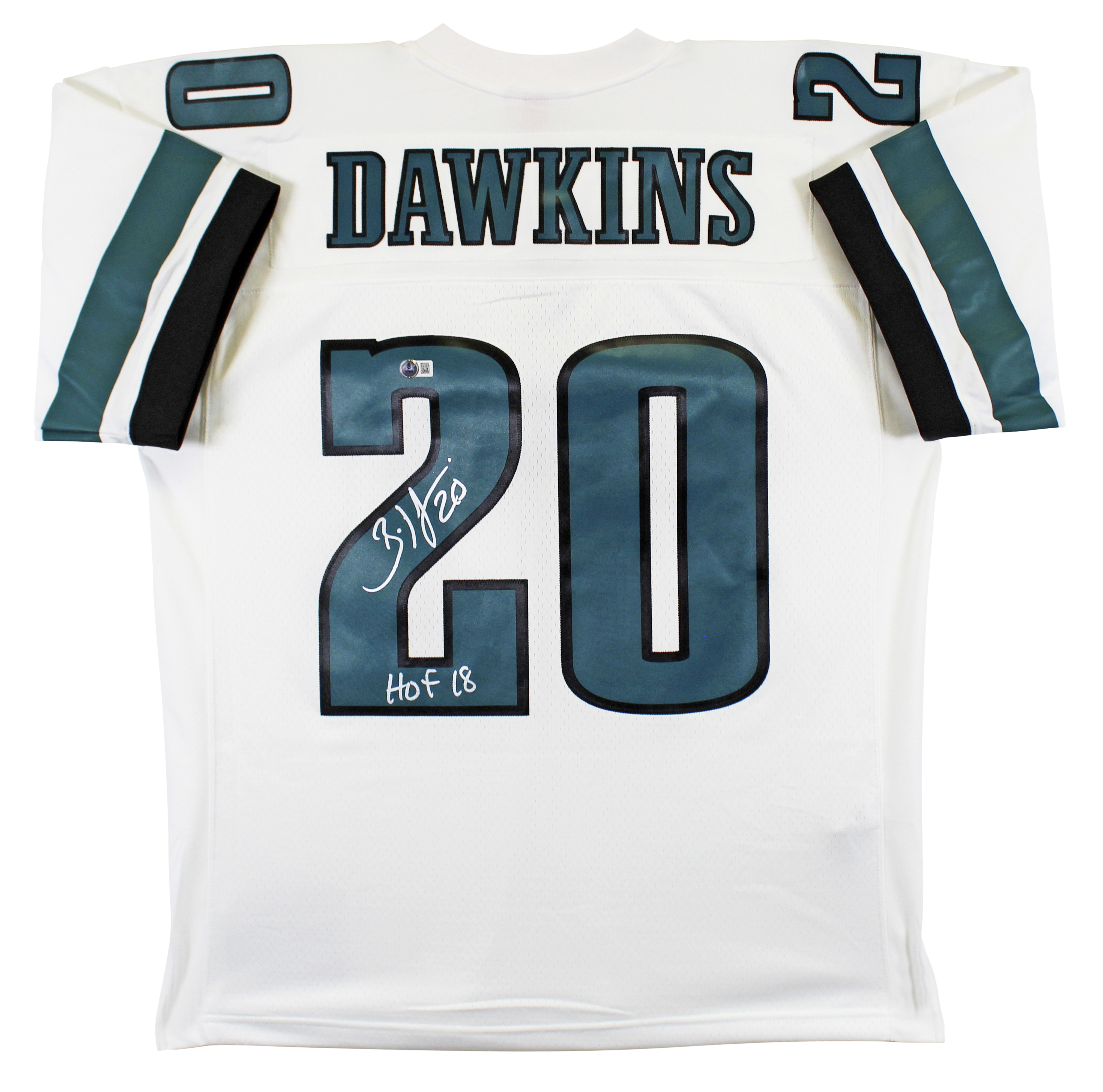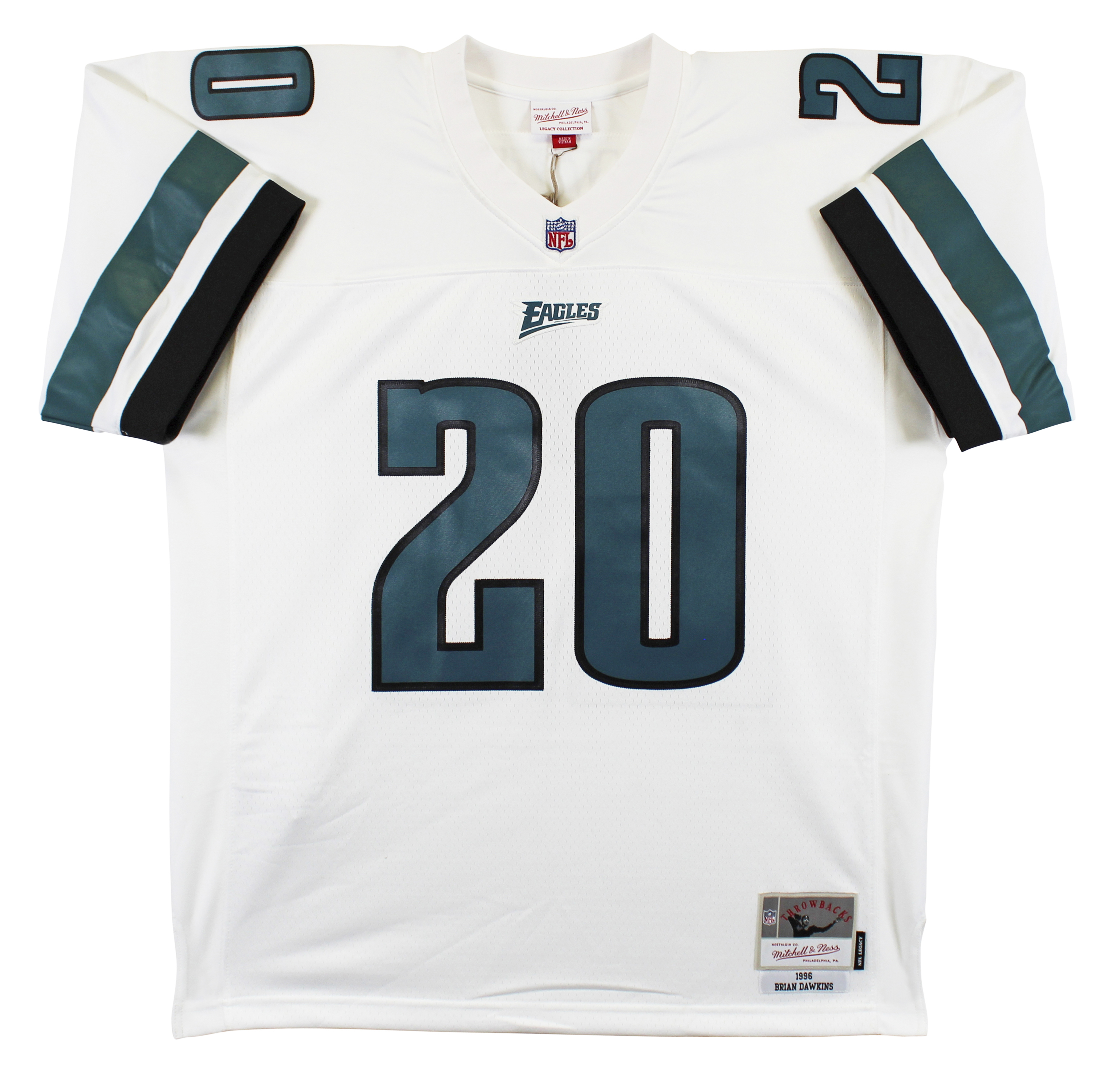 This Autographed White Mitchell & Ness Jersey with the inscription of "HOF 18" has been Personally Signed by Brian Dawkins of the Philadelphia Eagles. This item is 100% Authentic to include a hologram by Beckett Authentication Services. This item will come with an affixed Beckett Authentication Services (BAS) authentication sticker, which includes a scannable QR code to verify authenticity. Please note that Beckett no longer provides serial-numbered COA cards, and the attached BAS sticker will serve as the complete authentication for this item. This is a BAS Witnessed Protection Program item which means a Beckett Authentication Service representative was present when this item was being signed. We conducted an autograph signing with Brian Dawkins where multiples of the same item were signed. While the photographs are representative of this item, the size, placement and strength of the signature may vary. Each item is hand signed, therefore, each autograph is unique. This item can be verified through BAS Witnessed. This is a X-Large sized Jersey.