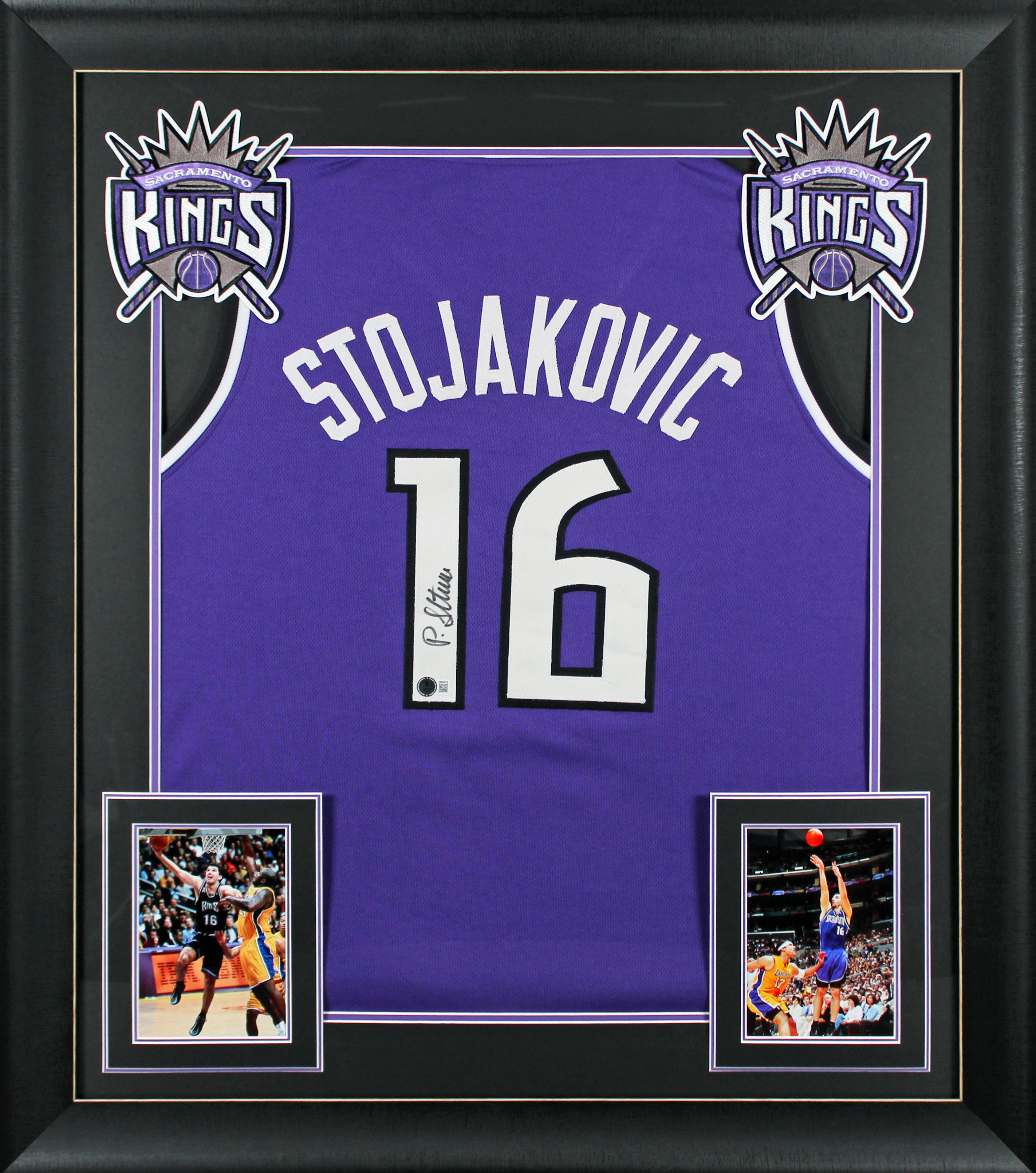 This Autographed Purple Pro Style Framed Jersey has been Personally Signed by Peja Stojakovic of the Sacramento Kings. This item is 100% Authentic to include a hologram by Beckett Authentication Services. This item will come with an affixed Beckett Authentication Services (BAS) authentication sticker, which includes a scannable QR code to verify authenticity. Please note that Beckett no longer provides serial-numbered COA cards, and the attached BAS sticker will serve as the complete authentication for this item. This is a BAS Witnessed Protection Program item which means a Beckett Authentication Service representative was present when this item was being signed. We conducted an autograph signing with Peja Stojakovic where multiples of the same item were signed. While the photographs are representative of this item, the size, placement and strength of the signature may vary. Each item is hand signed, therefore, each autograph is unique. This item can be verified through BAS Witnessed. This item has been professionally framed to overall dimensions of approximately 32 x 37 inches. This is a X-Large sized, non-branded, custom-stitched Framed Jersey. These jerseys are framed to order, it takes approximately 3-4 business days for framing to be completed.