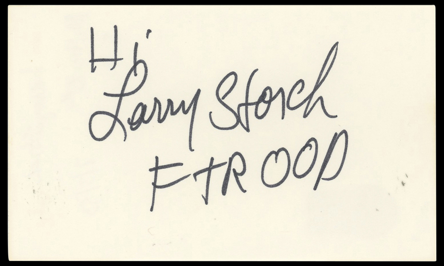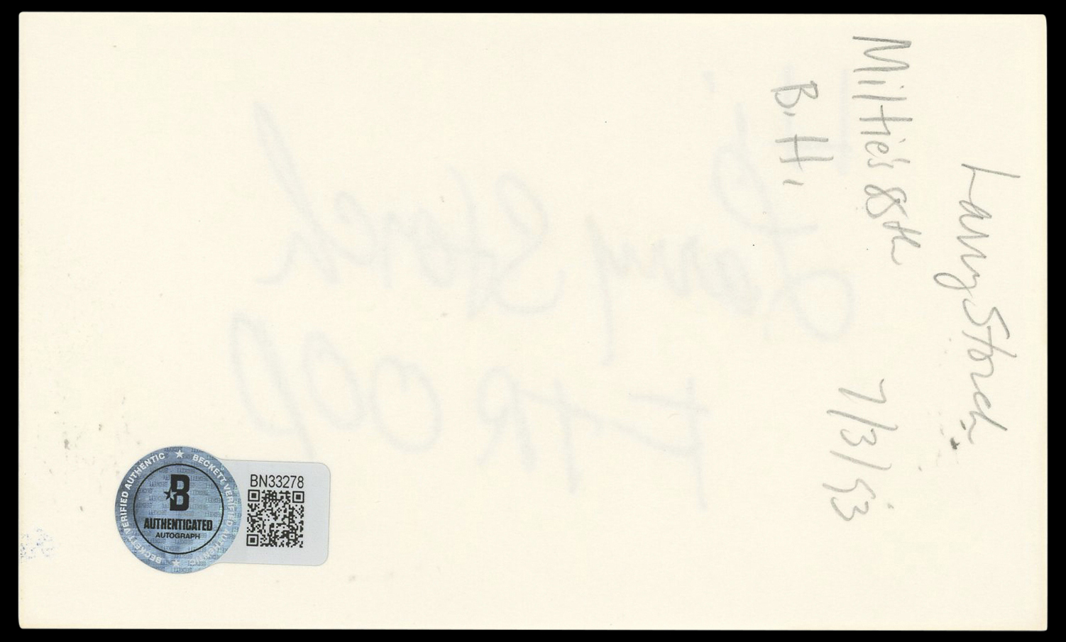 The authenticity can be verified on Beckett Authentication Services website. This Autographed 3x5 Index Card with the inscription of "Hi, F Troop" has been Personally Signed by Larry Storch of F Troop. This item is 100% Authentic to include a hologram by Beckett Authentication Services. This item will come with an affixed Beckett Authentication Services (BAS) authentication sticker, which includes a scannable QR code to verify authenticity. Please note that Beckett no longer provides serial-numbered COA cards, and the attached BAS sticker will serve as the complete authentication for this item. The authenticity can be verified on Beckett Authentication Services website.