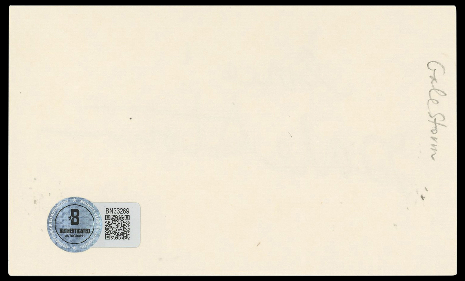 The authenticity can be verified on Beckett Authentication Services website. This Autographed 3x5 Index Card with the inscription of "Love!" has been Personally Signed by Gale Storm of My Little Margie. This item is 100% Authentic to include a hologram by Beckett Authentication Services. This item will come with an affixed Beckett Authentication Services (BAS) authentication sticker, which includes a scannable QR code to verify authenticity. Please note that Beckett no longer provides serial-numbered COA cards, and the attached BAS sticker will serve as the complete authentication for this item. The authenticity can be verified on Beckett Authentication Services website.