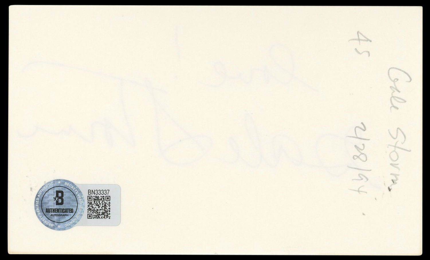 The authenticity can be verified on Beckett Authentication Services website. This Autographed 3x5 Index Card with the inscription of "Love!" has been Personally Signed by Gale Storm of My Little Margie. This item is 100% Authentic to include a hologram by Beckett Authentication Services. This item will come with an affixed Beckett Authentication Services (BAS) authentication sticker, which includes a scannable QR code to verify authenticity. Please note that Beckett no longer provides serial-numbered COA cards, and the attached BAS sticker will serve as the complete authentication for this item. The authenticity can be verified on Beckett Authentication Services website.