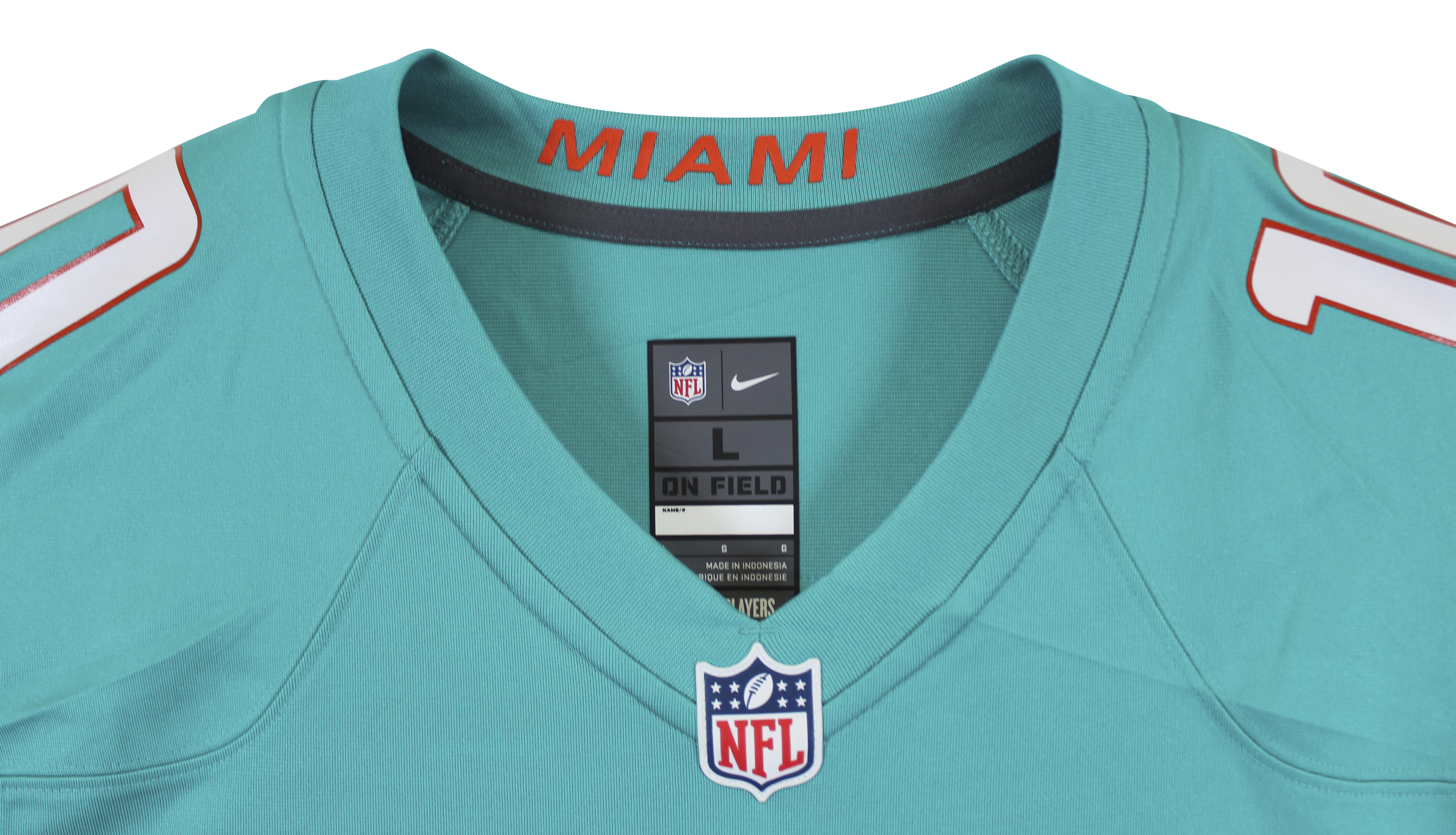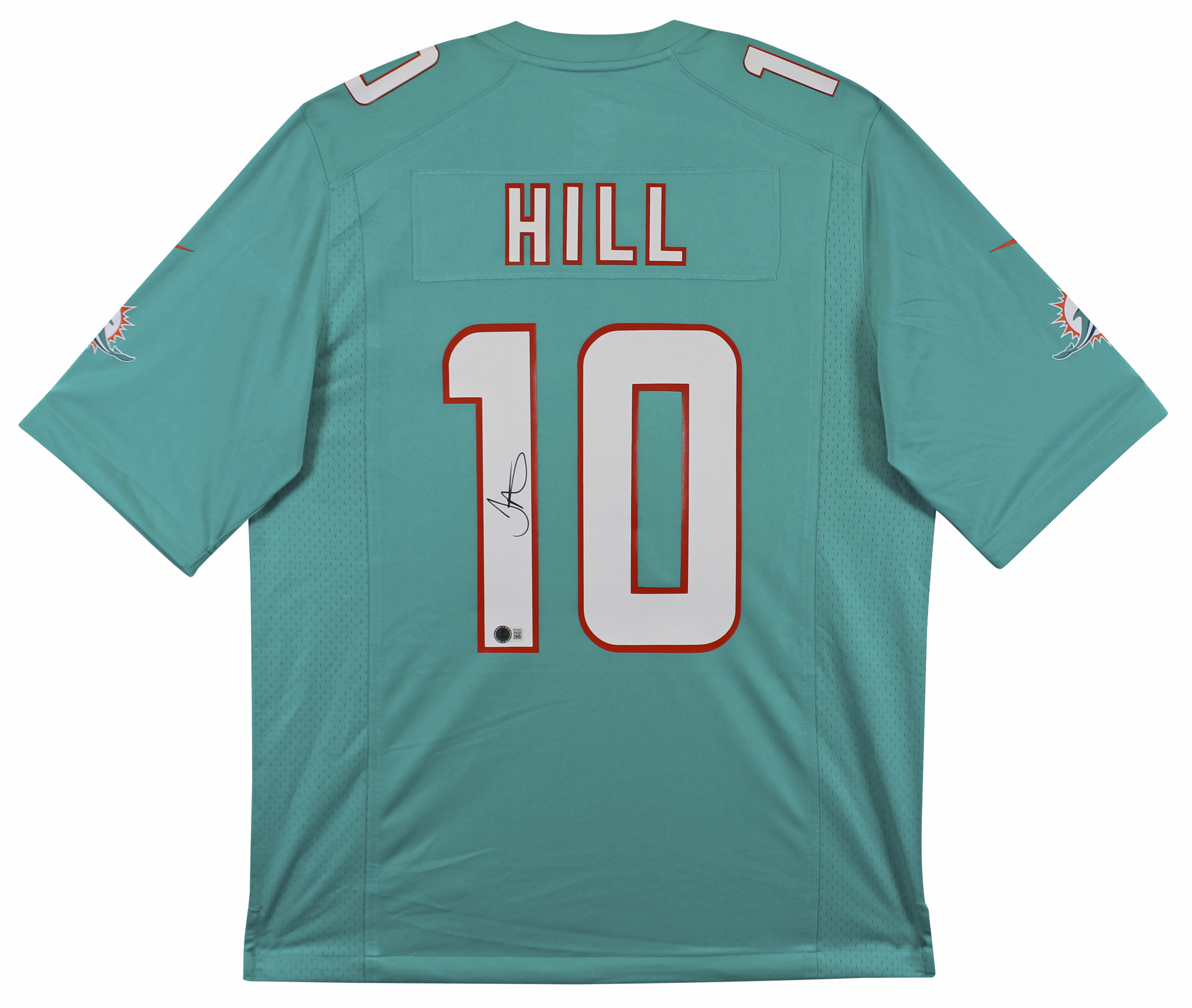 This Autographed Teal Nike Game Jersey has been Personally Signed by Tyreek Hill of the Miami Dolphins. This item is 100% Authentic to include a hologram by Beckett Authentication Services. This item will come with an affixed Beckett Authentication Services (BAS) authentication sticker, which includes a scannable QR code to verify authenticity. Please note that Beckett no longer provides serial-numbered COA cards, and the attached BAS sticker will serve as the complete authentication for this item. This is a BAS Witnessed Protection Program item which means a Beckett Authentication Service representative was present when this item was being signed. We conducted an autograph signing with Tyreek Hill where multiples of the same item were signed. While the photographs are representative of this item, the size, placement and strength of the signature may vary. Each item is hand signed, therefore, each autograph is unique. This item can be verified through BAS Witnessed. This is a Large sized Jersey.