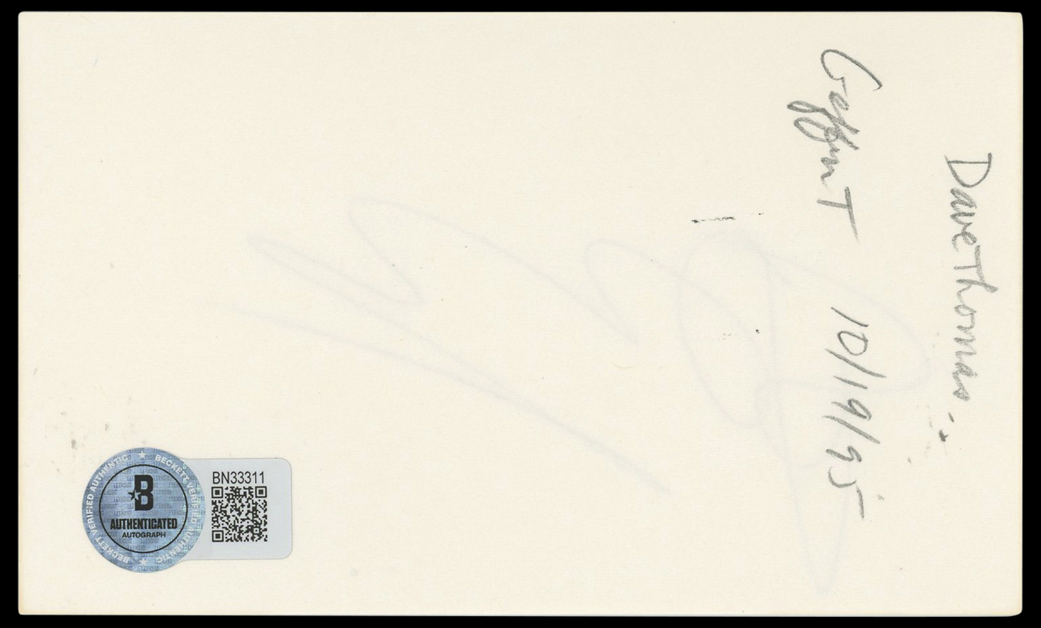 The authenticity can be verified on Beckett Authentication Services website. This Autographed 3x5 Index Card has been Personally Signed by Dave Thomas of Rat Race. This item is 100% Authentic to include a hologram by Beckett Authentication Services. This item will come with an affixed Beckett Authentication Services (BAS) authentication sticker, which includes a scannable QR code to verify authenticity. Please note that Beckett no longer provides serial-numbered COA cards, and the attached BAS sticker will serve as the complete authentication for this item. The authenticity can be verified on Beckett Authentication Services website.