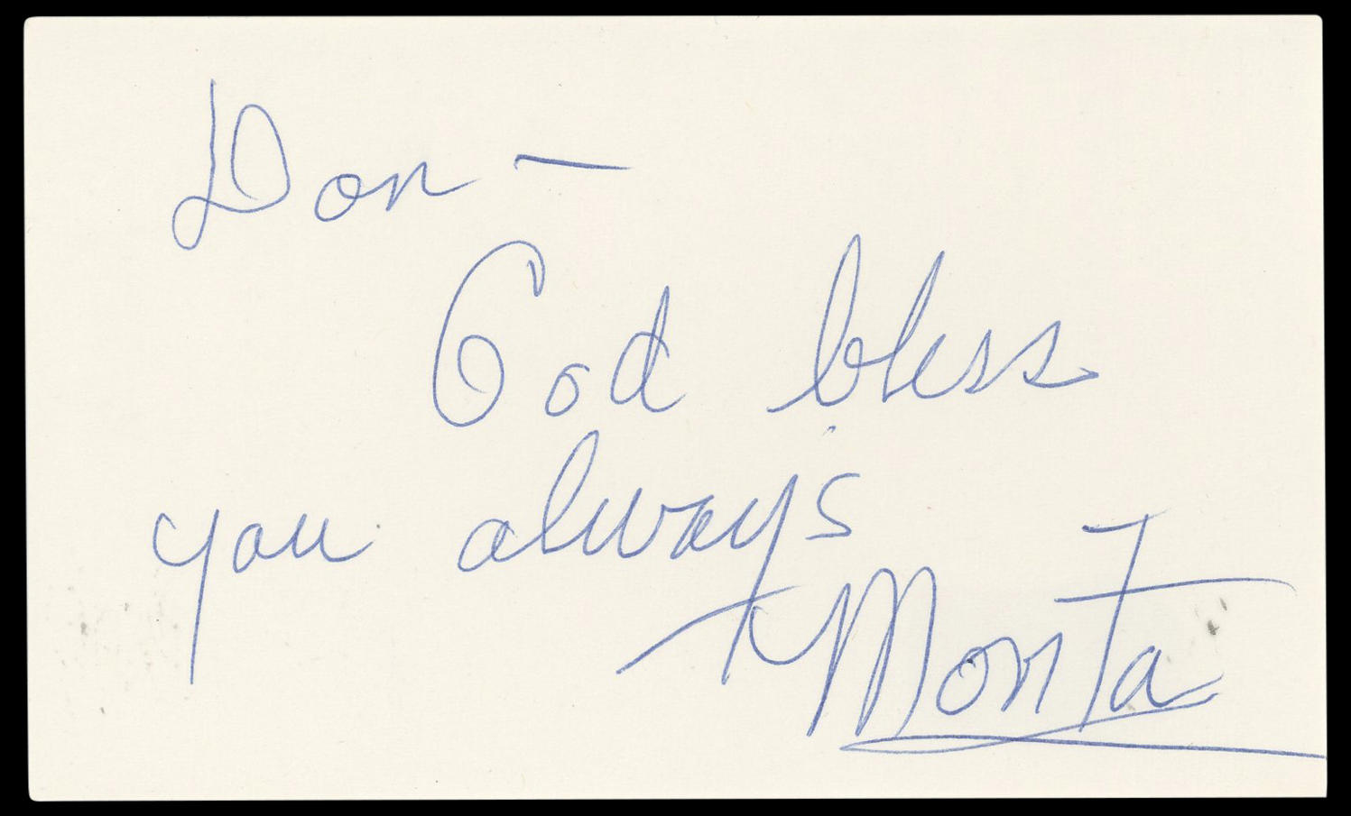 The authenticity can be verified on Beckett Authentication Services website. This Autographed 3x5 Index Card with the inscription of "Don- God bless you always" has been Personally Signed by Movita Castaneda of Mutiny On The Bounty. This item is 100% Authentic to include a hologram by Beckett Authentication Services. This item will come with an affixed Beckett Authentication Services (BAS) authentication sticker, which includes a scannable QR code to verify authenticity. Please note that Beckett no longer provides serial-numbered COA cards, and the attached BAS sticker will serve as the complete authentication for this item. The authenticity can be verified on Beckett Authentication Services website.