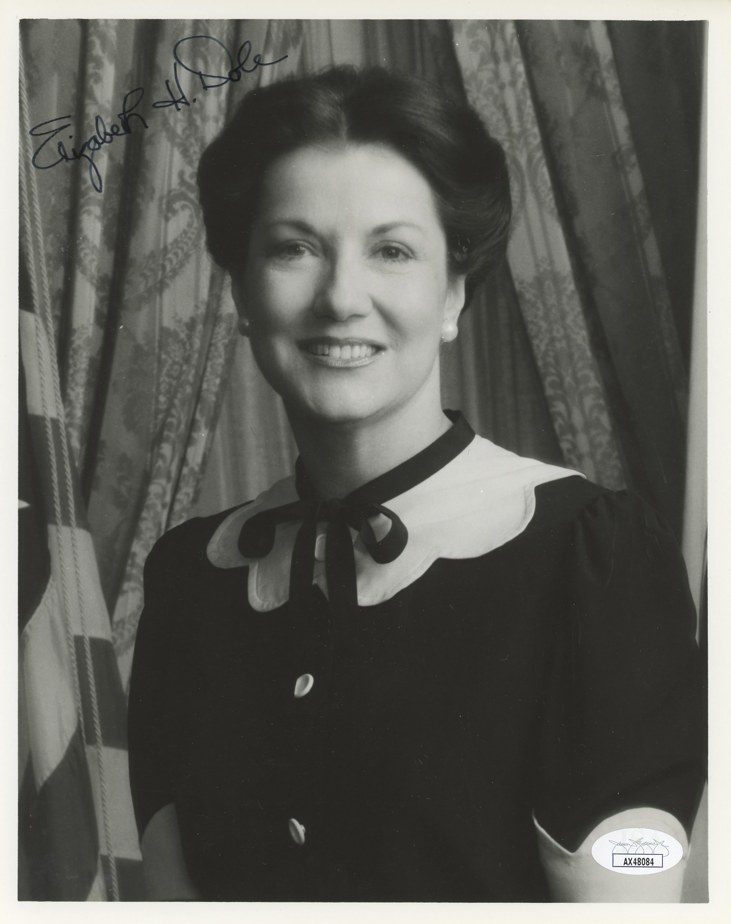 This Autographed 8x10 Photo has been Personally Signed by Elizabeth Dole. This item is 100% Authentic to include a Certificate of Authenticity (COA) / hologram by JSA. The authenticity can be verified on JSA website. This photo will have some light handling wear due to age and handling.