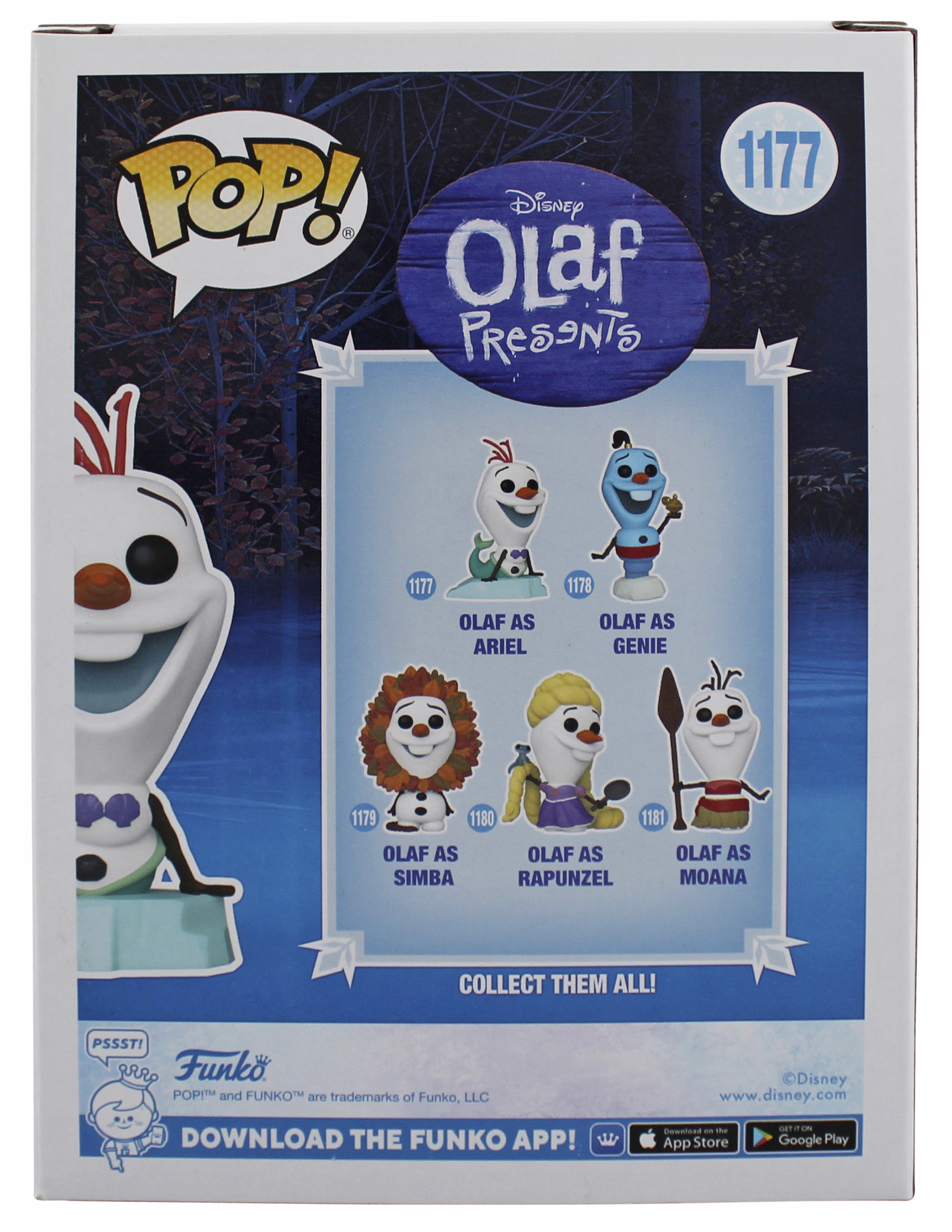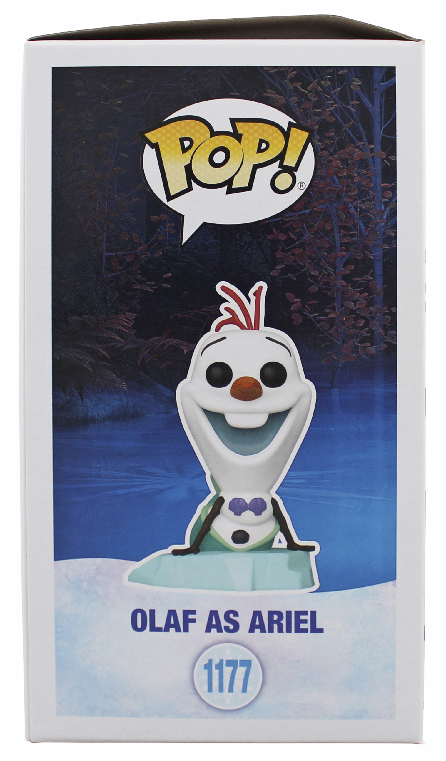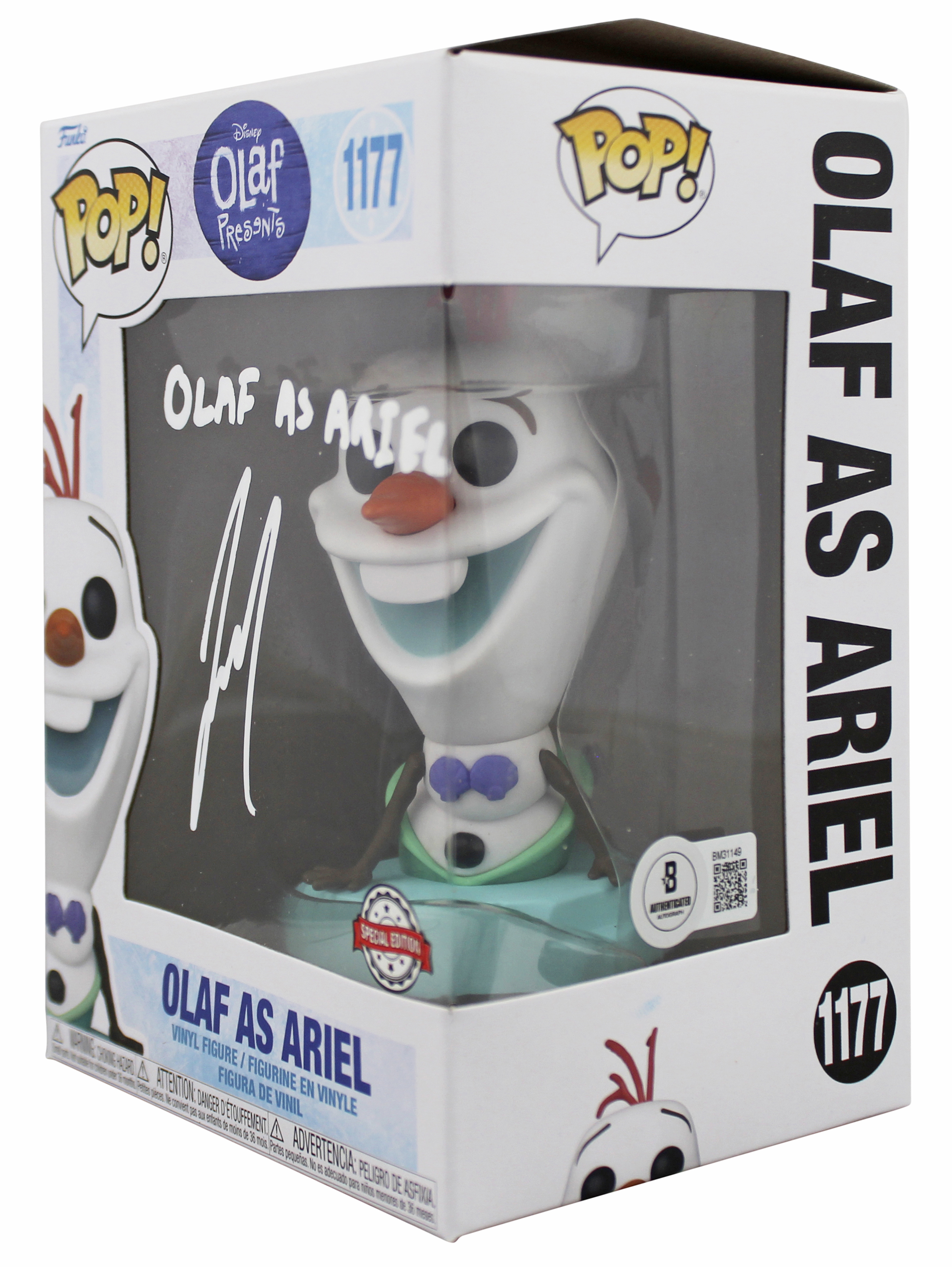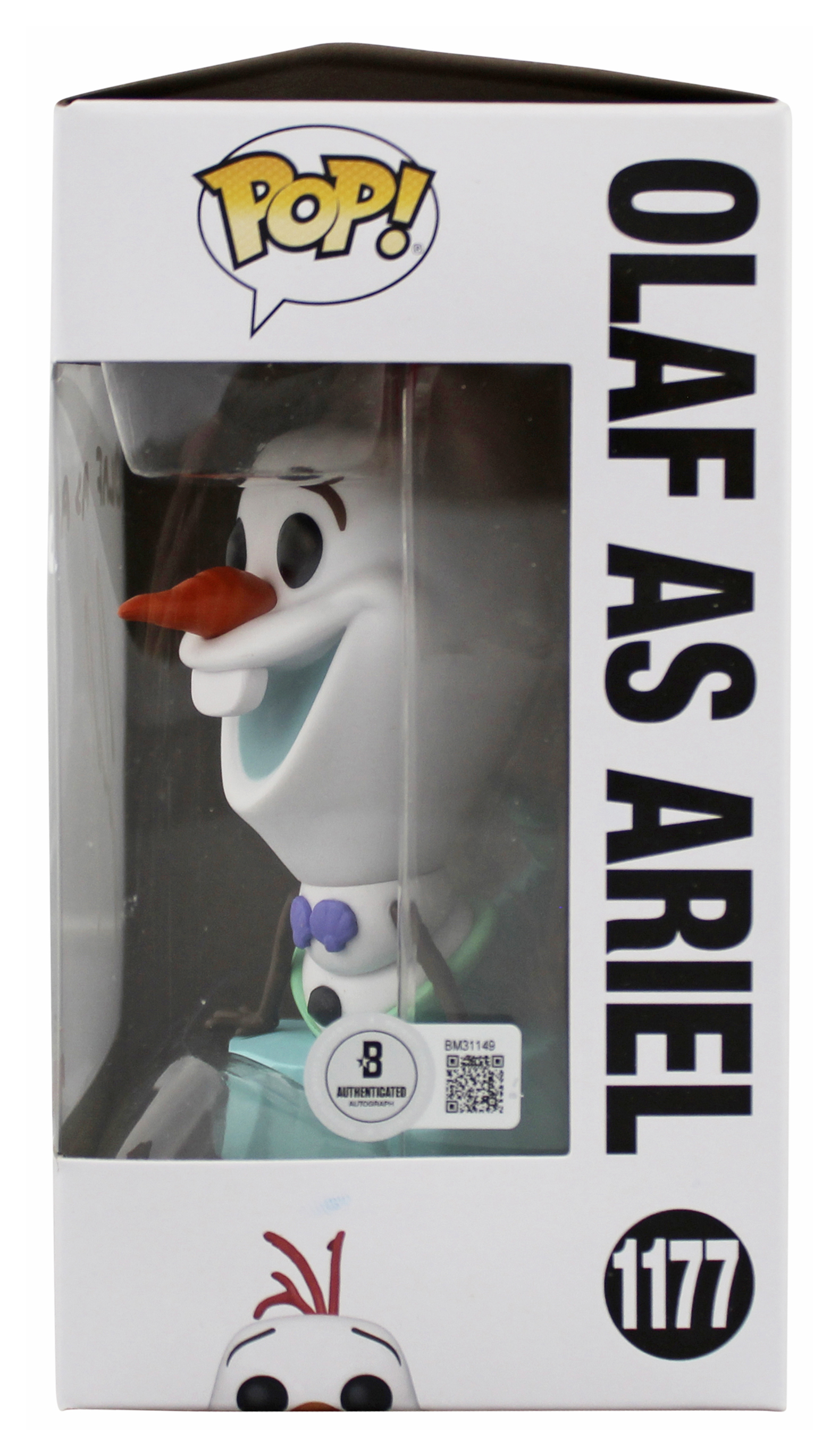 This Autographed #1177 Olaf as Ariel Funko Pop Vinyl Figure with the inscription of "Olaf as Ariel" has been Personally Signed by Josh Gad of Frozen. This item is 100% Authentic to include a hologram by Beckett Authentication Services. This item will come with an affixed Beckett Authentication Services (BAS) authentication sticker, which includes a scannable QR code to verify authenticity. Please note that Beckett no longer provides serial-numbered COA cards, and the attached BAS sticker will serve as the complete authentication for this item. We have multiples of this same item. While the photographs are representative of this item, the size, placement and strength of the signature may vary. Each item is hand signed, therefore, each autograph is unique. This item will ship in a Pop! Protector, please refer to the photos for condition of the item prior to purchase, these are in good condition but would not be considered mint.