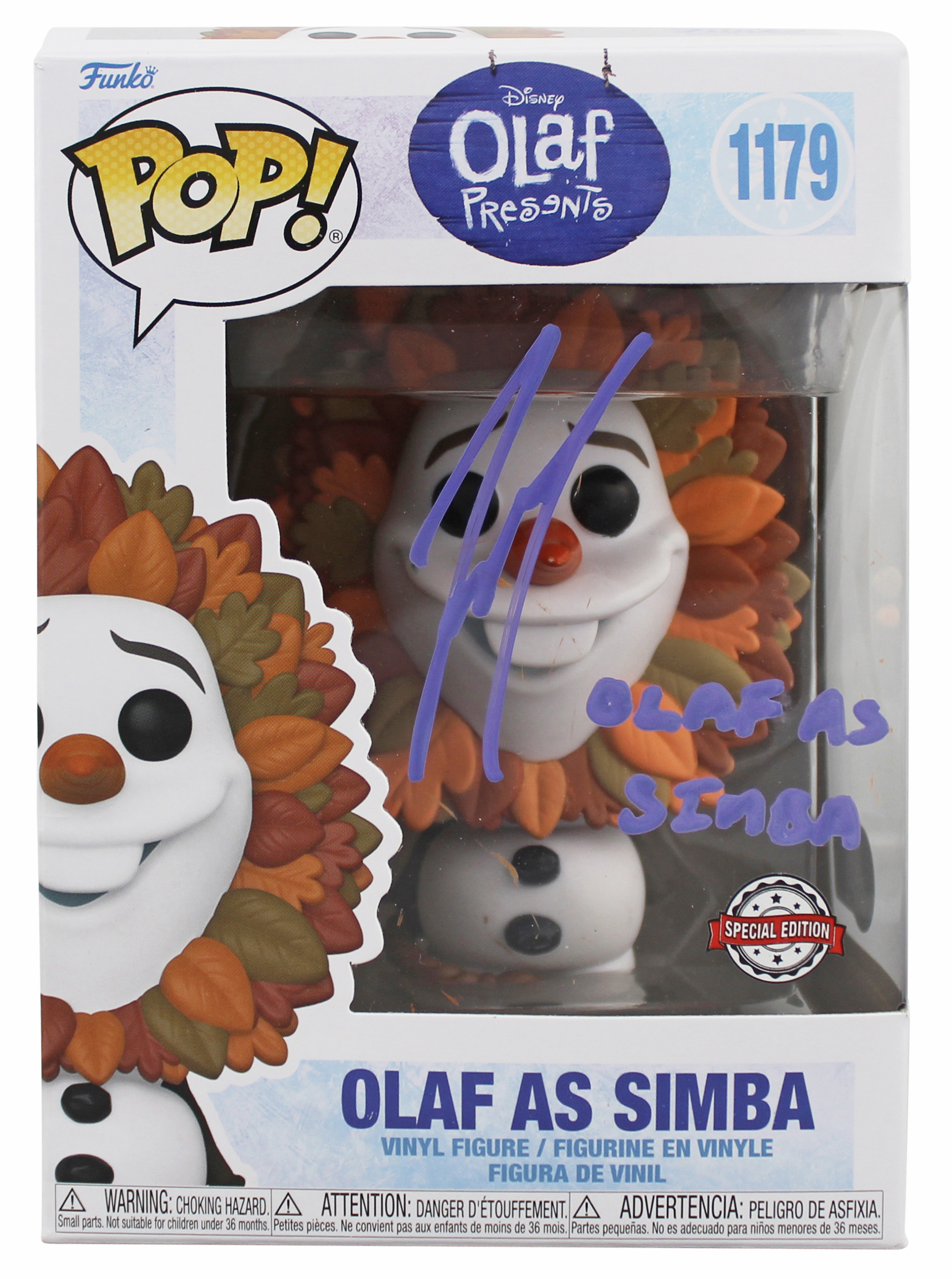 This Autographed #1179 Olaf as Simba Funko Pop Vinyl Figure with the inscription of "Olaf as Simba" has been Personally Signed by Josh Gad of Frozen. This item is 100% Authentic to include a hologram by Beckett Authentication Services. This item will come with an affixed Beckett Authentication Services (BAS) authentication sticker, which includes a scannable QR code to verify authenticity. Please note that Beckett no longer provides serial-numbered COA cards, and the attached BAS sticker will serve as the complete authentication for this item. We have multiples of this same item. While the photographs are representative of this item, the size, placement and strength of the signature may vary. Each item is hand signed, therefore, each autograph is unique. This item will ship in a Pop! Protector, please refer to the photos for condition of the item prior to purchase, these are in good condition but would not be considered mint.