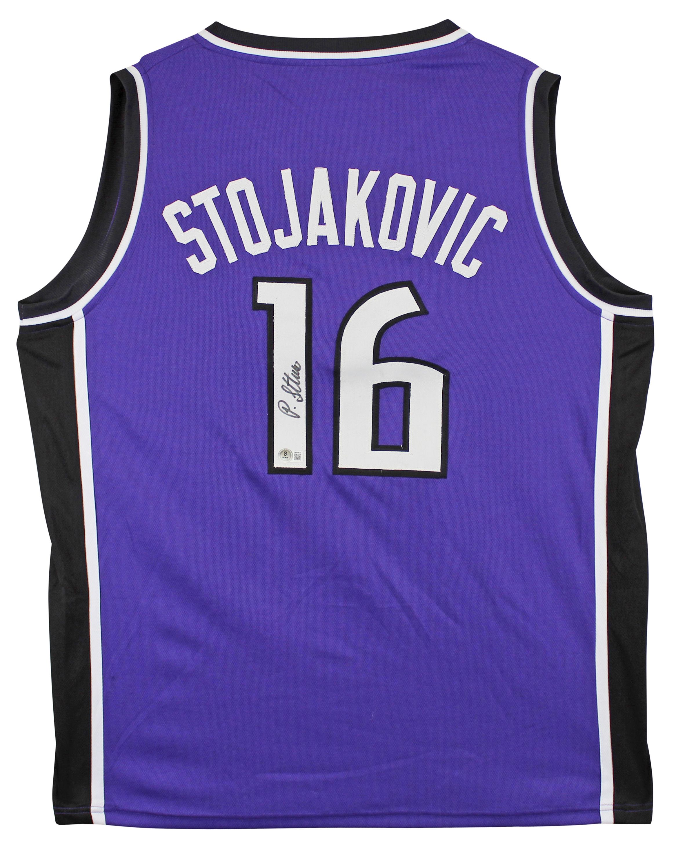 This Autographed Purple Pro Style Jersey has been Personally Signed by Peja Stojakovic of the Sacramento Kings. This item is 100% Authentic to include a hologram by Beckett Authentication Services. This item will come with an affixed Beckett Authentication Services (BAS) authentication sticker, which includes a scannable QR code to verify authenticity. Please note that Beckett no longer provides serial-numbered COA cards, and the attached BAS sticker will serve as the complete authentication for this item. This is a BAS Witnessed Protection Program item which means a Beckett Authentication Service representative was present when this item was being signed. We conducted an autograph signing with Peja Stojakovic where multiples of the same item were signed. While the photographs are representative of this item, the size, placement and strength of the signature may vary. Each item is hand signed, therefore, each autograph is unique. This item can be verified through BAS Witnessed. This is a X-Large sized, non-branded, custom-stitched Jersey.