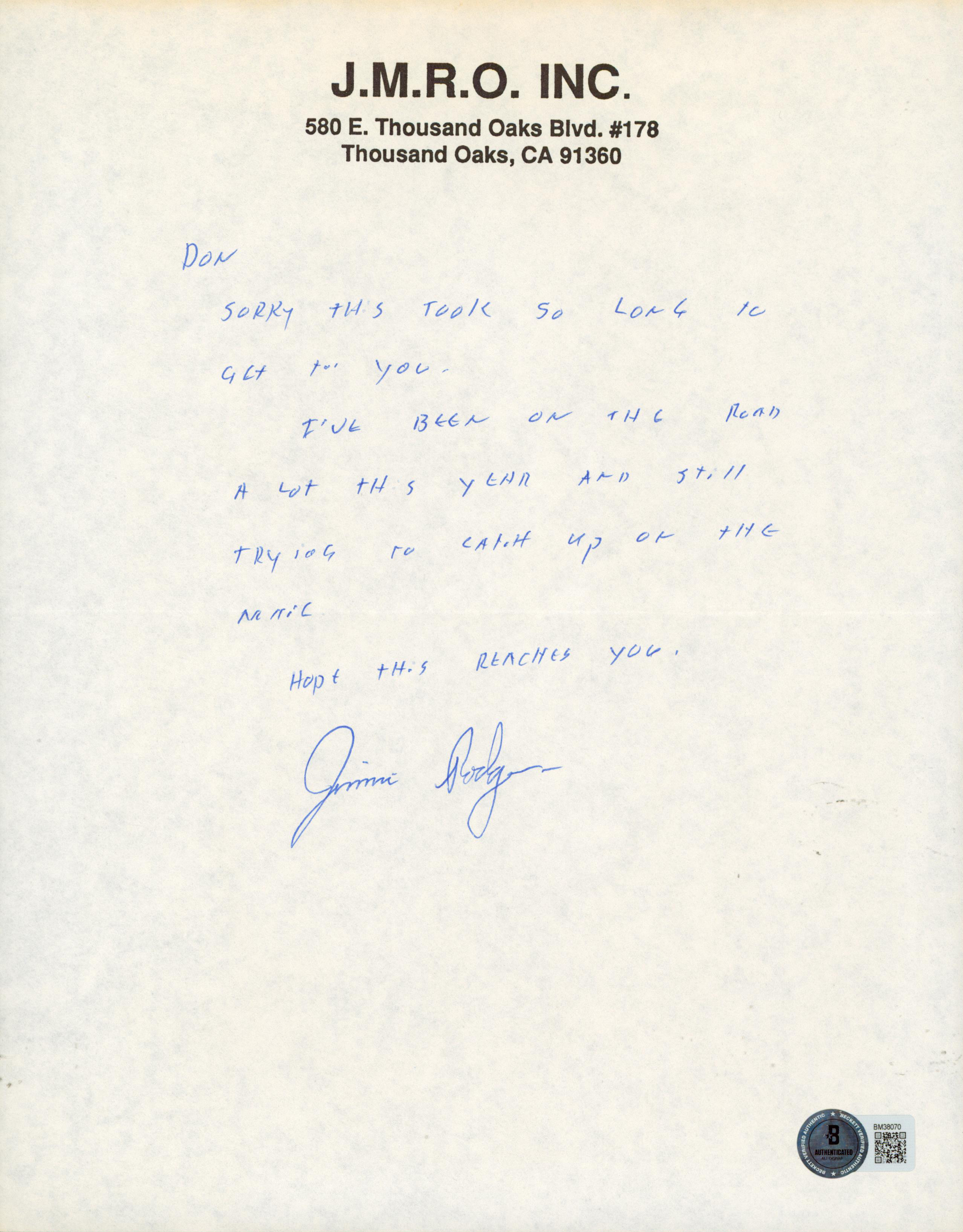 This Autographed 8.5x11 Handwritten Letter has been Personally Signed by Jimmie Rogers of Musician. This item is 100% Authentic to include a hologram by Beckett Authentication Services. This item will come with an affixed Beckett Authentication Services (BAS) authentication sticker, which includes a scannable QR code to verify authenticity. Please note that Beckett no longer provides serial-numbered COA cards, and the attached BAS sticker will serve as the complete authentication for this item. The authenticity can be verified on Beckett Authentication Services website.
