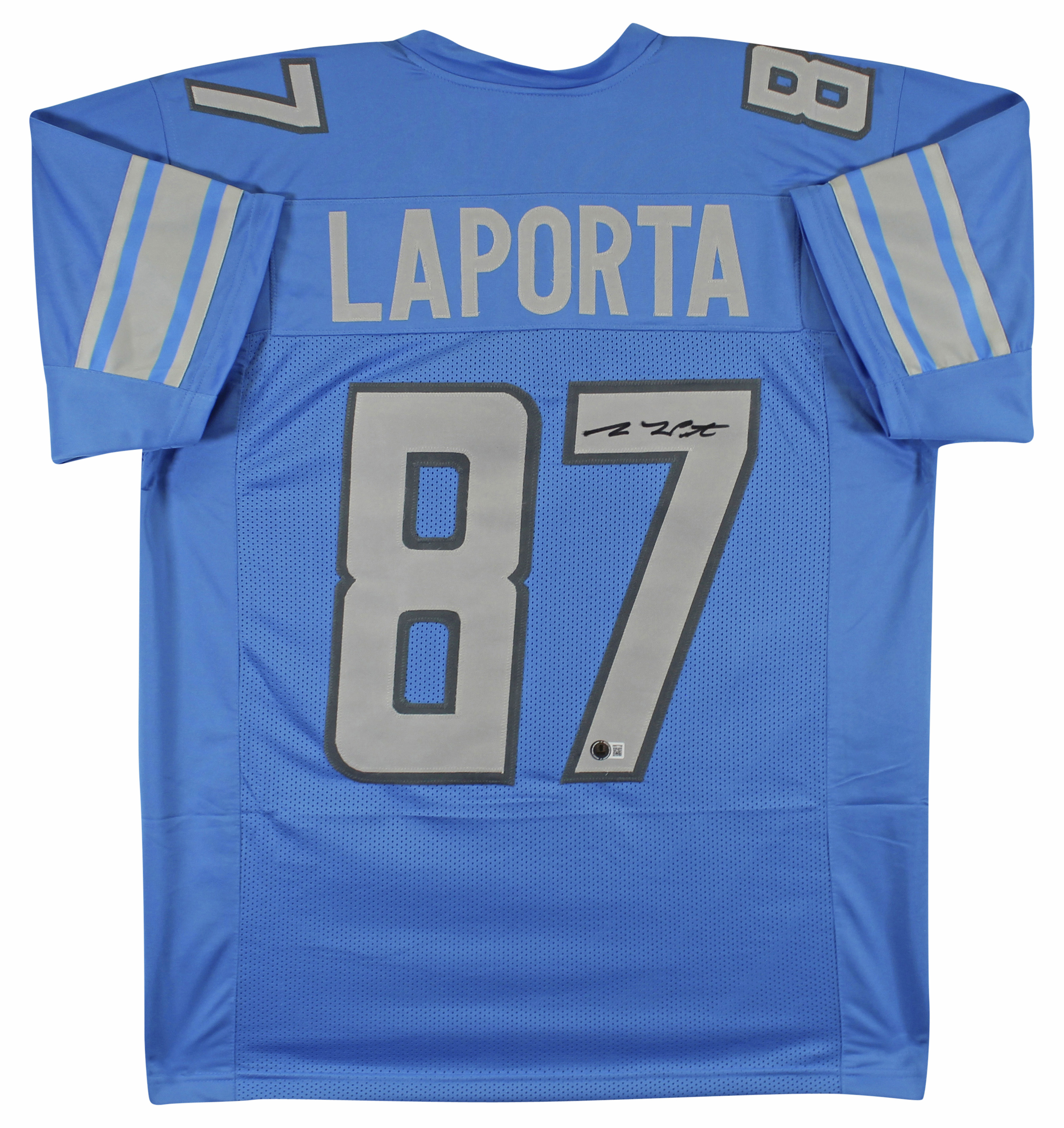 This Autographed Blue Pro Style Jersey has been Personally Signed by Sam Laporta of the Detroit Lions. This item is 100% Authentic to include a hologram by Beckett Authentication Services. This item will come with an affixed Beckett Authentication Services (BAS) authentication sticker, which includes a scannable QR code to verify authenticity. Please note that Beckett no longer provides serial-numbered COA cards, and the attached BAS sticker will serve as the complete authentication for this item. This is a BAS Witnessed Protection Program item which means a Beckett Authentication Service representative was present when this item was being signed. We conducted an autograph signing with Sam Laporta where multiples of the same item were signed. While the photographs are representative of this item, the size, placement and strength of the signature may vary. Each item is hand signed, therefore, each autograph is unique. This item can be verified through BAS Witnessed. This is a X-Large sized, non-branded, custom-stitched Jersey.