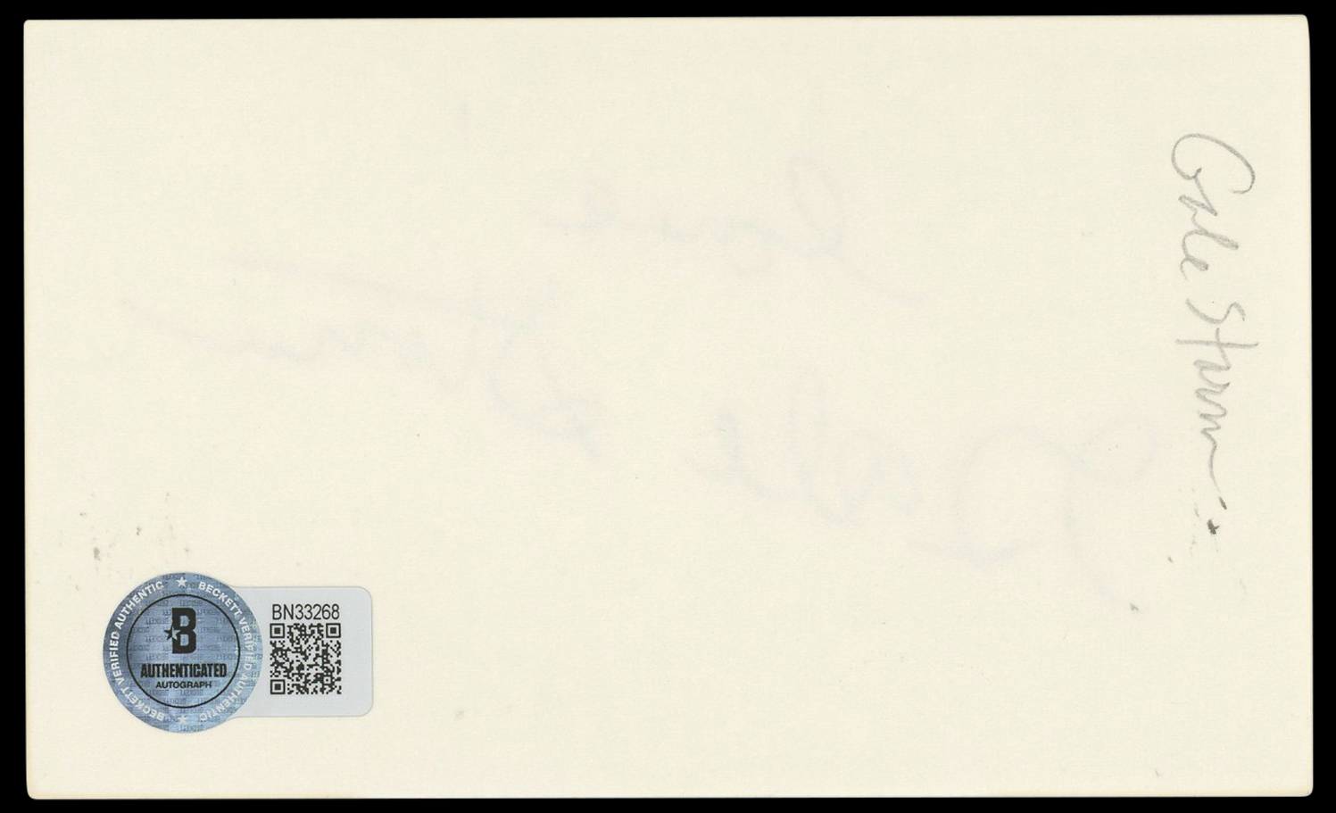 The authenticity can be verified on Beckett Authentication Services website. This Autographed 3x5 Index Card with the inscription of "Love!" has been Personally Signed by Gale Storm of My Little Margie. This item is 100% Authentic to include a hologram by Beckett Authentication Services. This item will come with an affixed Beckett Authentication Services (BAS) authentication sticker, which includes a scannable QR code to verify authenticity. Please note that Beckett no longer provides serial-numbered COA cards, and the attached BAS sticker will serve as the complete authentication for this item. The authenticity can be verified on Beckett Authentication Services website.
