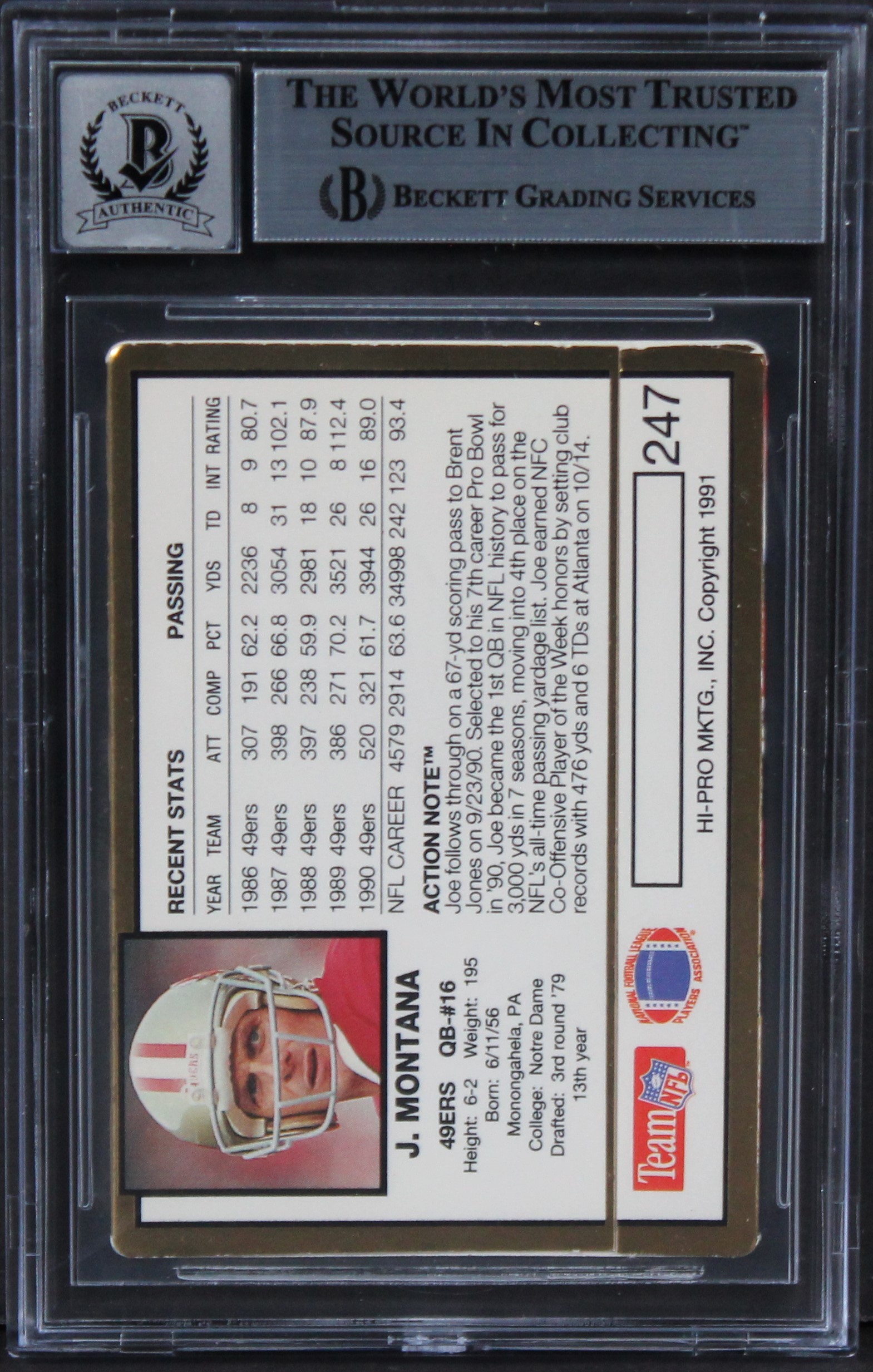 This Autographed Auto Graded Gem Mint 10! 1991 Action Packed #247 Card has been Personally Signed by Joe Montana of the San Francisco 49ers. This item is 100% Authentic, it comes slabbed and authenticated by Beckett Authentication Services. We have multiples of this same item. While the photographs are representative of this item, the size and placement of the signature may vary. Each item is hand signed, therefore, each autograph is unique.