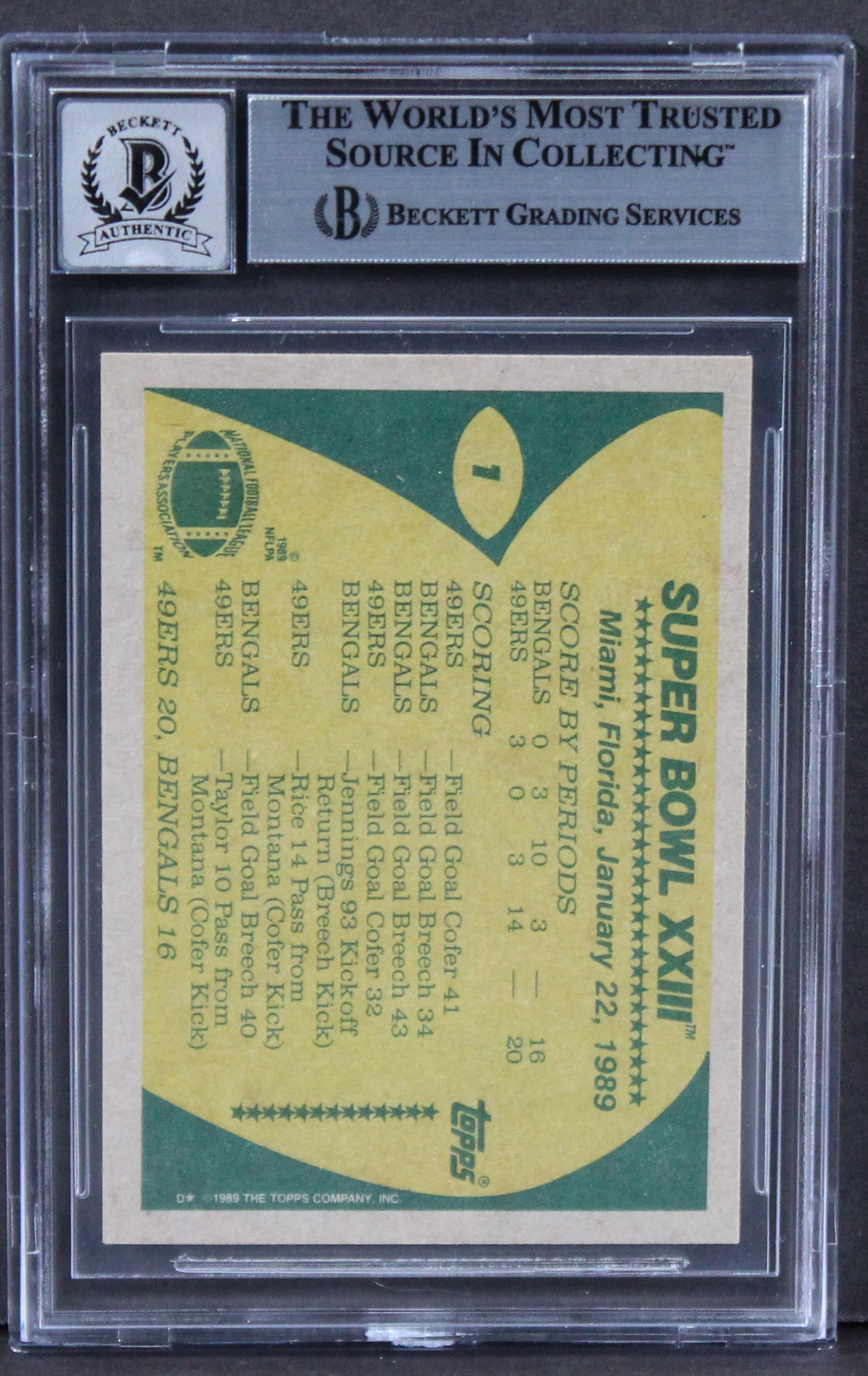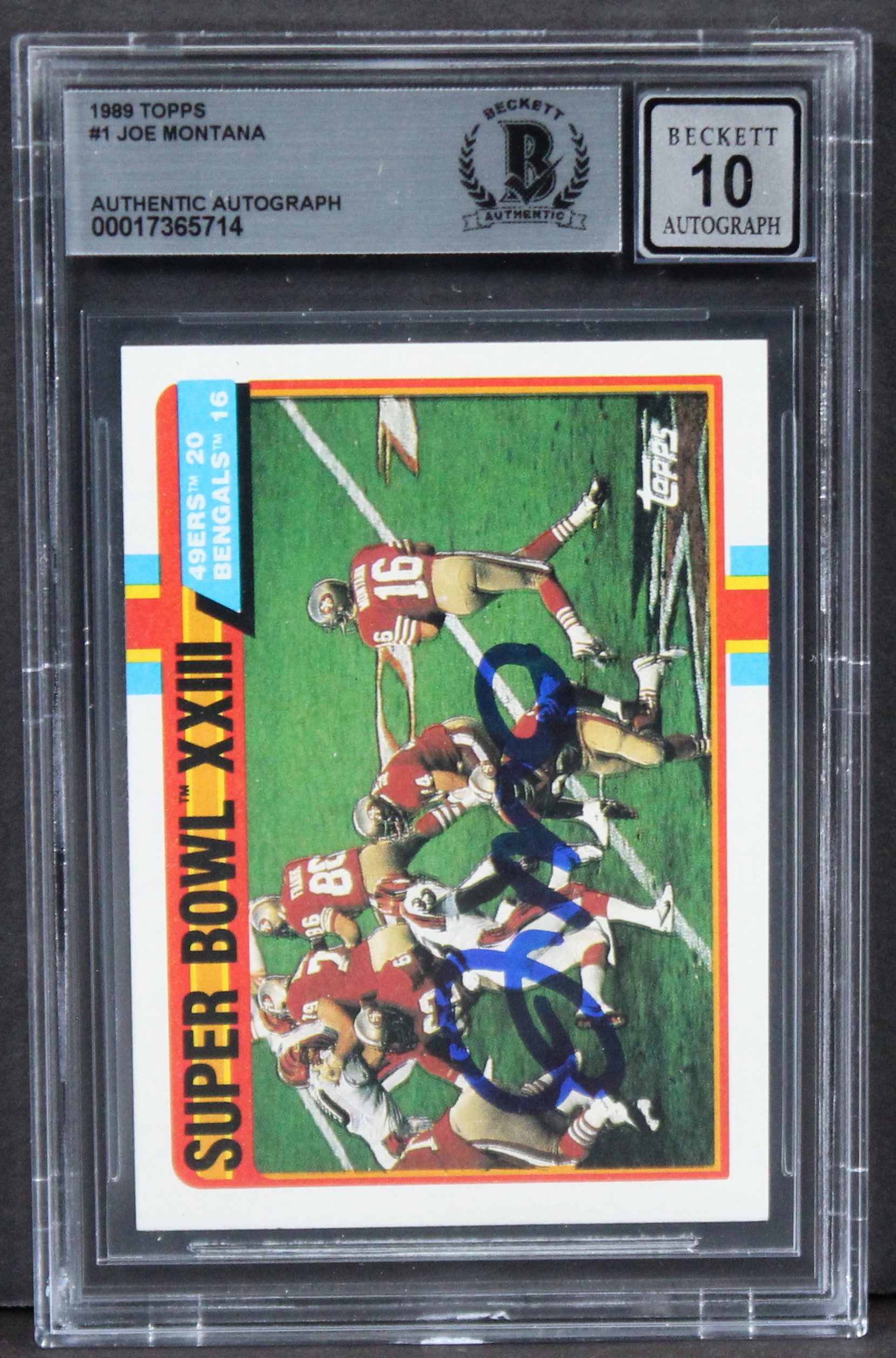 This Autographed Auto Graded Gem Mint 10! 1989 Topps #1 Joe Montana Card has been Personally Signed by Joe Montana of the San Francisco 49ers. This item is 100% Authentic, it comes slabbed and authenticated by Beckett Authentication Services. We have multiples of this same item. While the photographs are representative of this item, the size and placement of the signature may vary. Each item is hand signed, therefore, each autograph is unique.