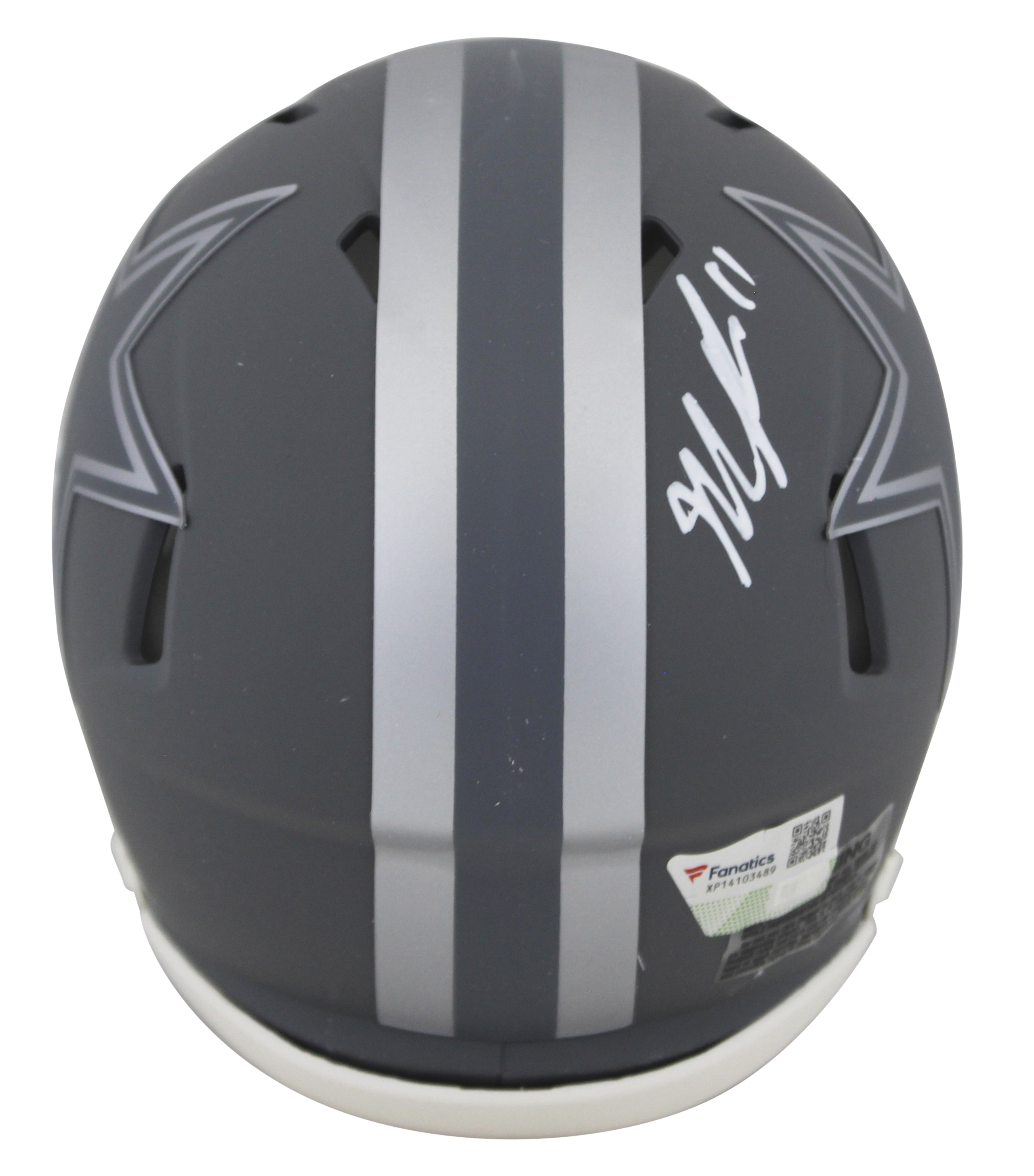 This Autographed Alternate Slate Speed Mini Helmet W/ Uv Mirrored Back Acrylic Display Case has been Personally Signed by Micah Parsons of the Dallas Cowboys. This item is 100% Authentic to includes a numbered hologram by Fanatics. We conducted an autograph signing with Micah Parsons where multiples of the same item were signed. While the photographs are representative of this item, the size, placement and strength of the signature may vary. Each item is hand signed, therefore, each autograph is unique. This item can be verified through Fanatics.