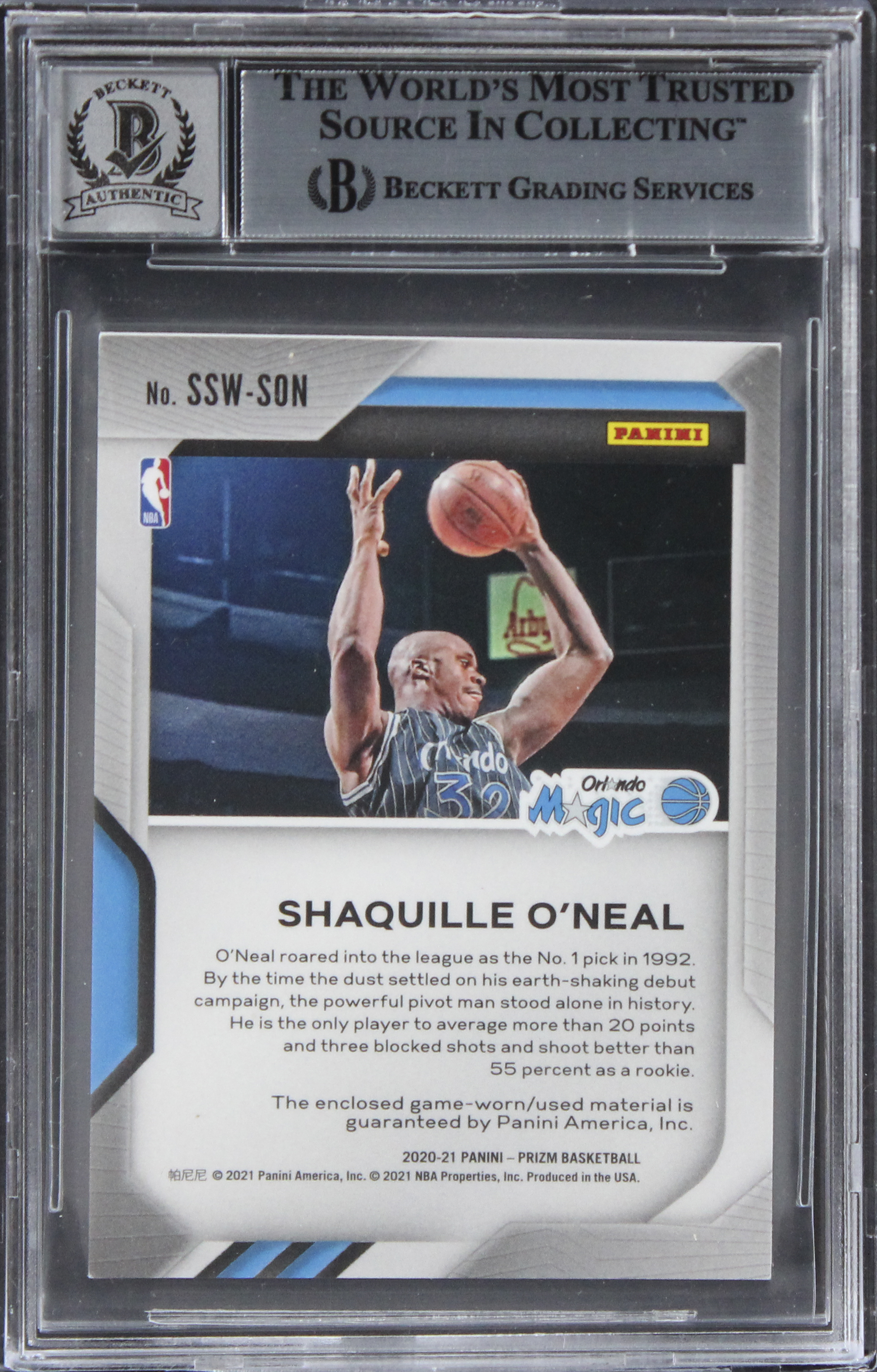 This Autographed Auto Graded Gem Mint 10! 2020 Panini Prizm Sensational Swatches #14 Card has been Personally Signed by Shaquille O'Neal of the Orlando Magic. This item is 100% Authentic, it comes slabbed and authenticated by Beckett Authentication Services. The authenticity can be verified on Beckett Authentication Services website.