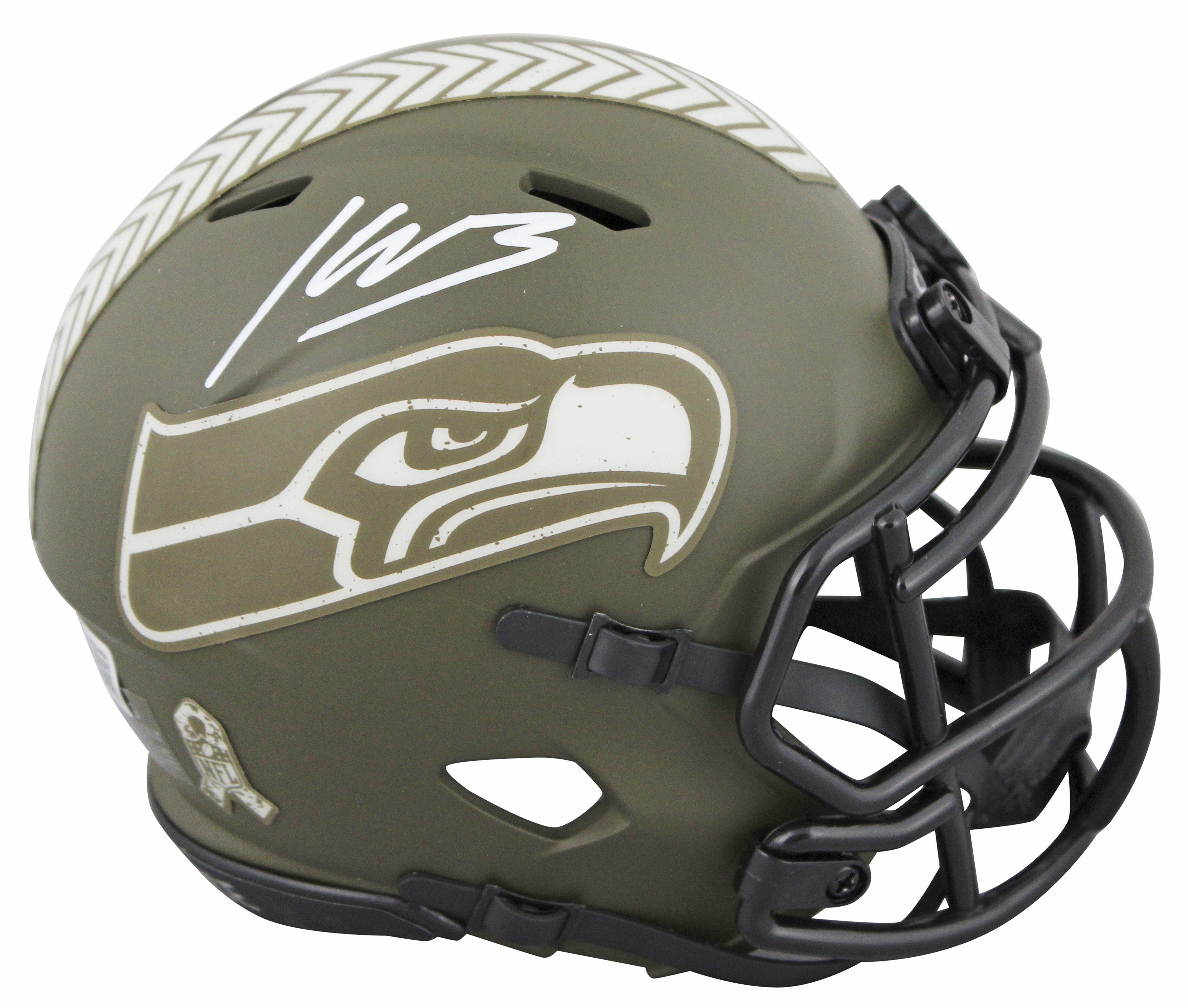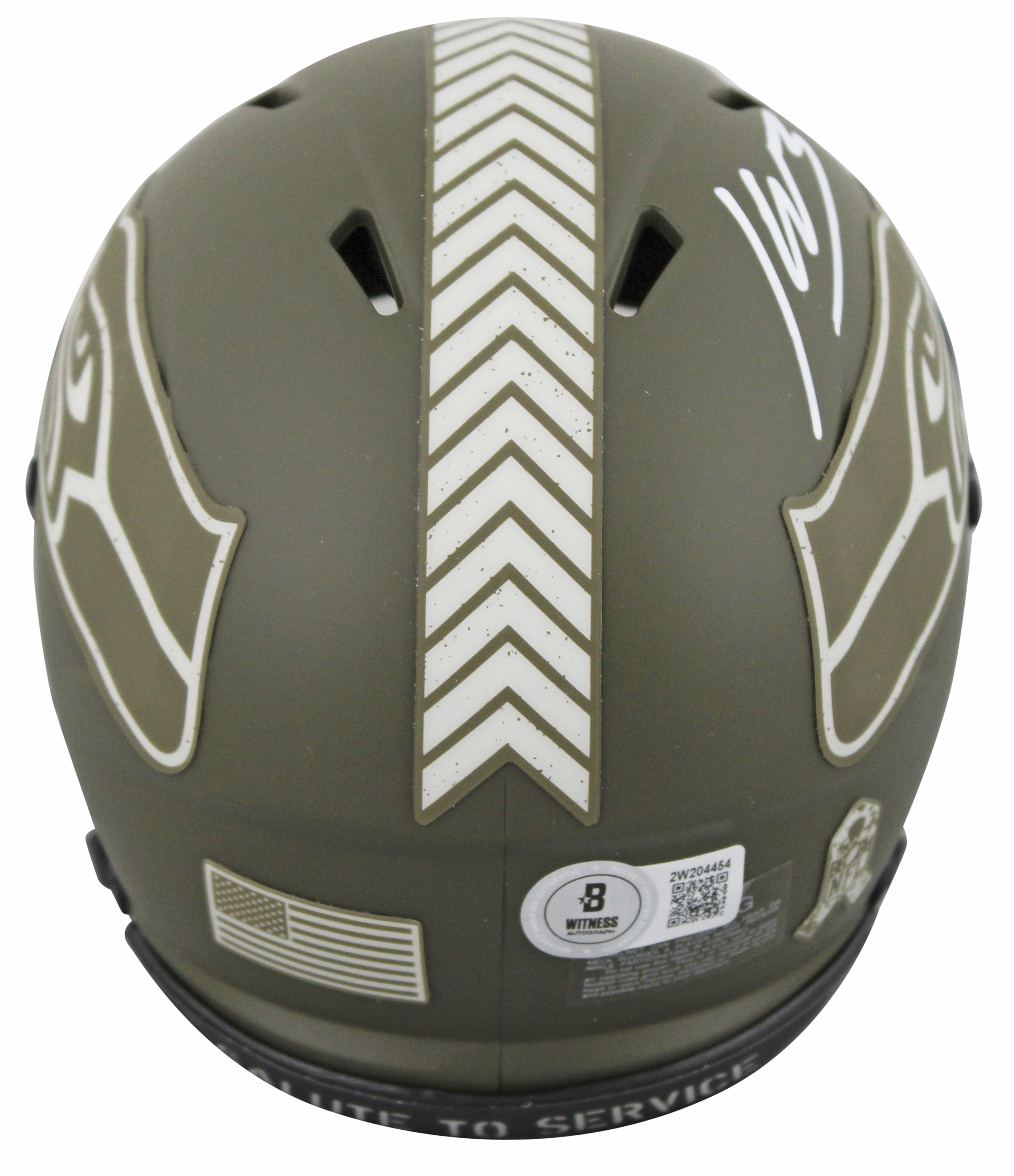 This Autographed Alternate Salute To Service Speed Mini Helmet W/ Uv Mirrored Back Acrylic Display Case has been Personally Signed by Kenneth Walker III of the Seattle Seahawks. This item is 100% Authentic to include a hologram by Beckett Authentication Services. This item will come with an affixed Beckett Authentication Services (BAS) authentication sticker, which includes a scannable QR code to verify authenticity. Please note that Beckett no longer provides serial-numbered COA cards, and the attached BAS sticker will serve as the complete authentication for this item. This is a BAS Witnessed Protection Program item which means a Beckett Authentication Service representative was present when this item was being signed. We conducted an autograph signing with Kenneth Walker III where multiples of the same item were signed. While the photographs are representative of this item, the size, placement and strength of the signature may vary. Each item is hand signed, therefore, each autograph is unique. This item can be verified through BAS Witnessed.