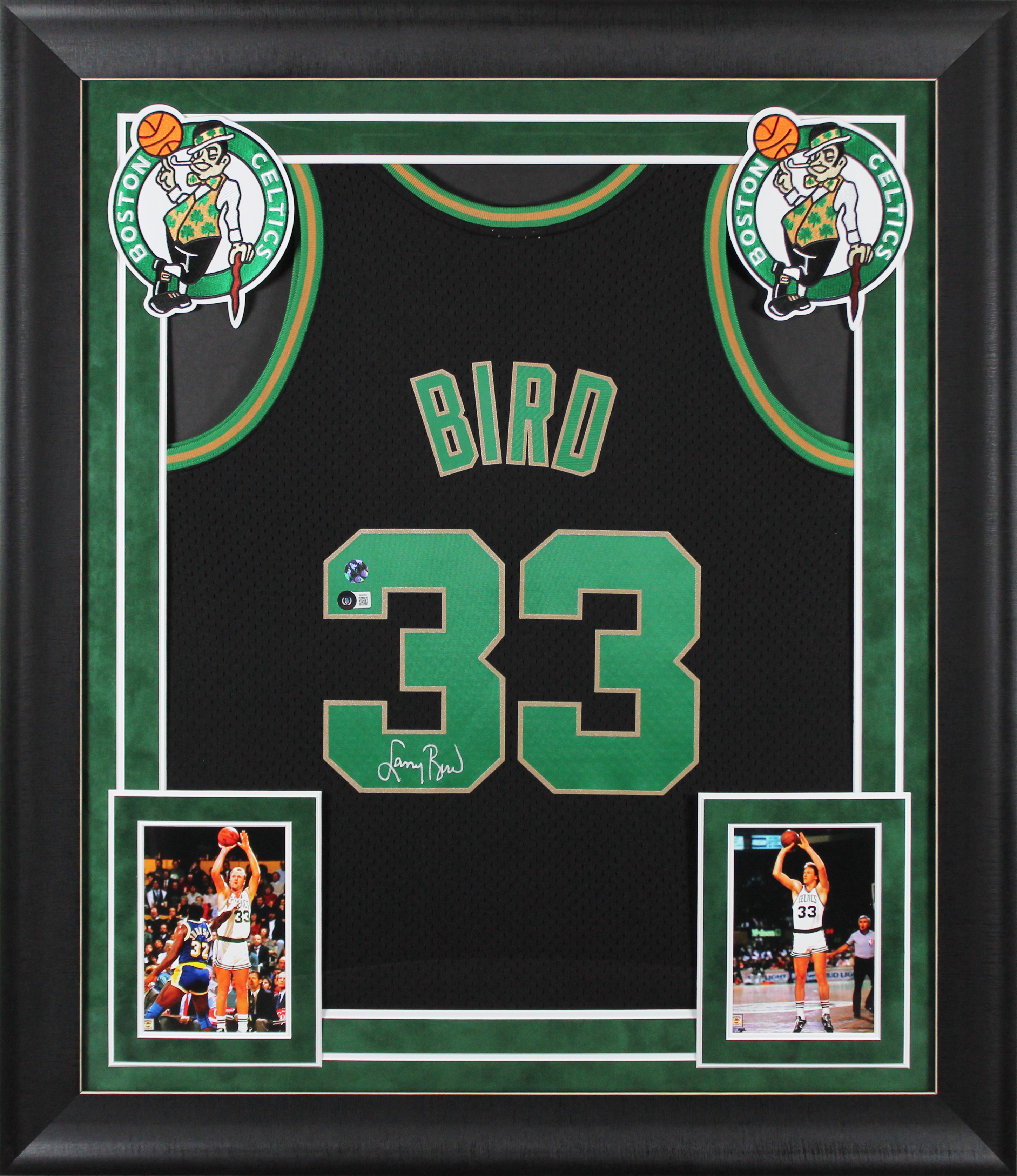 This Autographed Black Mitchell & Ness Hardwood Classics Swingman Framed Jersey has been Personally Signed by Larry Bird of the Boston Celtics. This item is 100% Authentic to include a hologram by Beckett Authentication Services. This item will come with an affixed Beckett Authentication Services (BAS) authentication sticker, which includes a scannable QR code to verify authenticity. Please note that Beckett no longer provides serial-numbered COA cards, and the attached BAS sticker will serve as the complete authentication for this item. This is a BAS Witnessed Protection Program item which means a Beckett Authentication Service representative was present when this item was being signed. We conducted an autograph signing with Larry Bird where multiples of the same item were signed. While the photographs are representative of this item, the size, placement and strength of the signature may vary. Each item is hand signed, therefore, each autograph is unique. This item can be verified through BAS Witnessed. This item has been professionally framed to overall dimensions of approximately 32 x 37 inches. This is a X-Large sized Framed Jersey. This jersey will be framed to order, it will take 3-4 days from purchase date for it to ship.