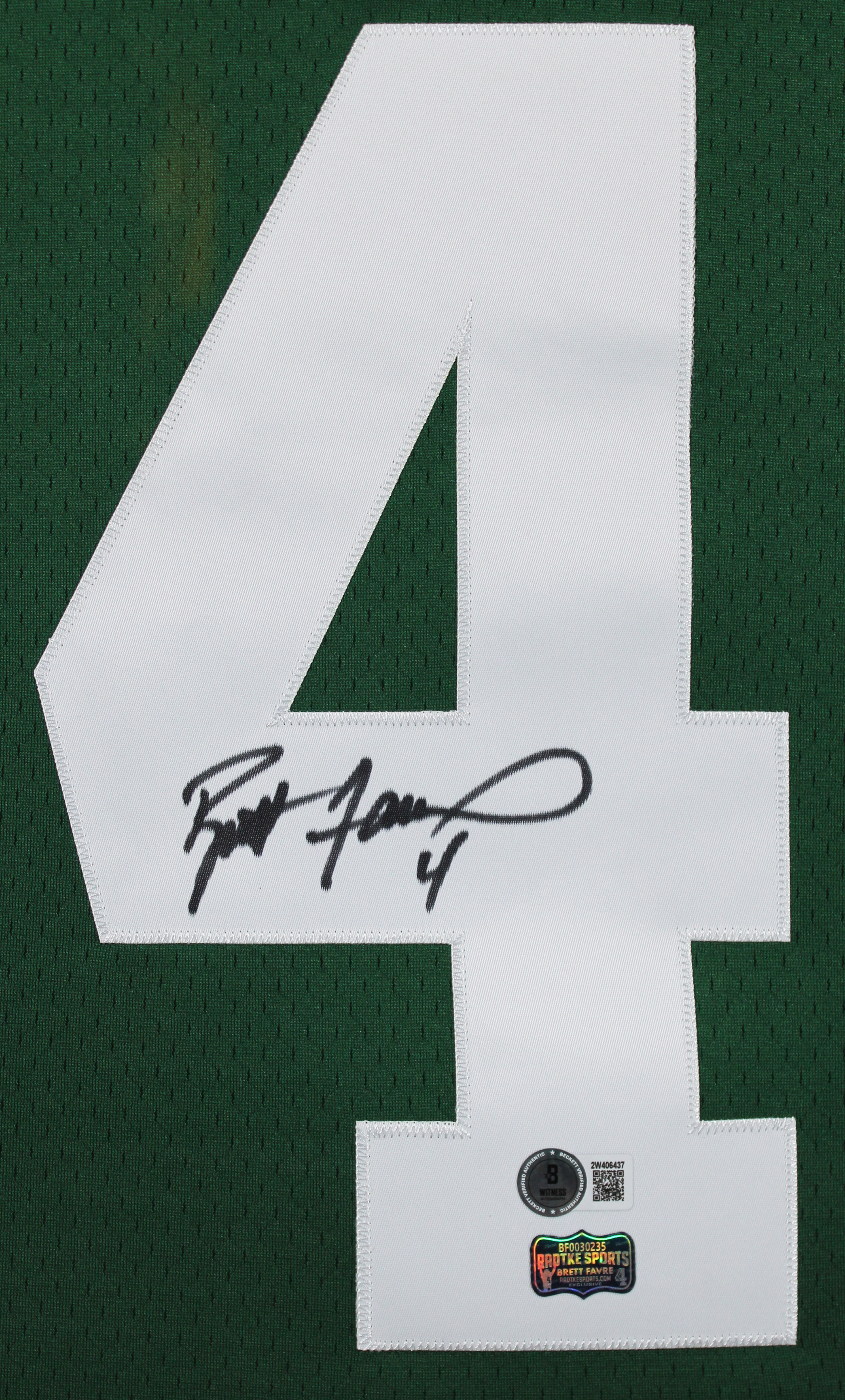 This Autographed Green 1996 Mitchell & Ness Throwback Framed Jersey has been Personally Signed by Brett Favre of the Green Bay Packers. This item is 100% Authentic to include a hologram by Beckett Authentication Services. This item will come with an affixed Beckett Authentication Services (BAS) authentication sticker, which includes a scannable QR code to verify authenticity. Please note that Beckett no longer provides serial-numbered COA cards, and the attached BAS sticker will serve as the complete authentication for this item. This is a BAS Witnessed Protection Program item which means a Beckett Authentication Service representative was present when this item was being signed. We have multiples of this same item. While the photographs are representative of this item, the size, placement and strength of the signature may vary. Each item is hand signed, therefore, each autograph is unique. This item has been professionally framed to overall dimensions of approximately 32 x 37 inches. This is a X-Large sized, non-branded, custom-stitched Framed Jersey. This jersey will be framed to order, it will take 3-4 days from purchase date for it to ship.
