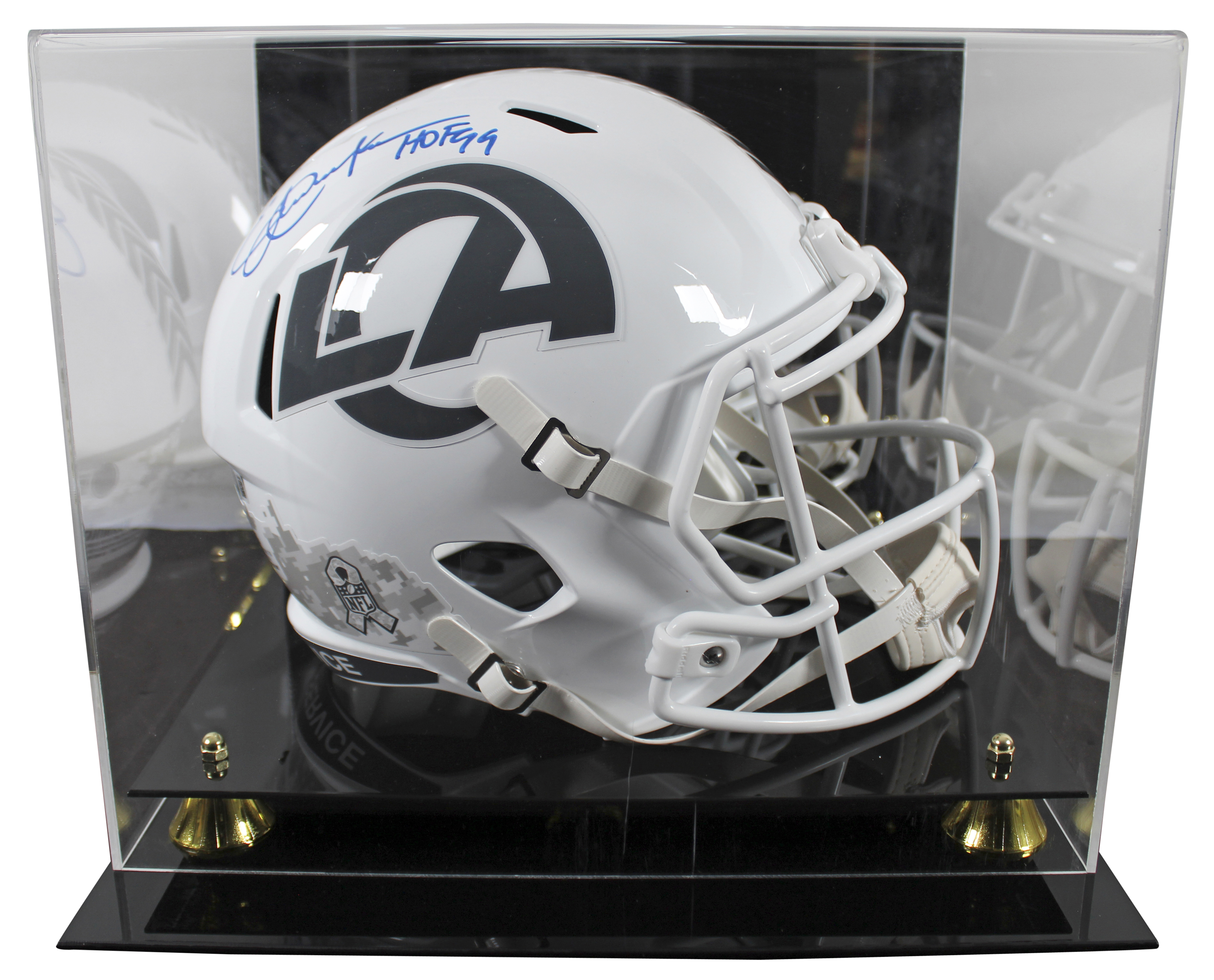 This Autographed Alternate 2024 Salute To Service III Riddell Full Size Speed Rep Helmet W/ Uv Mirrored Back Acrylic Display Case with the inscription of "HOF 99" has been Personally Signed by Eric Dickerson of the St. Louis Rams. This item is 100% Authentic to include a hologram by Beckett Authentication Services. This item will come with an affixed Beckett Authentication Services (BAS) authentication sticker, which includes a scannable QR code to verify authenticity. Please note that Beckett no longer provides serial-numbered COA cards, and the attached BAS sticker will serve as the complete authentication for this item. This is a BAS Witnessed Protection Program item which means a Beckett Authentication Service representative was present when this item was being signed. We conducted an autograph signing with Eric Dickerson where multiples of the same item were signed. While the photographs are representative of this item, the size, placement and strength of the signature may vary. Each item is hand signed, therefore, each autograph is unique. This item can be verified through BAS Witnessed.