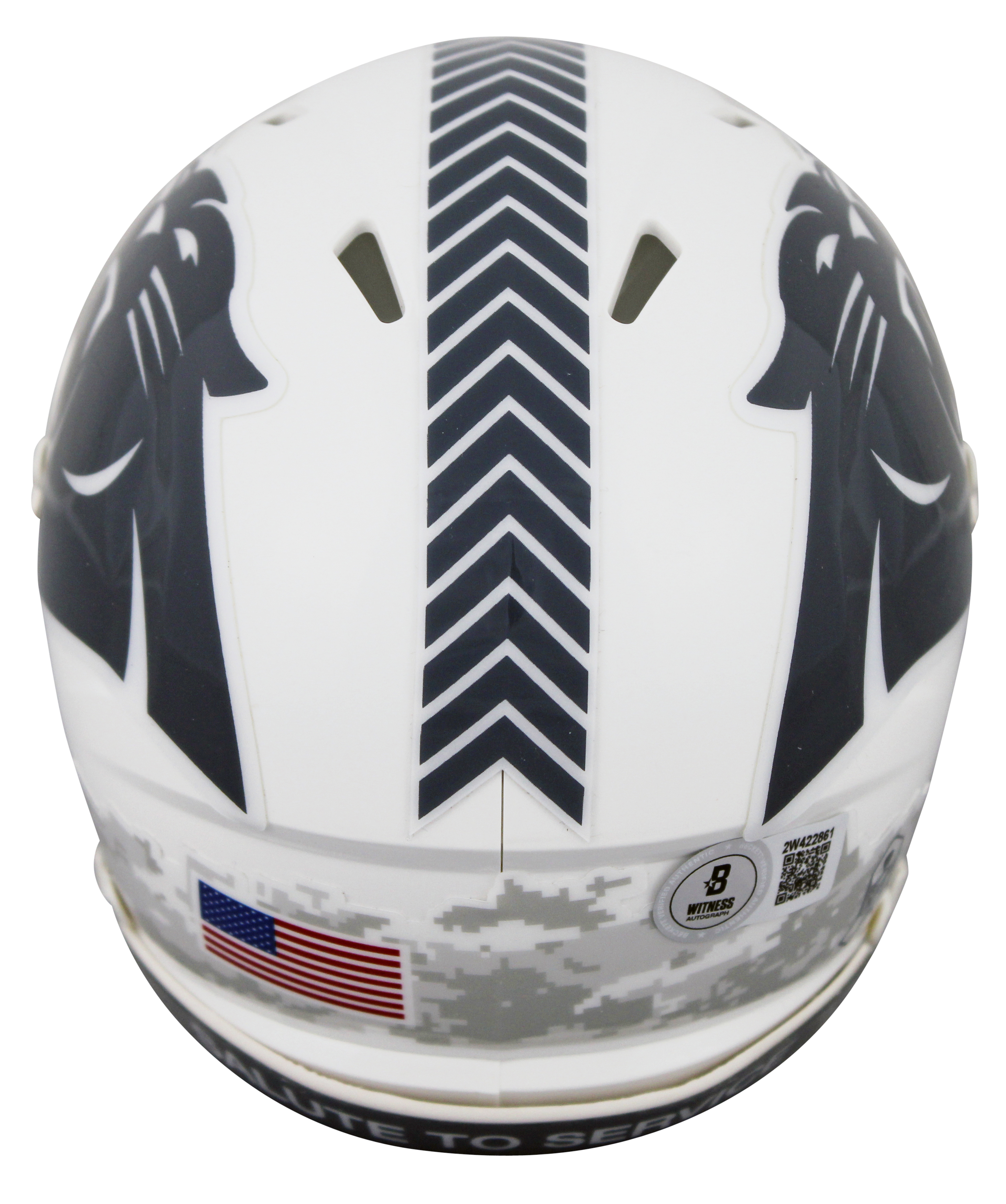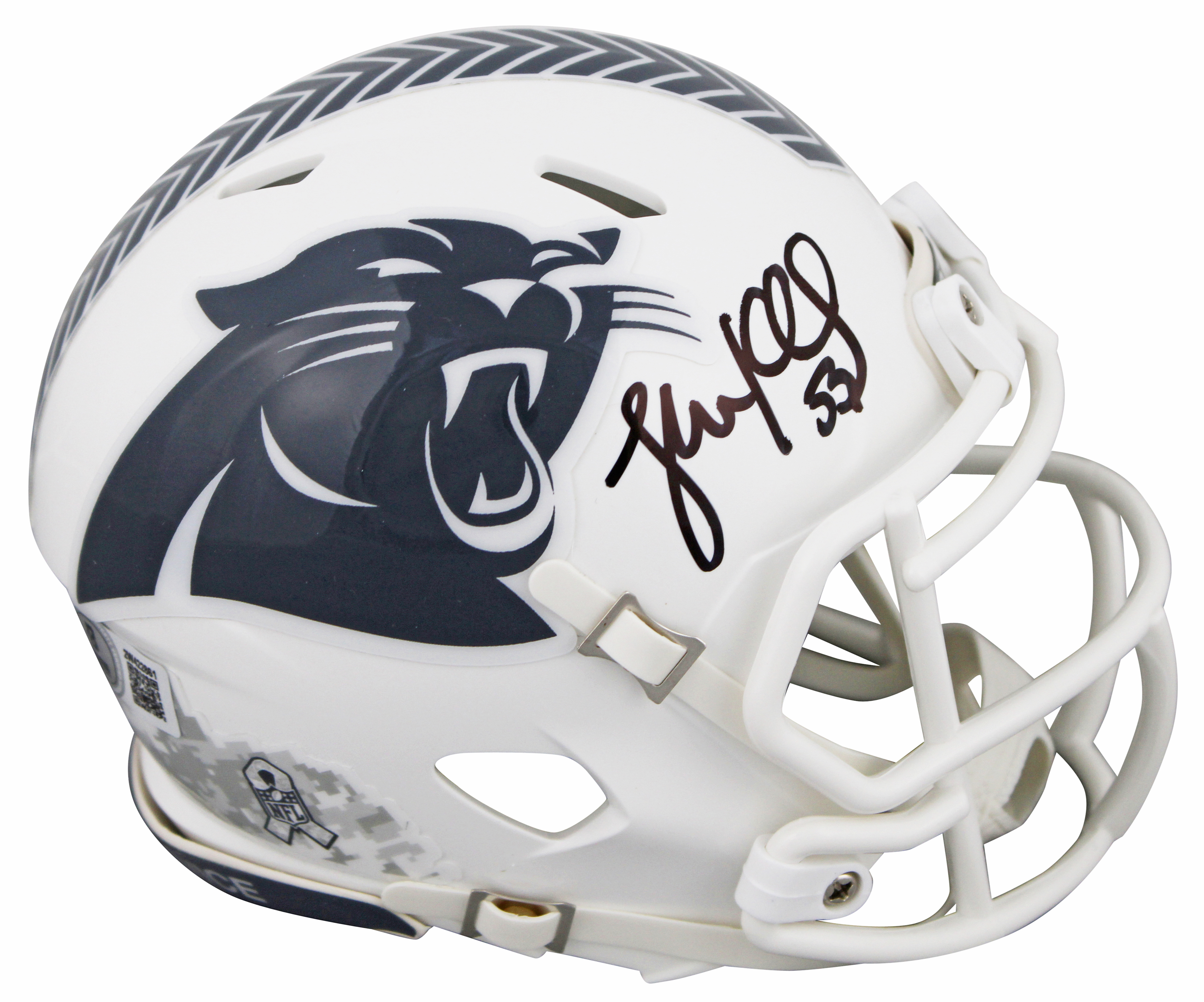 This Autographed Alternate 2024 Salute To Service III Speed Mini Helmet W/ Uv Mirrored Back Acrylic Display Case has been Personally Signed by Luke Kuechly of the Carolina Panthers. This item is 100% Authentic to include a hologram by Beckett Authentication Services. This item will come with an affixed Beckett Authentication Services (BAS) authentication sticker, which includes a scannable QR code to verify authenticity. Please note that Beckett no longer provides serial-numbered COA cards, and the attached BAS sticker will serve as the complete authentication for this item. This is a BAS Witnessed Protection Program item which means a Beckett Authentication Service representative was present when this item was being signed. We conducted an autograph signing with Luke Kuechly where multiples of the same item were signed. While the photographs are representative of this item, the size, placement and strength of the signature may vary. Each item is hand signed, therefore, each autograph is unique. This item can be verified through BAS Witnessed.