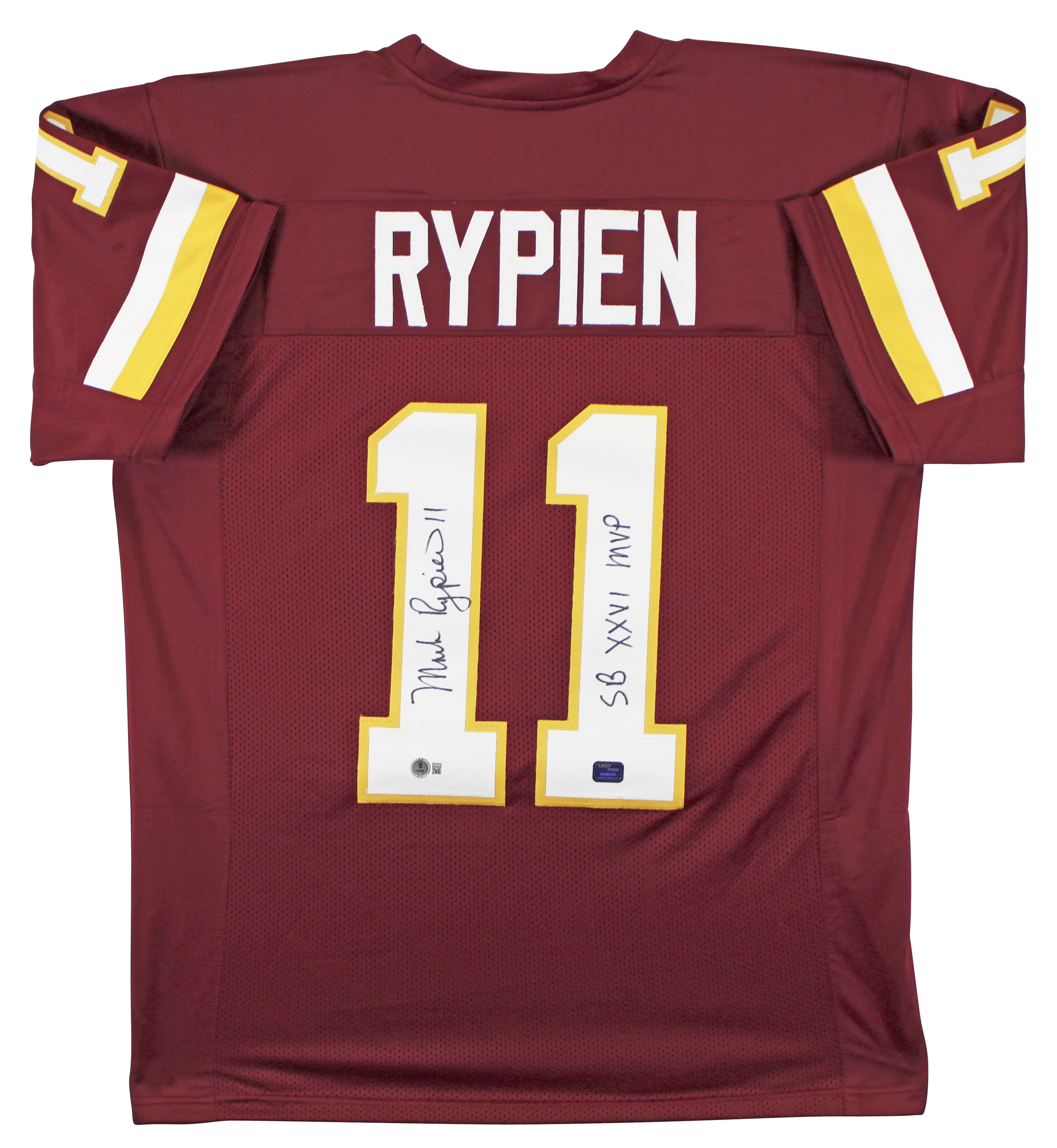 This Autographed Maroon Pro Style Jersey with the inscription of "SB XXVI MVP" has been Personally Signed by Mark Rypien of the Washington Commanders. This item is 100% Authentic to include a hologram by Beckett Authentication Services. This item will come with an affixed Beckett Authentication Services (BAS) authentication sticker, which includes a scannable QR code to verify authenticity. Please note that Beckett no longer provides serial-numbered COA cards, and the attached BAS sticker will serve as the complete authentication for this item. This is a BAS Witnessed Protection Program item which means a Beckett Authentication Service representative was present when this item was being signed. We conducted an autograph signing with Mark Rypien where multiples of the same item were signed. While the photographs are representative of this item, the size, placement and strength of the signature may vary. Each item is hand signed, therefore, each autograph is unique. This item can be verified through BAS Witnessed. This is a X-Large sized, non-branded, custom-stitched Jersey.
